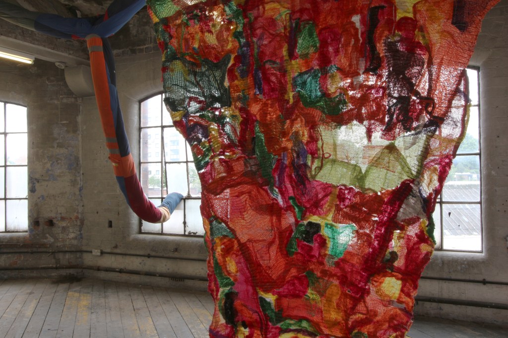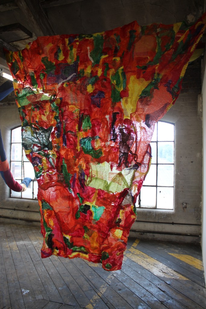 Network, Networth, nets, thread, supported by New Contemporaries, LondonVentilation, boiler suits, thread, sheeps’ fleece, supported by New Contemporaries, LondonSafety Gloves (green), glove, thread, plaster, dyes, supported by New Contemporaries, LondonSafety Gloves (red & white), glove, thread, plaster, dyes, supported by New Contemporaries, LondonSafety Gloves (blue), glove, thread, plaster, dyes, supported by New Contemporaries, London