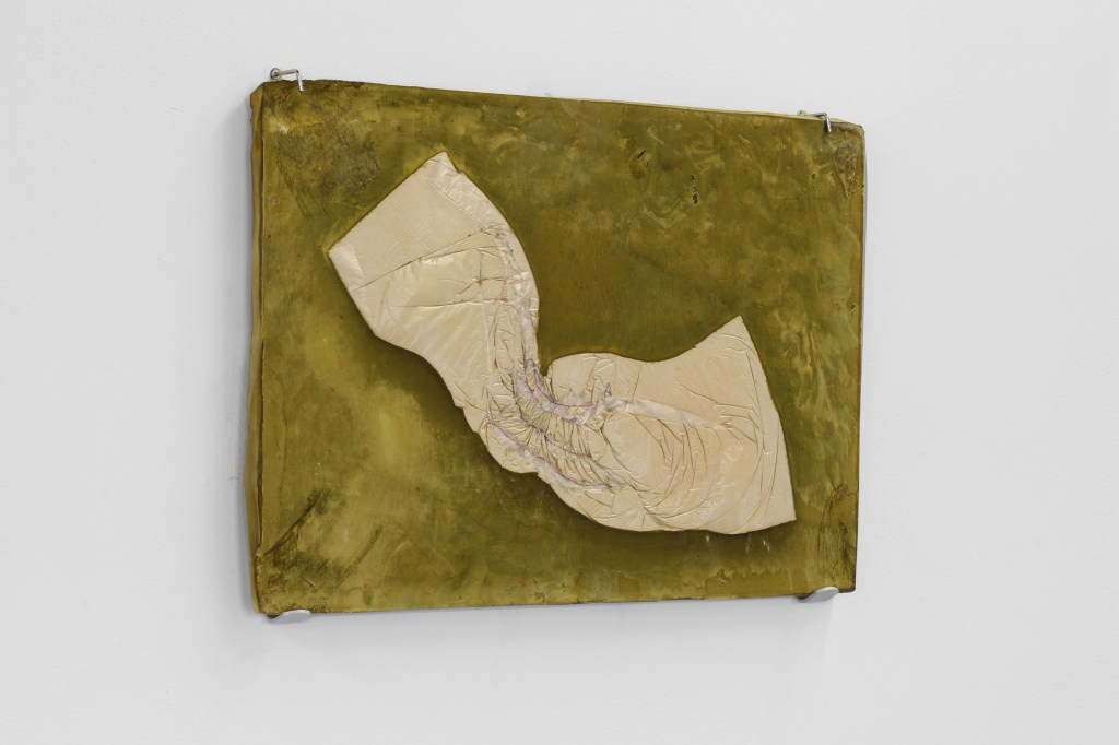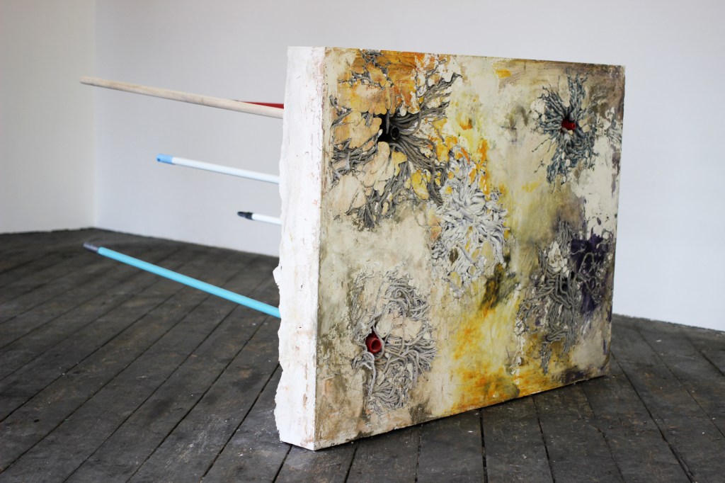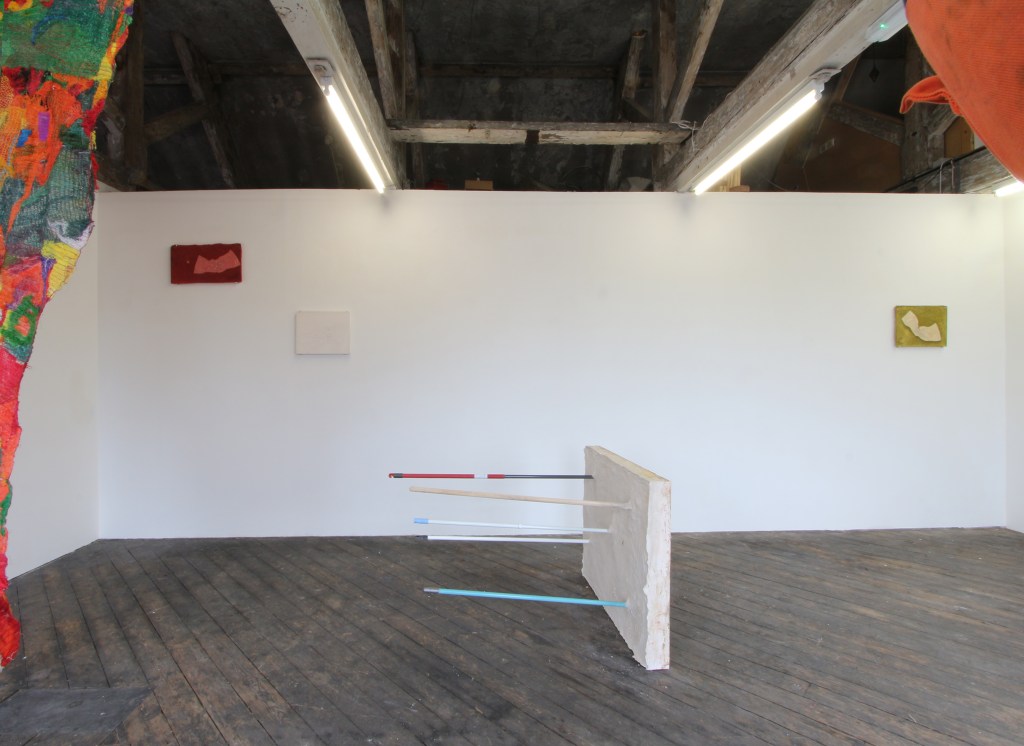 Sophie Giller: New Work, this show was installed at One Thoresby Street in Nottingham after the yearlong residency supported by New Contempories, London. Works above include Ventilation (left), boiler suits, thread, sheeps’ fleece & Network, Networth (right), nets, thread, July 2017. All photos by artist Oliver Tirré https://onethoresbystreet.org/sophie-giller-new-work/Work is what you make it (pt 2 Mops), mops, plaster, concrete, dyes, supported by New Contempories, London