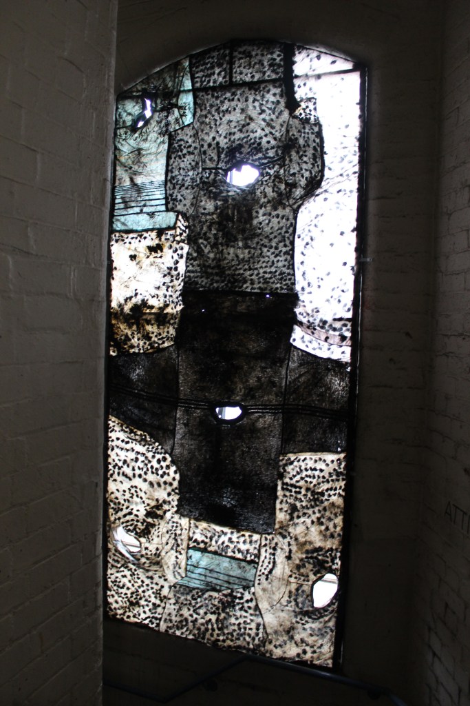 Stained Rag Window No.8, rags, thread & wax, Installed at Sophie Giller: New Work at One Thoresby Street Nottingham, July 2017, Thanks to Tyre Zone in Nottingham, supported by New Contemporaries, London