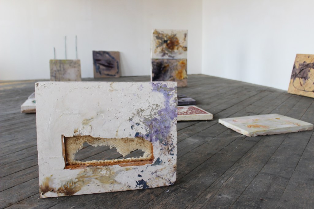 I don’t know what it is about casting that I find so addictive.. I think it’s maybe the speed of it, how quickly the material turns and transforms, forcing a pace and I’ve got to keep up with it. But once it’s done, it’s done and forced itself into the positive space of whatever I’ve put it into. I suppose that’s where my fixation of re-packing and preserving things comes into it, and there I am throwing all kinds of stuff into the mix and freezing solid lots of things that once were functional and moveable. So they become exercises in what form, what object to alter, what to pull into whichever frame or box. The items cast in these recent works are about work and activity. They are a mélange of gifts and waste by-products from other processes – from industrial to domestic; insects to animals.