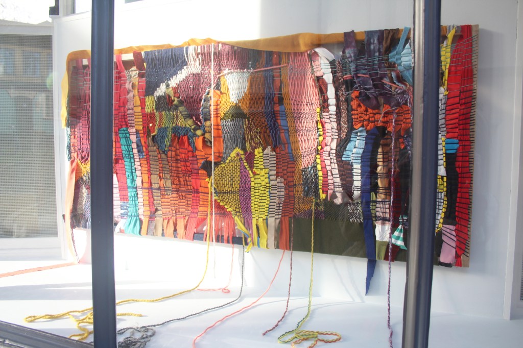 Both these works were made in South Norfolk, when the artist was on a break from her MA in Sculpture at the Royal College Art. The artist had previously experimented with weaving as a way of joining recycled textiles together. The earlier works often reused discarded items—remnants, leftovers, seconds, offcuts—collected by the artist, and emphasise process, labour, craft, and the social history of everyday materials.