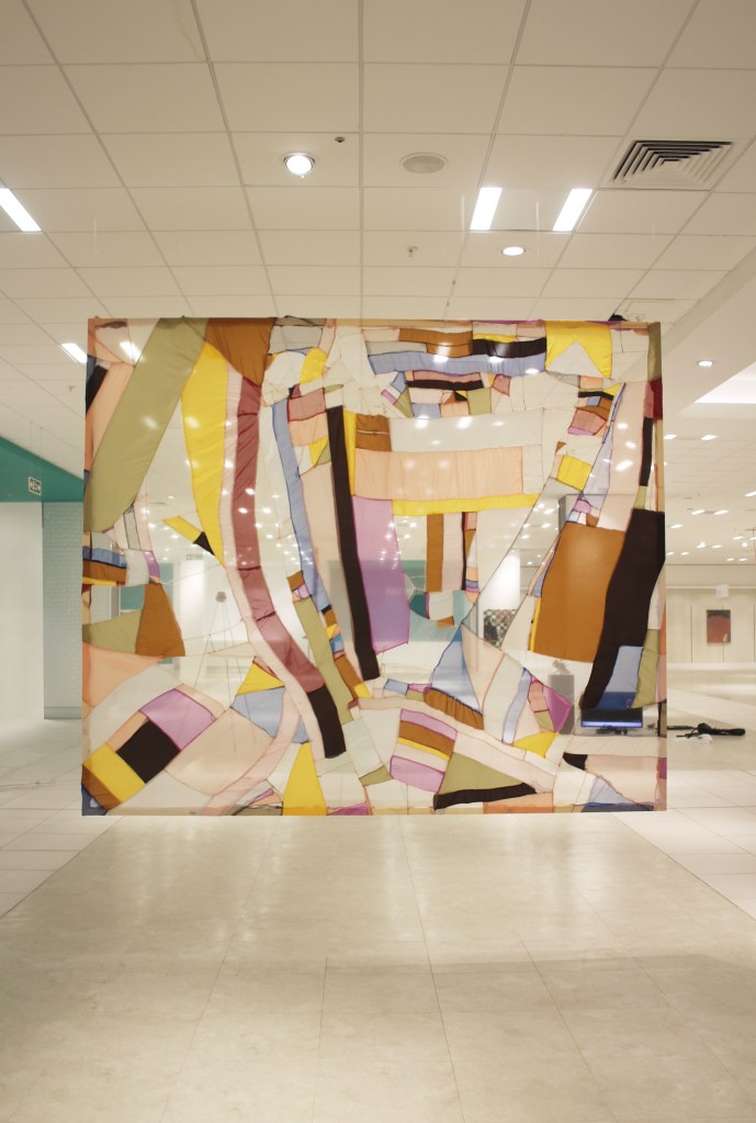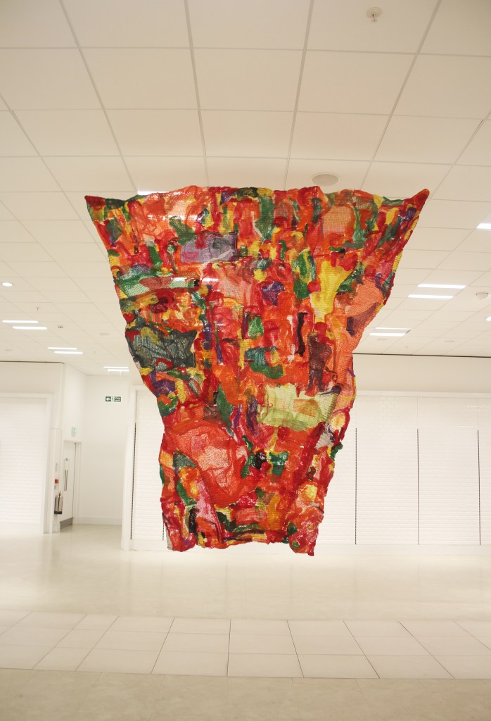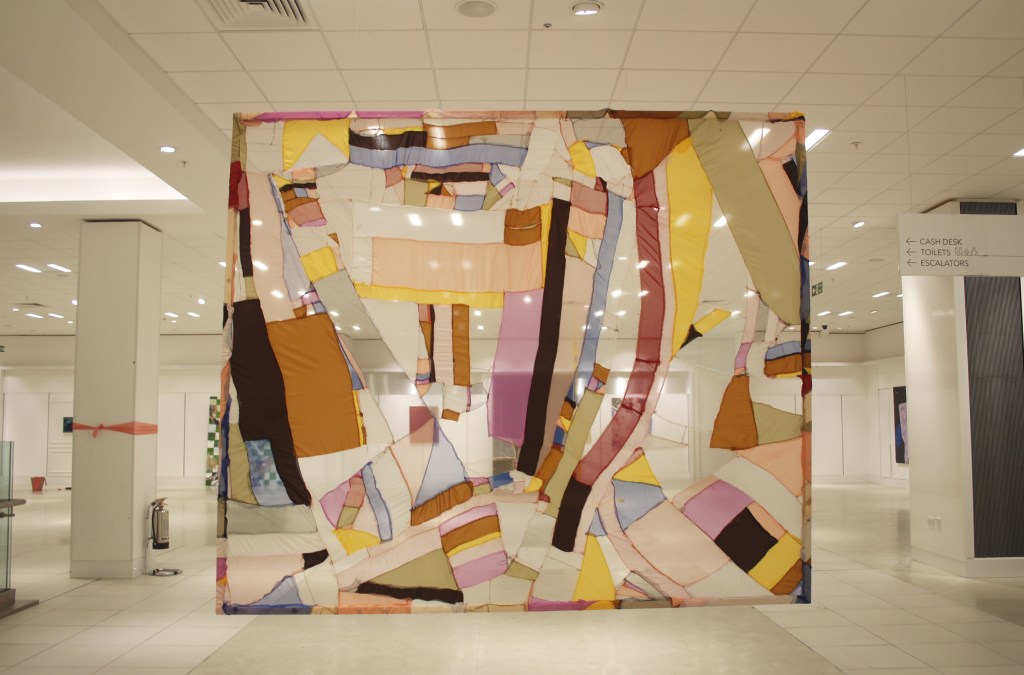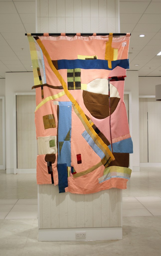 Wall of Stitches installed at AFTER HOURS group exhibition, in ex-Debenhams in Southside Shopping centre in Wandsworth, London, November 2020 – Jan 2021, curated by Cassandra Bowes, Anna Woodward, Bowes-Parris Gallery & The Artist’s Contemporary. Above photo courtesy of Bowes-Parris gallery with thanks.