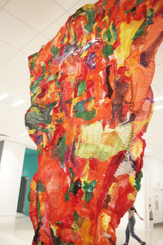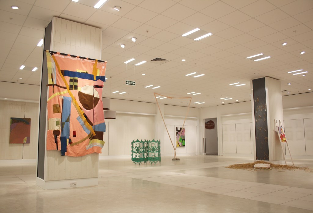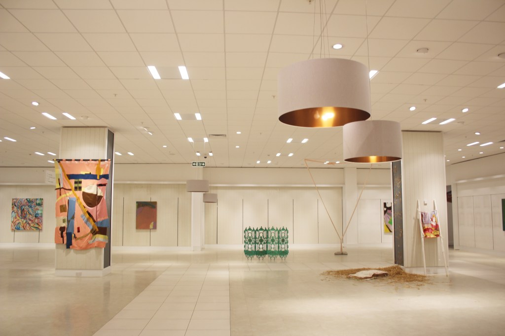 The former shopping centre has been transformed into a space that is filled with varied and diverse works, spanning genres, colours, texture and size. This has created an immersive environment where no two spaces are the same, from large-scale hanging weavings by Sophie Giller to a basketball court installation by Chris Cawkwell.