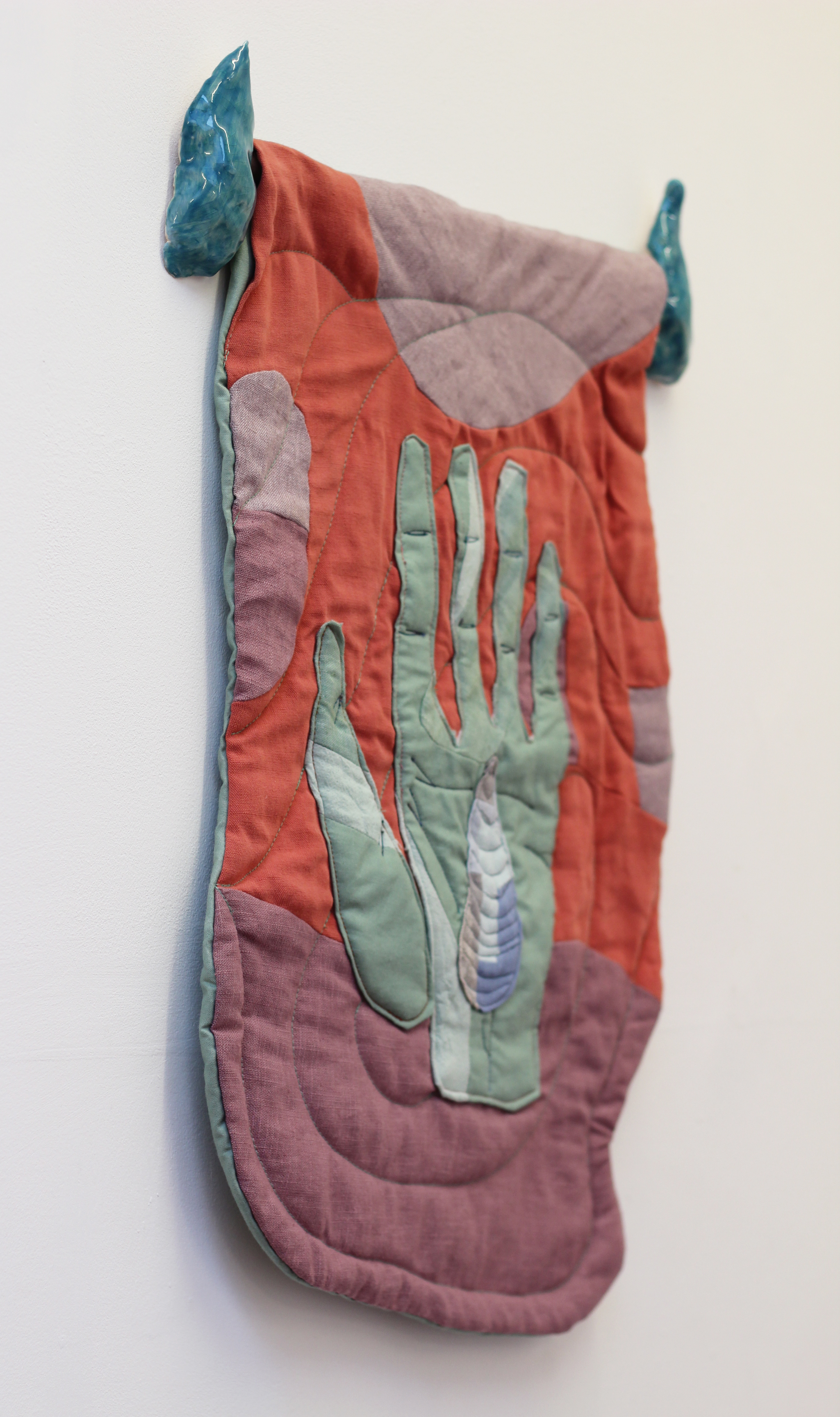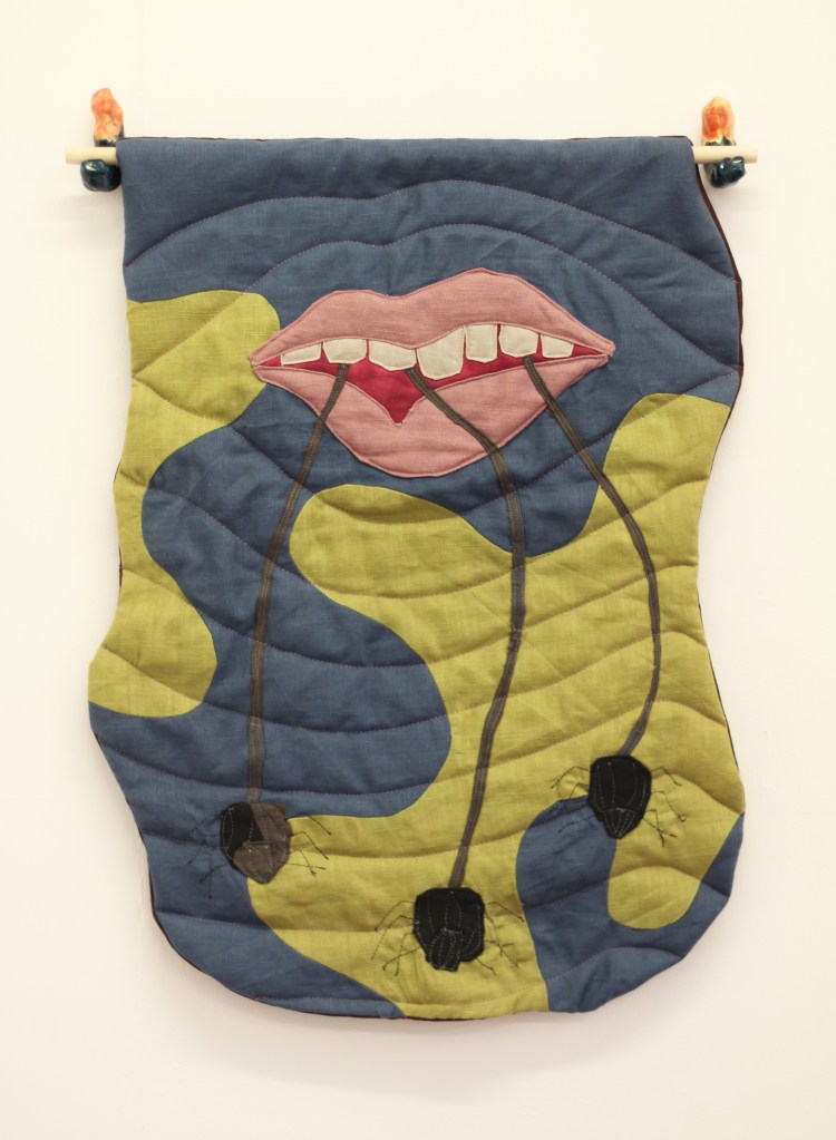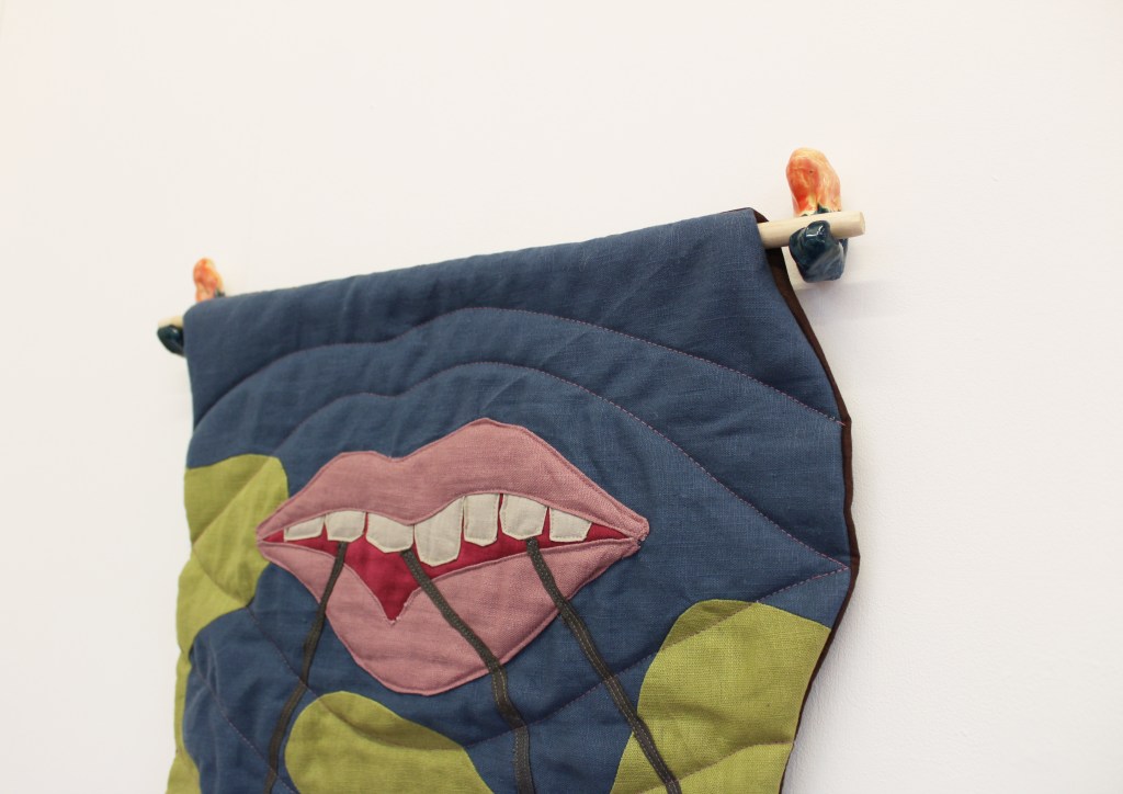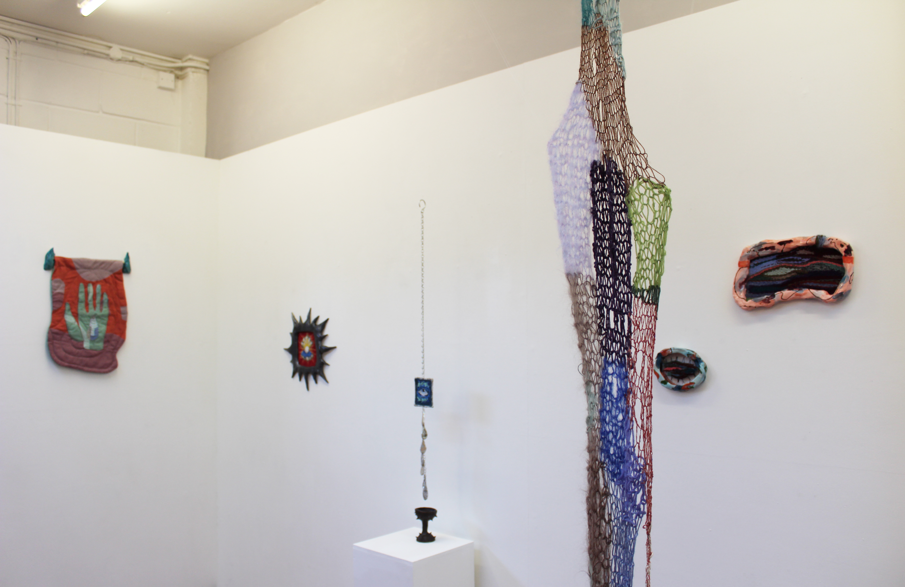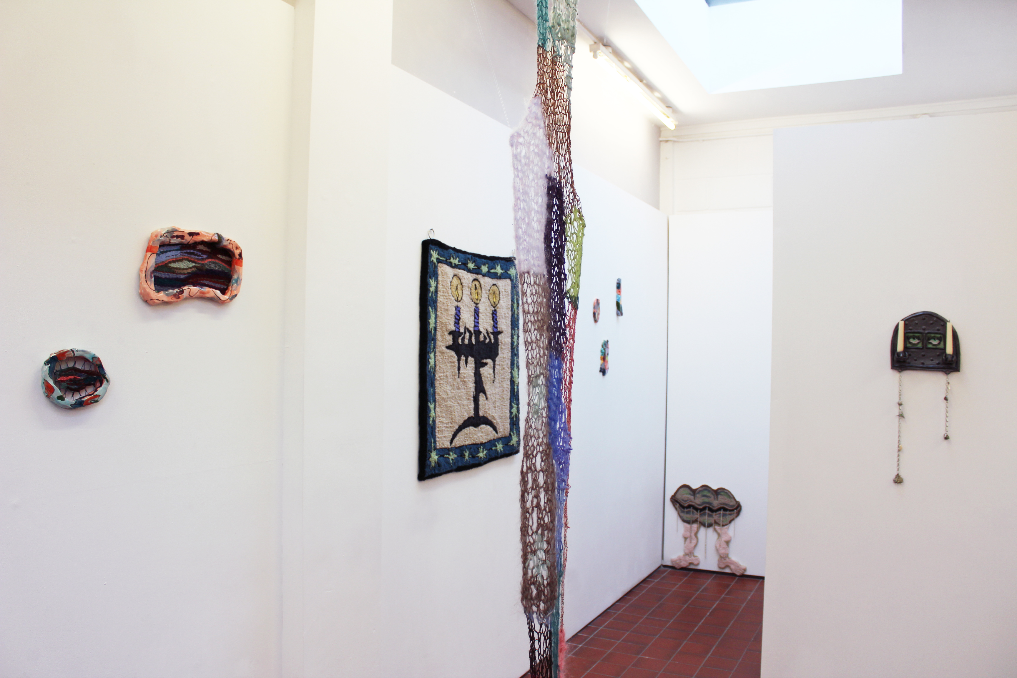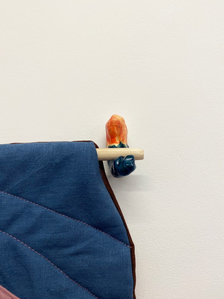 Wires ran like thread lines is a collaborative show by Sophie Giller and Faye Rita Robinson, exploring materiality, emotion, dreams, and craft through different processes including tufting, sewing, ceramics, latch-hook, quilting, dyeing, and metalwork.