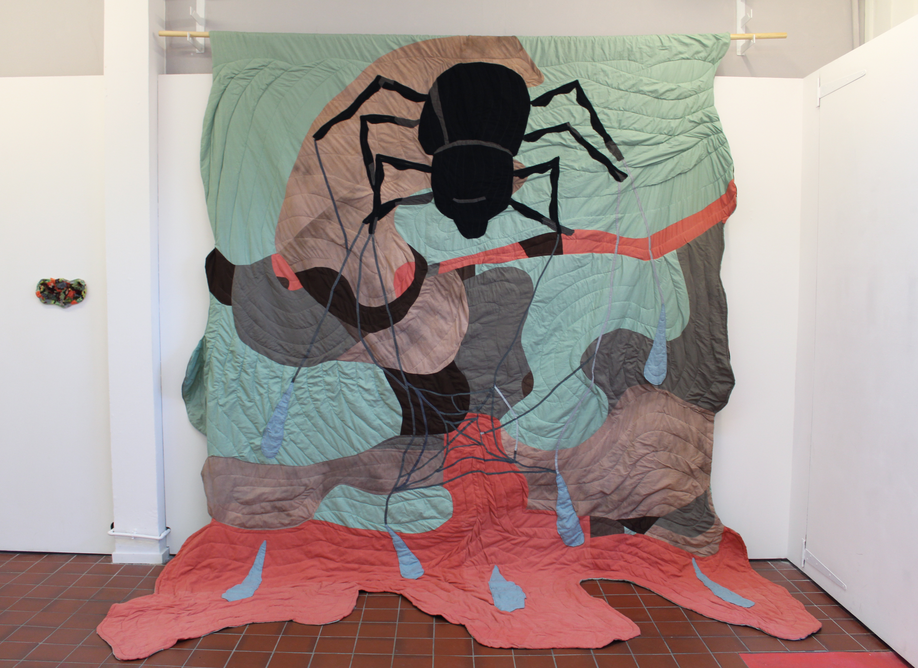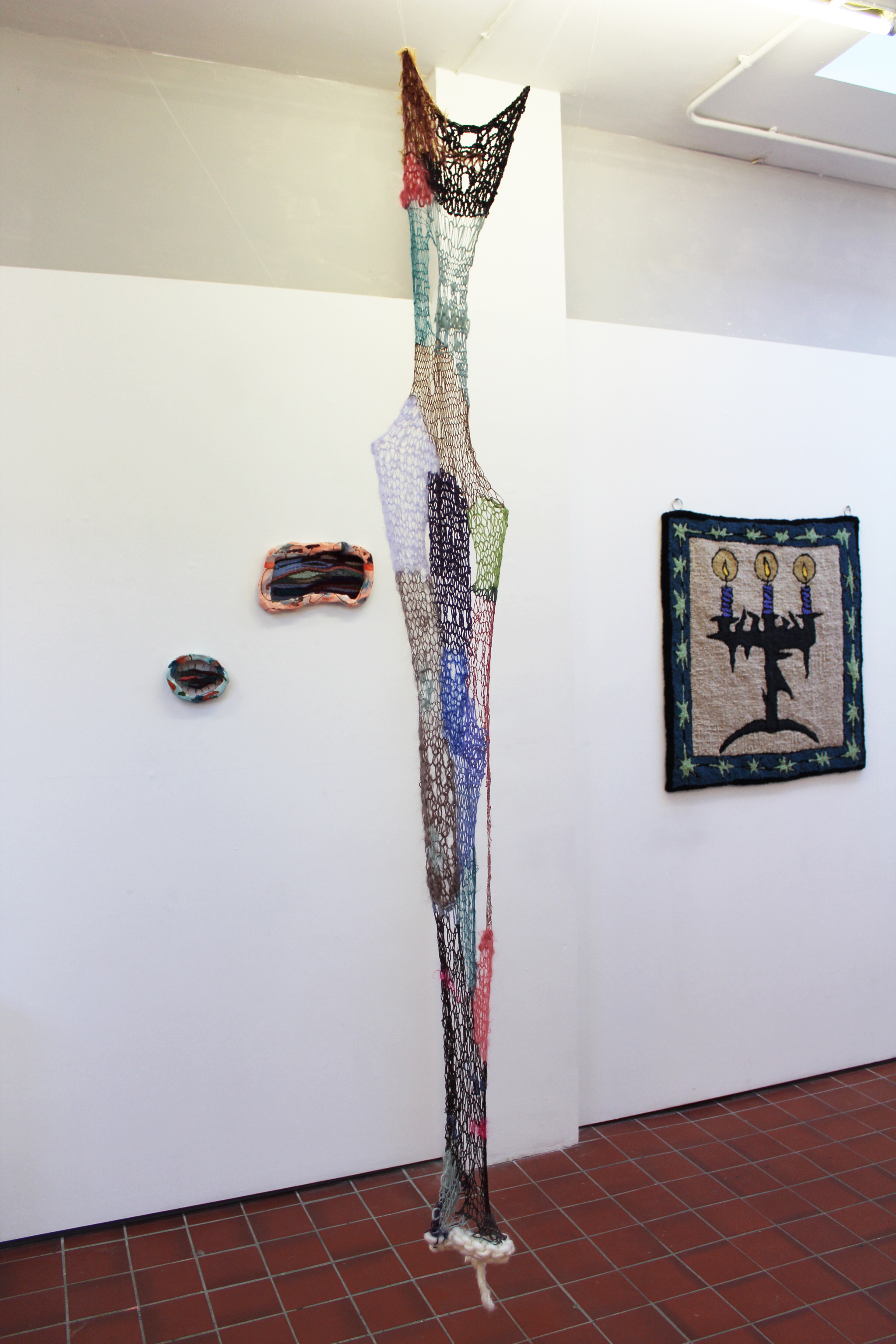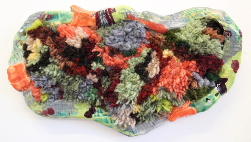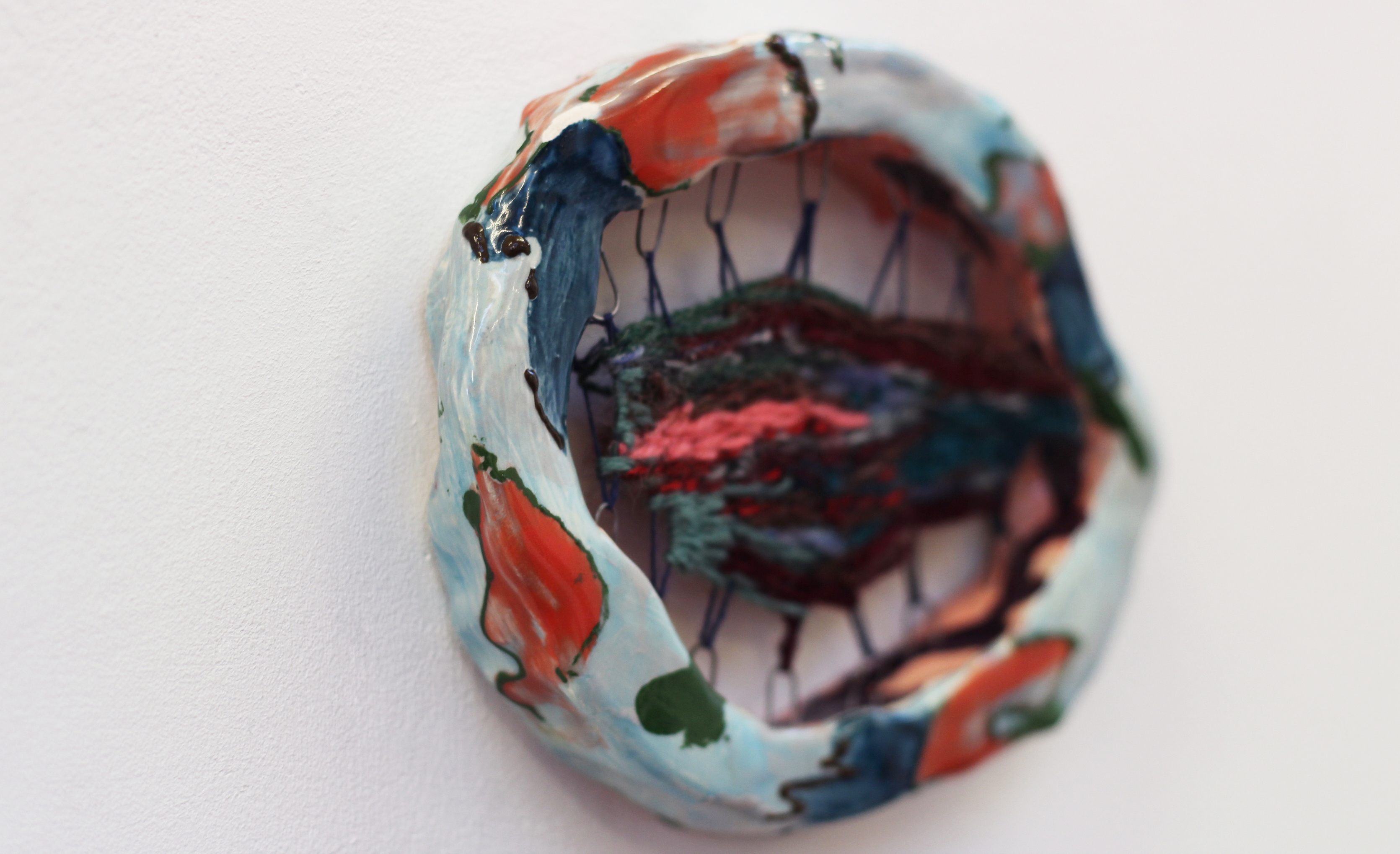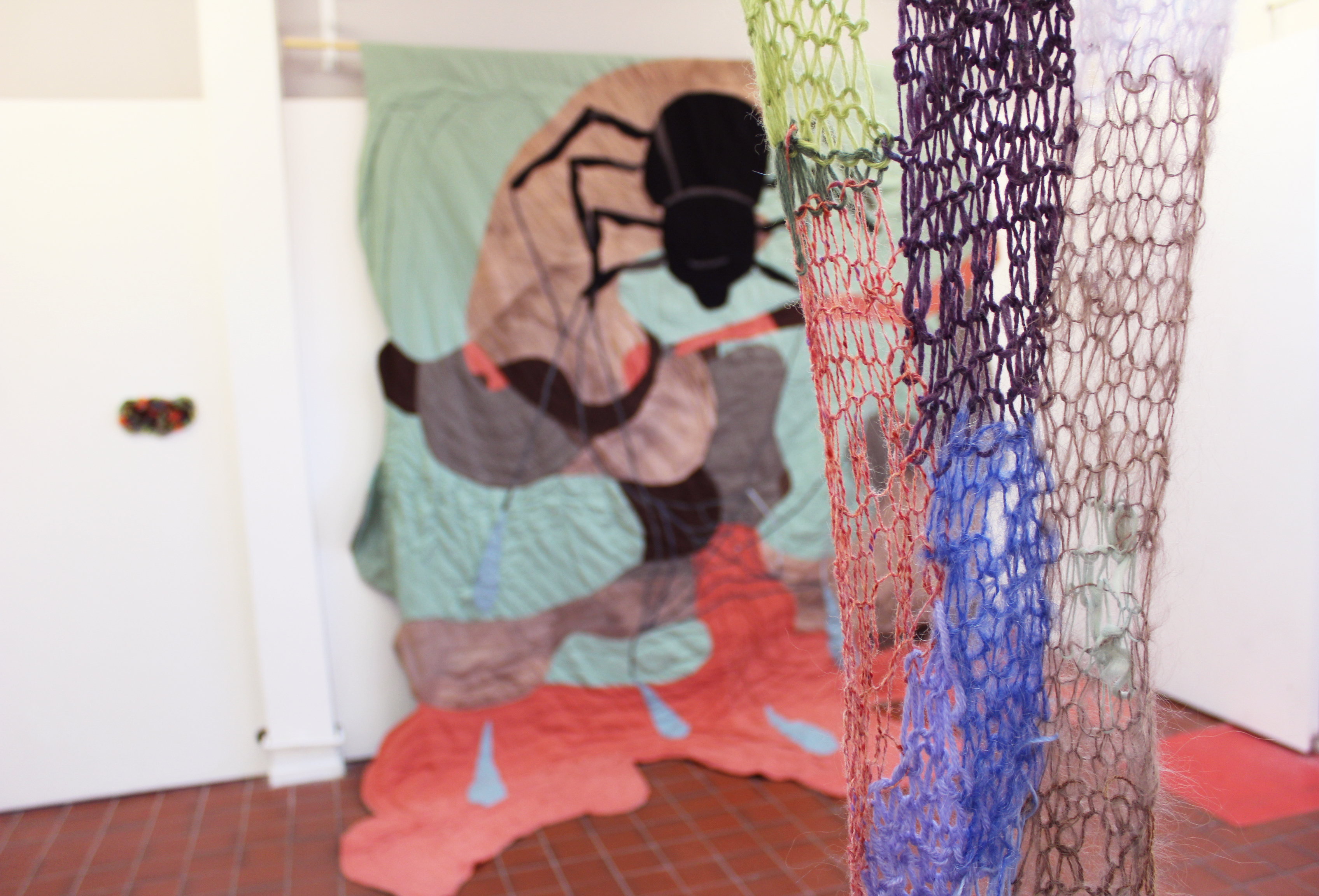 Wires ran like thread lines is a collaborative show by Sophie Giller and Faye Rita Robinson, exploring materiality, emotion, dreams, and craft through different processes including tufting, sewing, ceramics, latch-hook, quilting, dyeing, and metalwork.