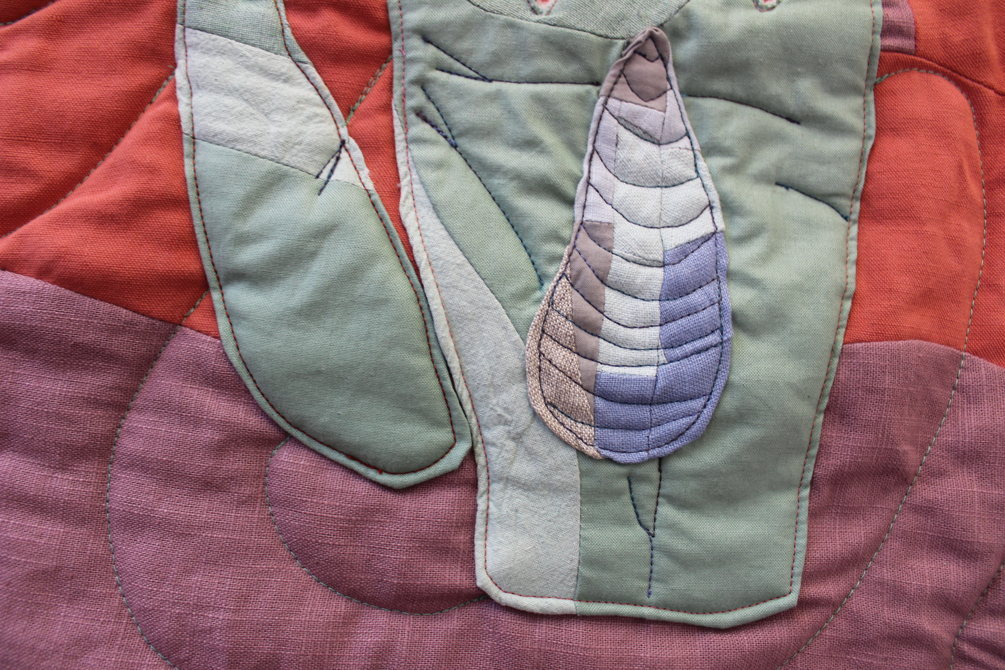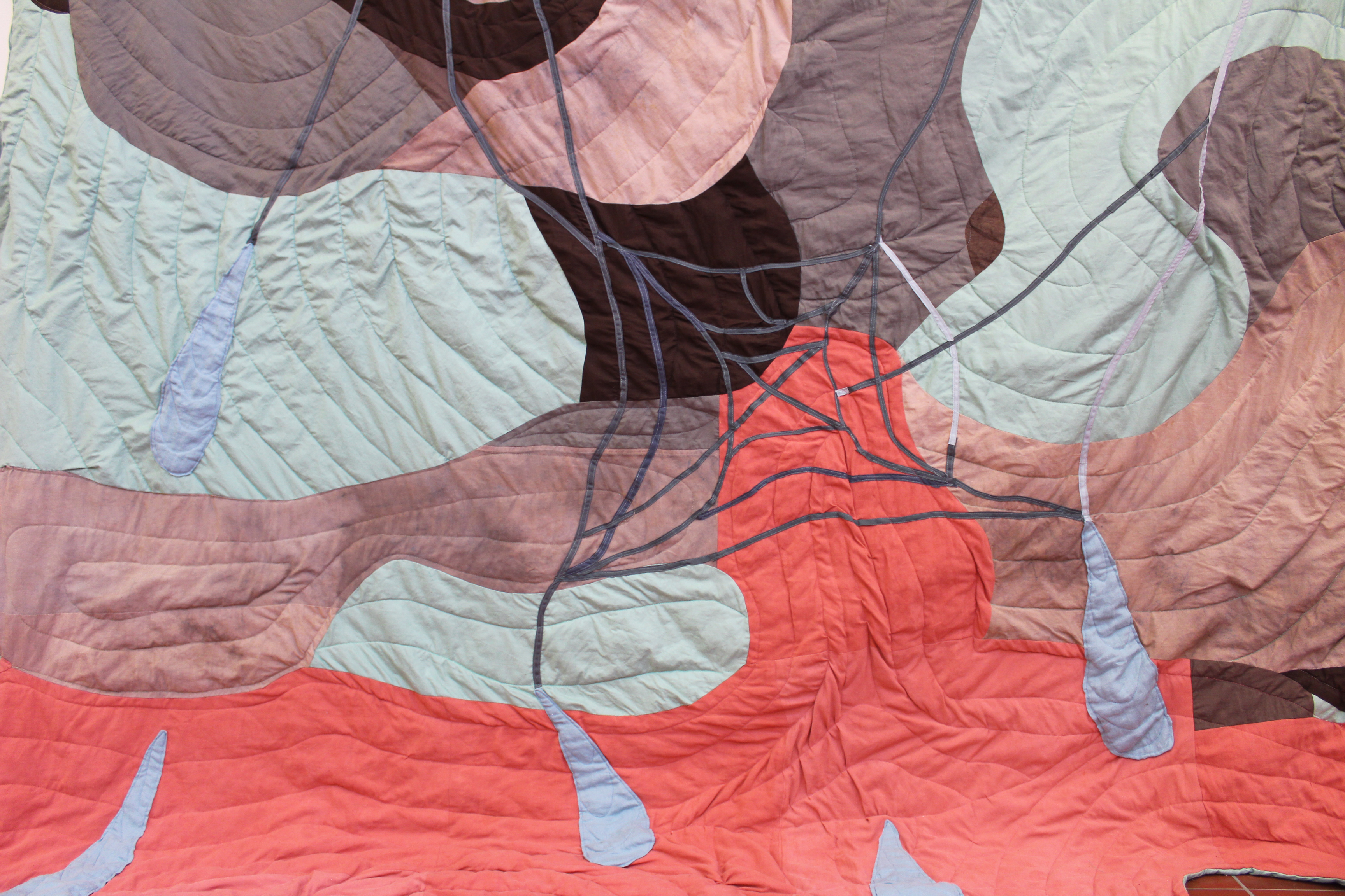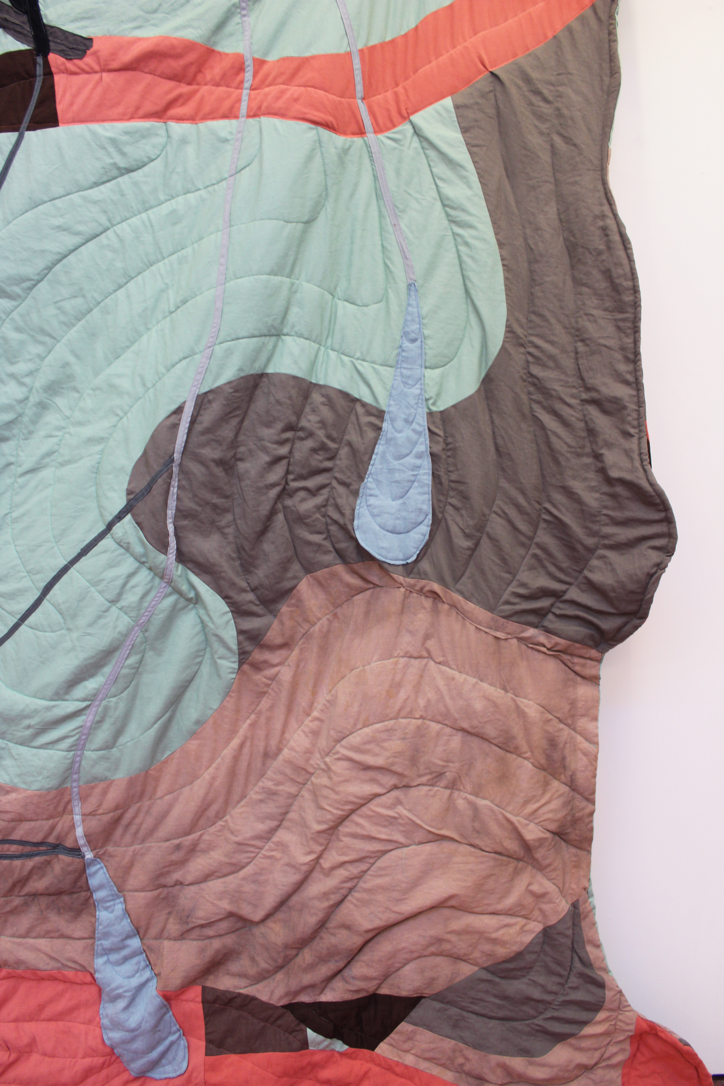 Above it all dripping, linen, direct dyes, reactive dyes, wadding, thread, salvaged fabrics, wood, Faye Rita Robinson & Sophie Giller Collaboration, work in top left image, far left, Those who dream of feasting wake to lamentations, Faye Rita Robinson
