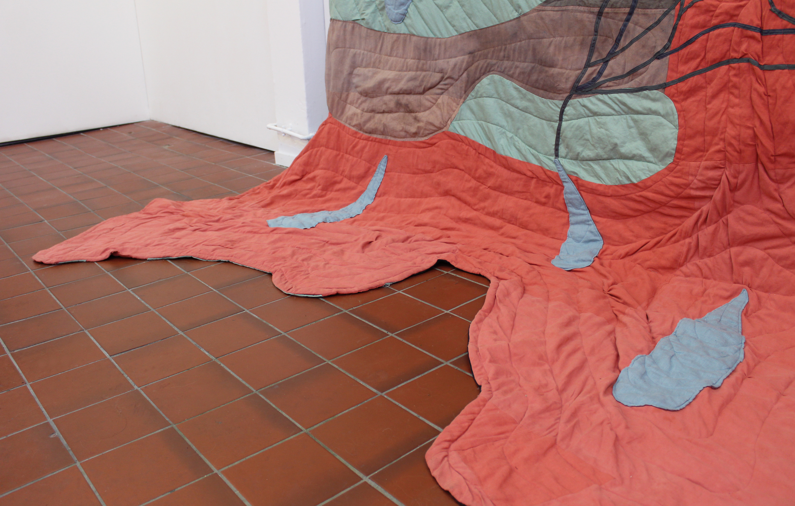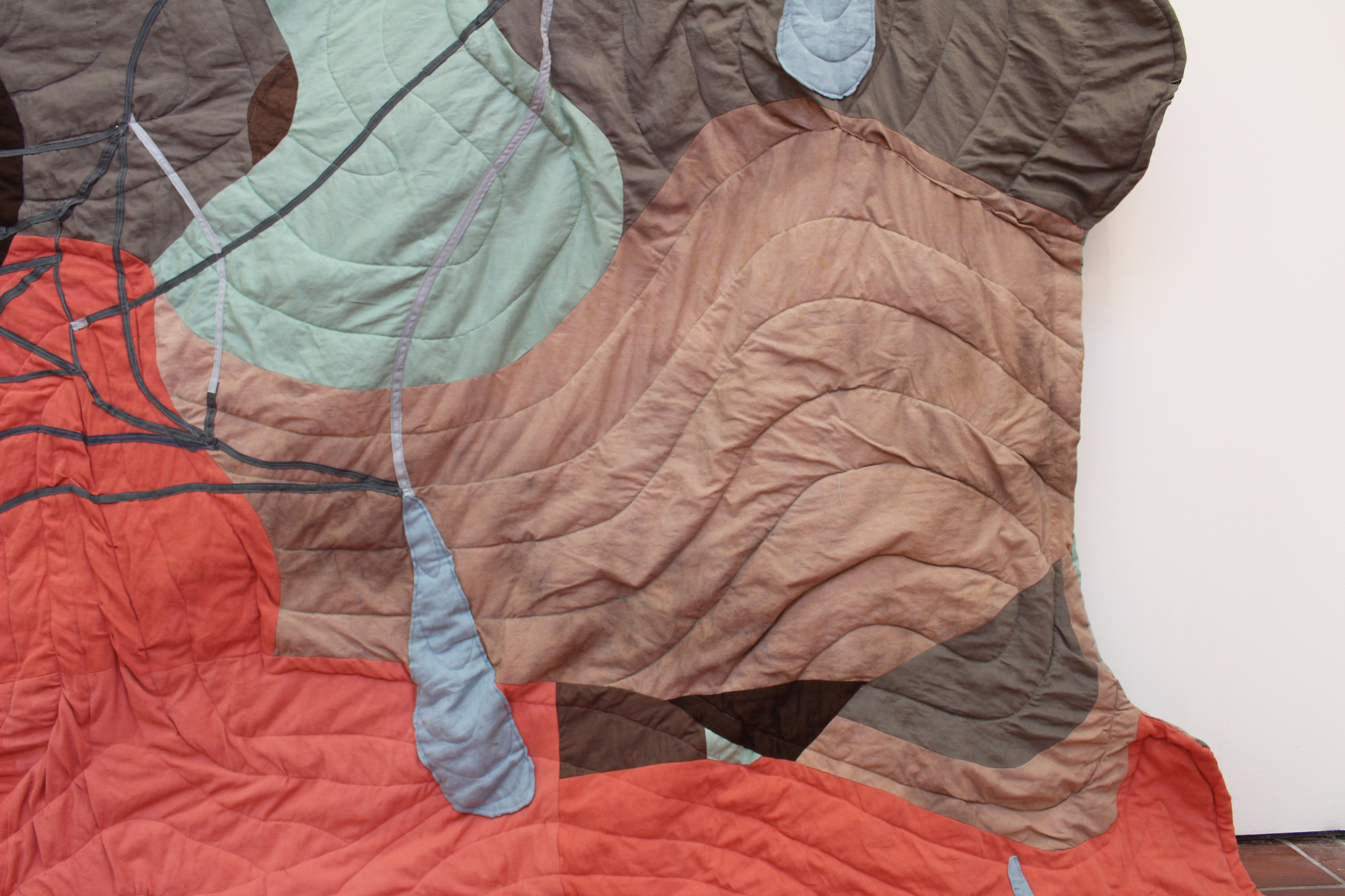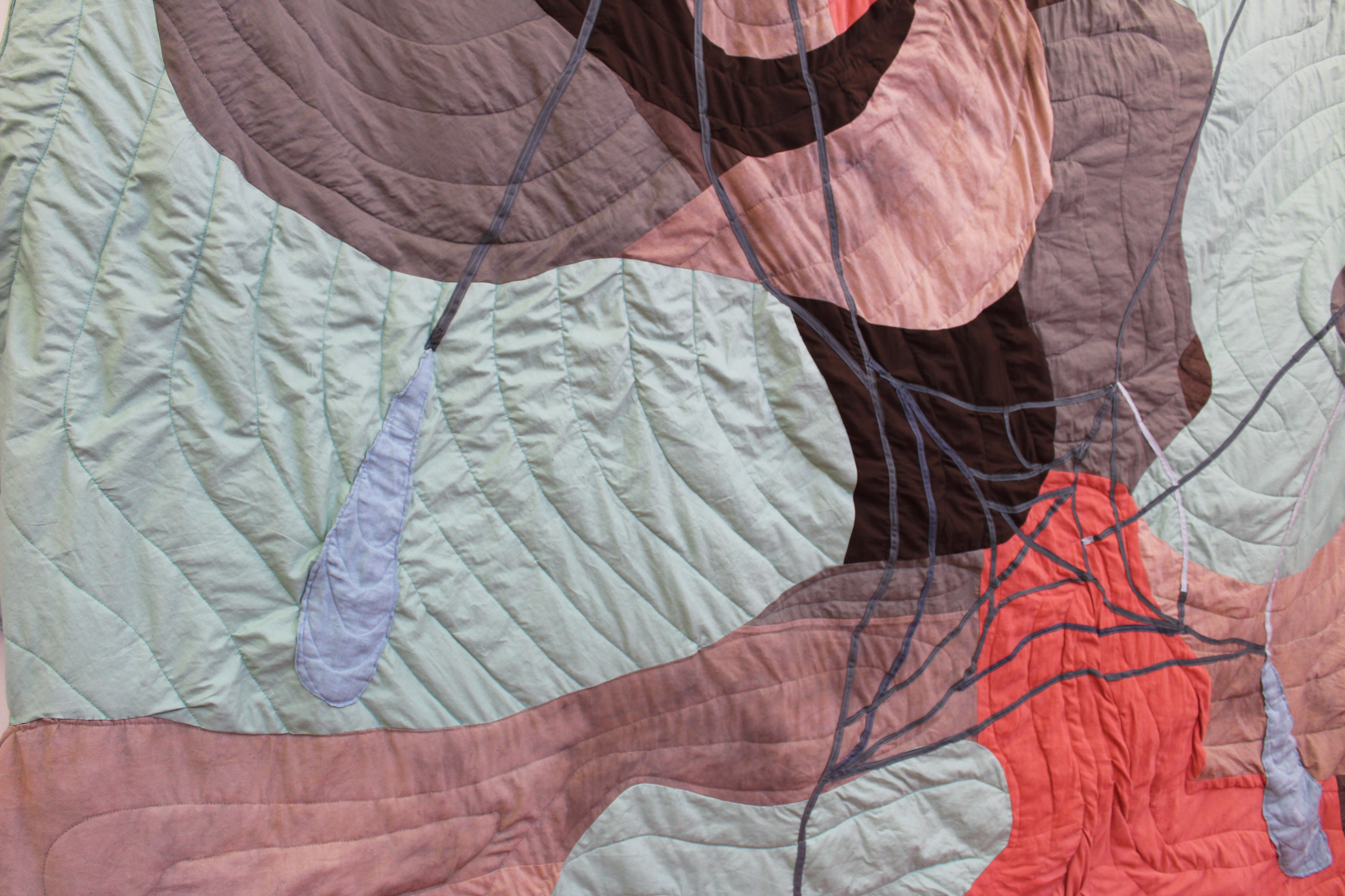 Above it all dripping, linen, direct dyes, reactive dyes, wadding, thread, salvaged fabrics, wood, Faye Rita Robinson & Sophie Giller Collaboration, work in top left image, far left, Those who dream of feasting wake to lamentations, Faye Rita Robinson