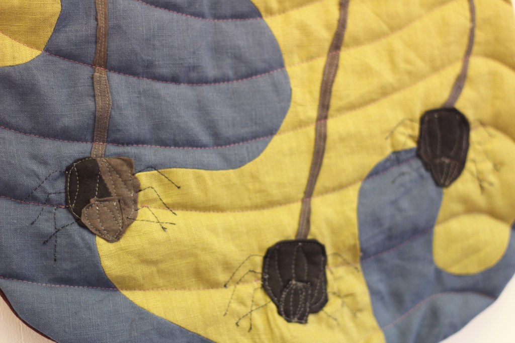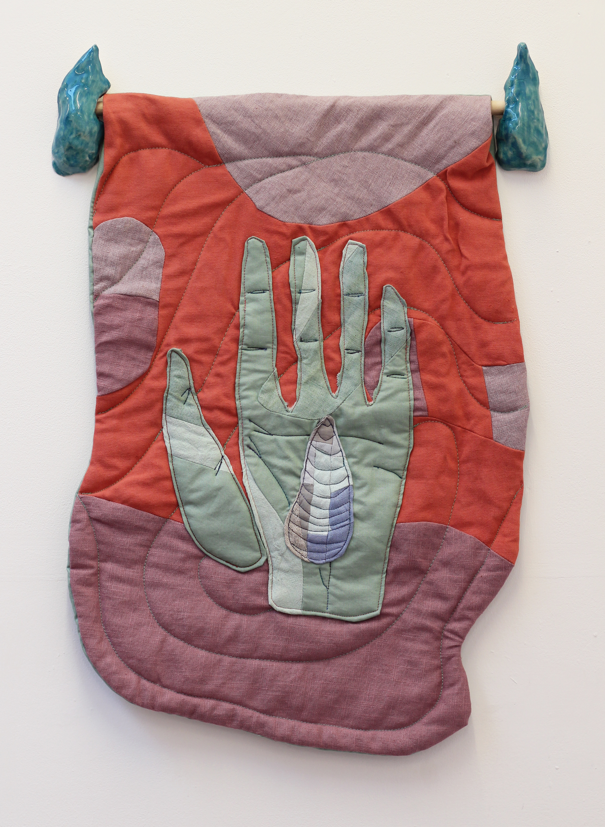 Hands loom waiting (above), They spun to her (below) linen, direct dyes, reactive dyes, wadding, thread, salvaged fabrics, glazed ceramic, wood, Faye Rita Robinson & Sophie Giller collaborative mini quilts (Image below bottom left thanks to Bethany Houlihan, Lot Projects)