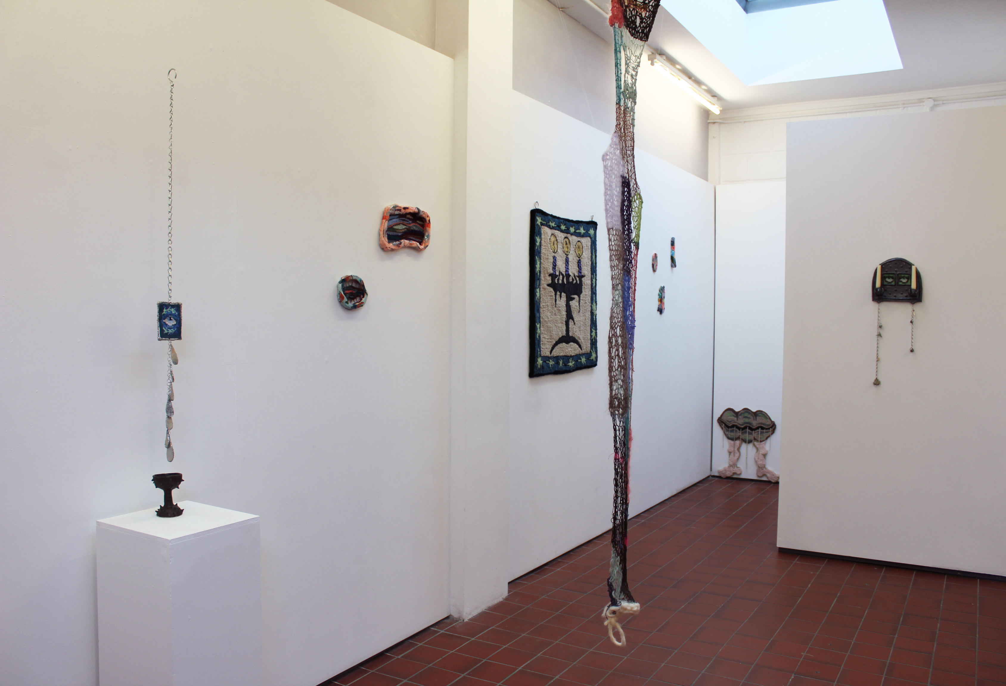 Above left, Install shot, work pictured from left, Faye Rita Robinson, suspended by friction, Sophie Giller Don’t you try (mouth loom), You’ll find it & knitweb, Faye Rita Robinson, Candelabra, Sophie Giller, Gift giving, Try again, Liquid Hard, Faye Rita Robinson, The horror of revelation, Those who dream of feasting wake to lamentations, above right, Sophie Giller