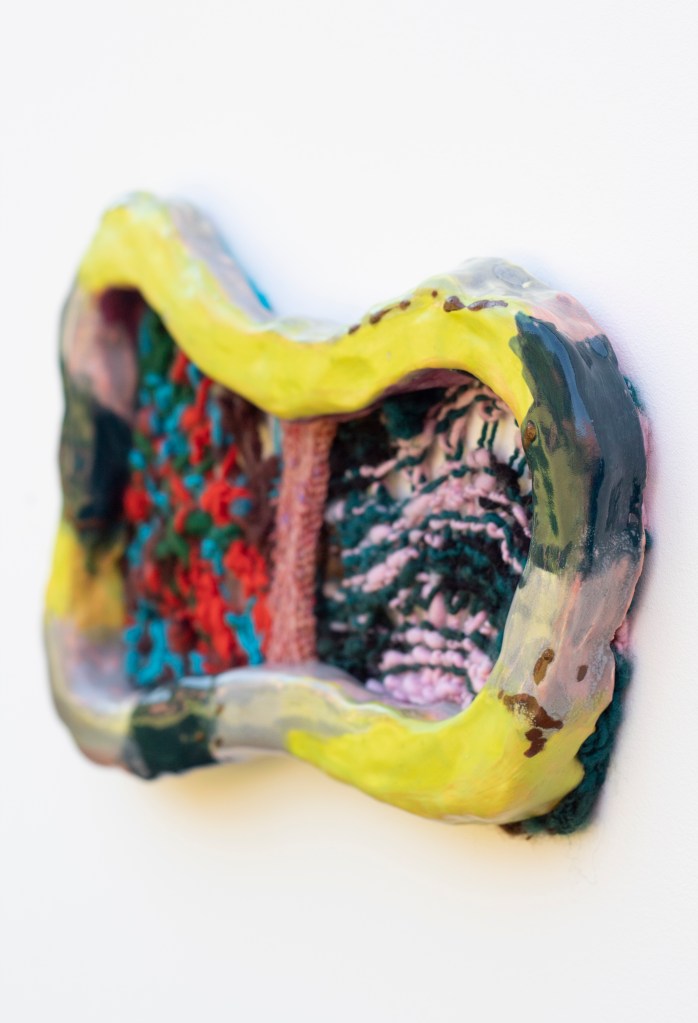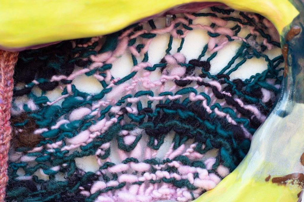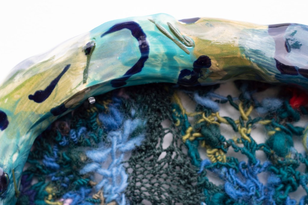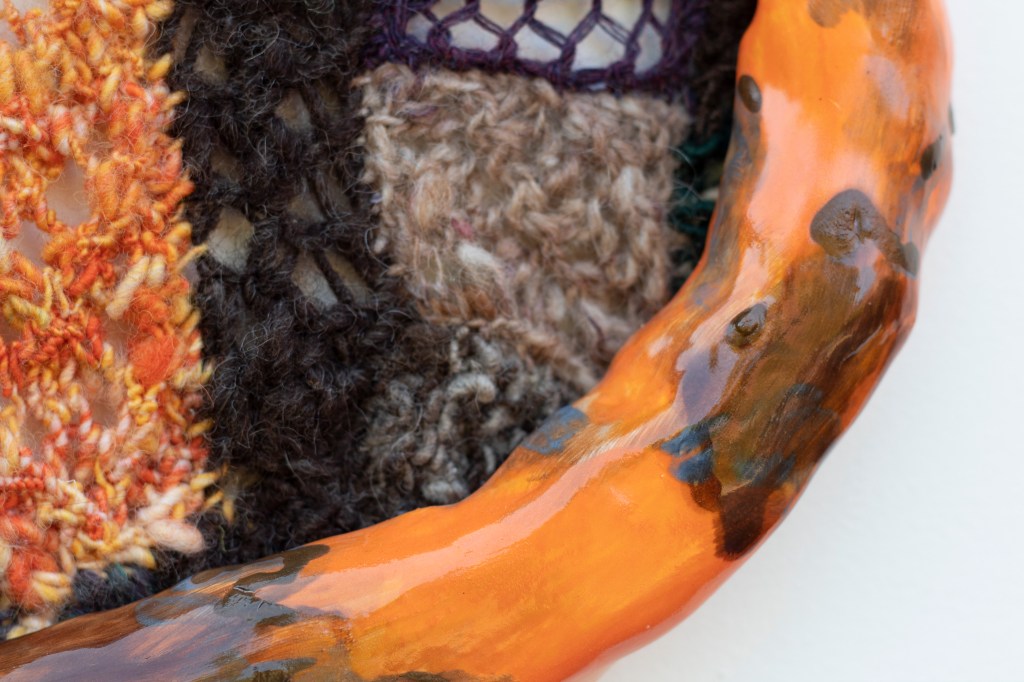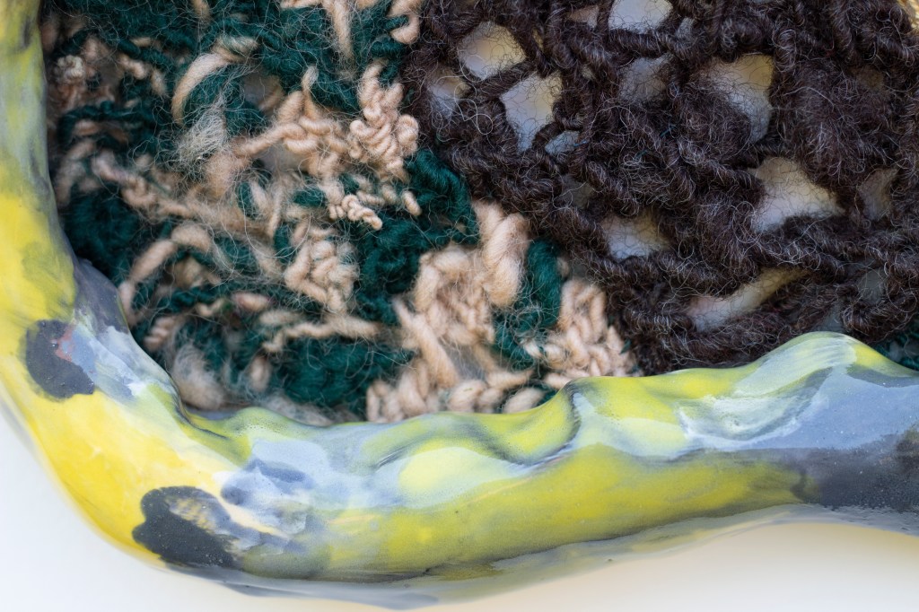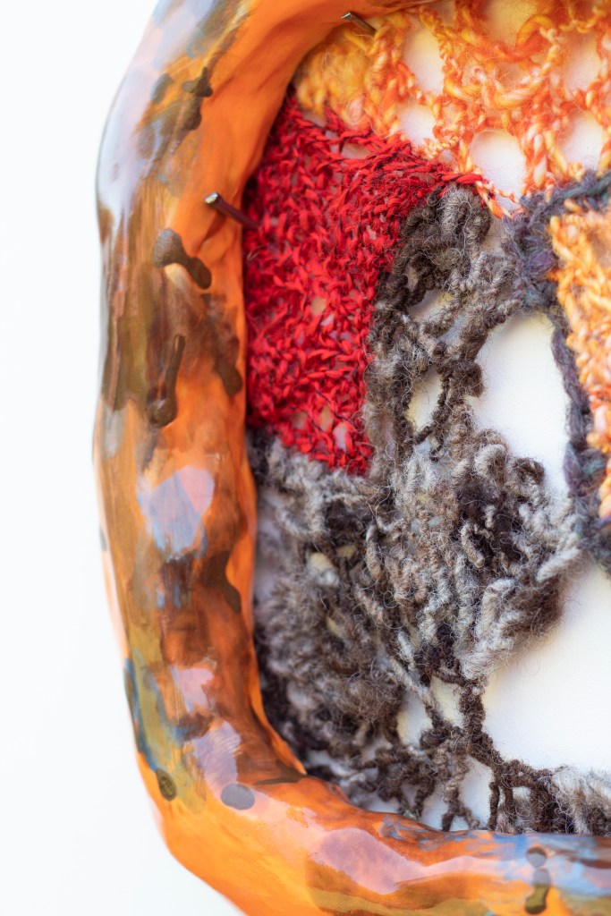Half in the moment Glazed ceramic, homespun wool, mixed wool, embroidery thread, glue, nails, September 2023