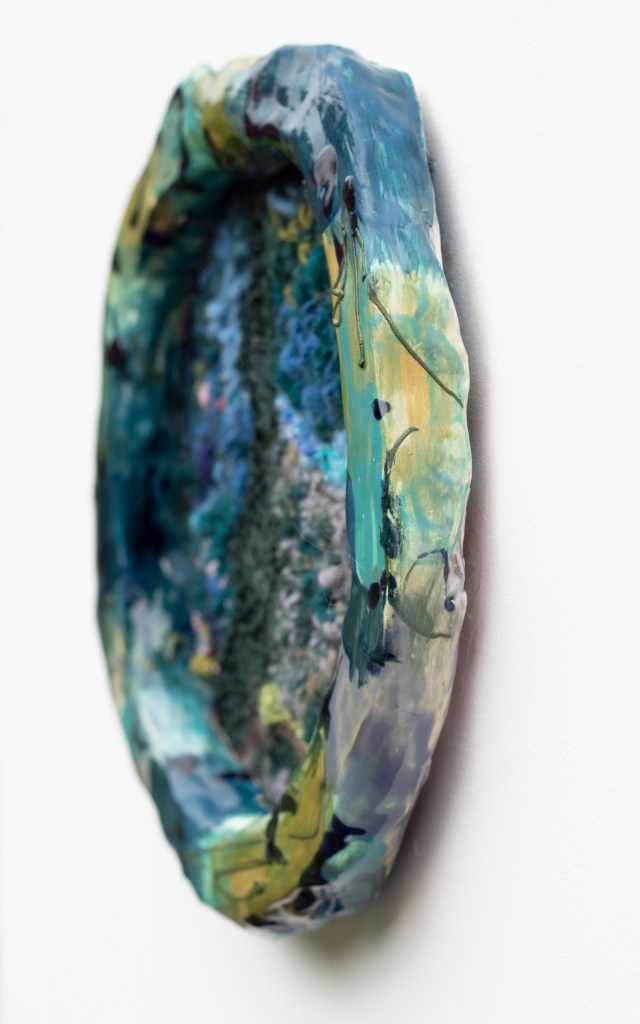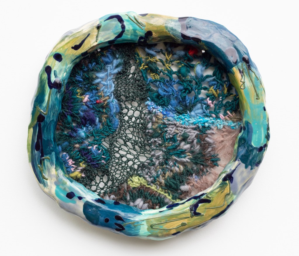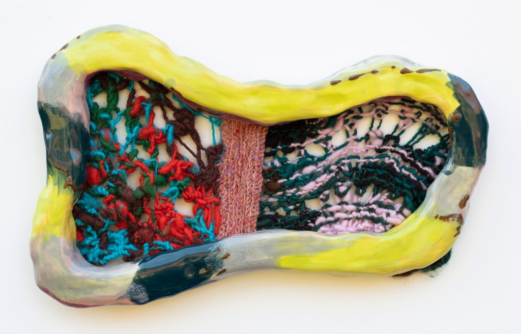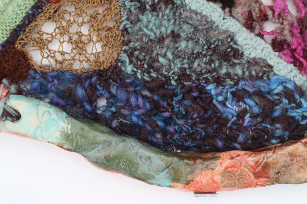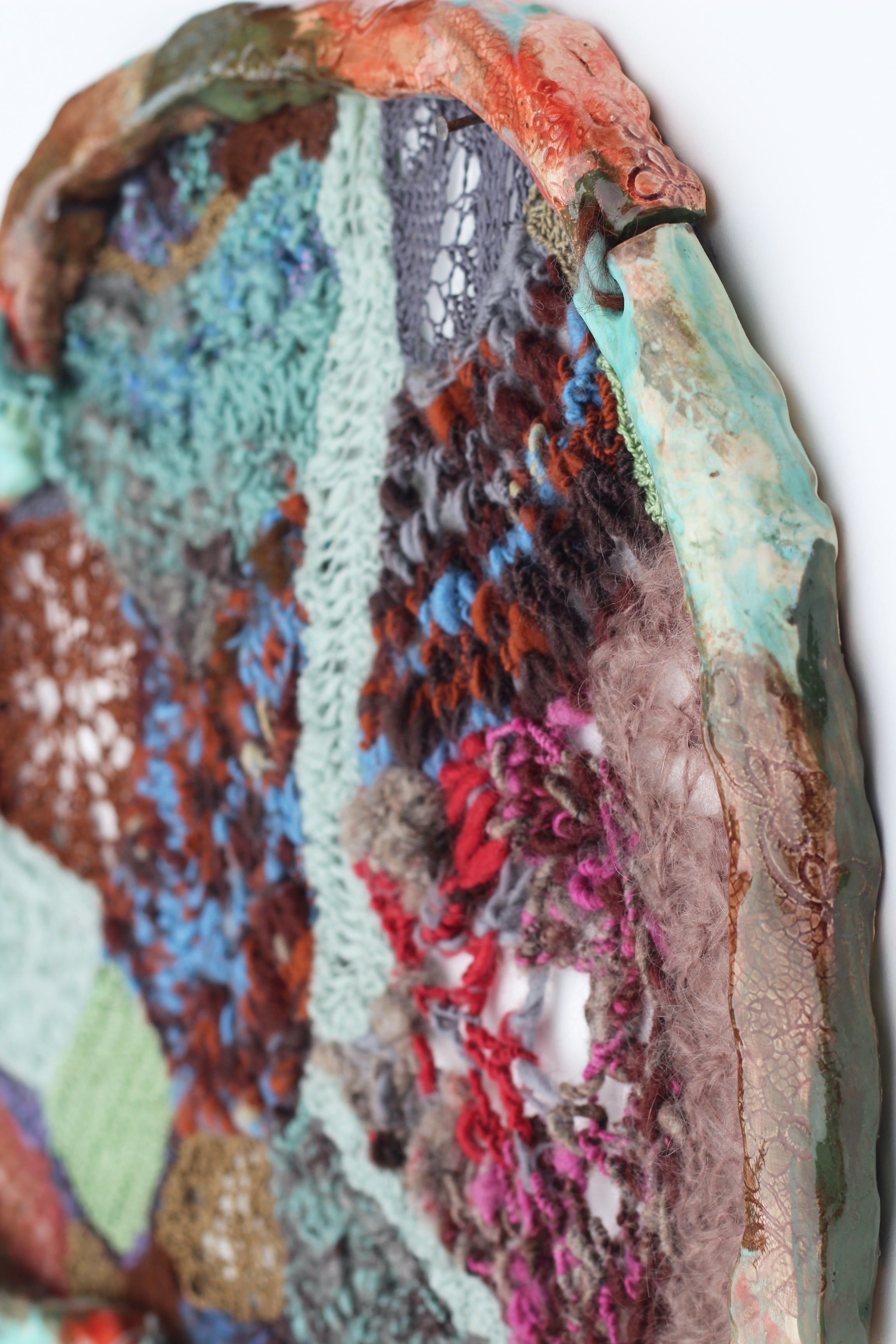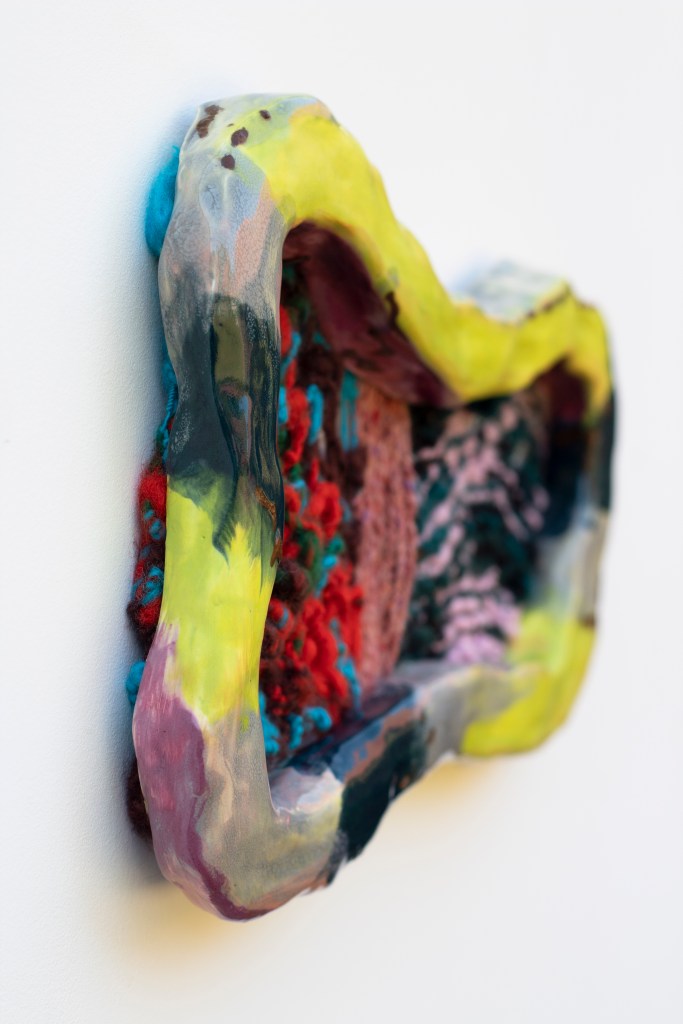 Half in the moment Glazed ceramic, homespun wool, mixed wool, embroidery thread, glue, nails, September 2023