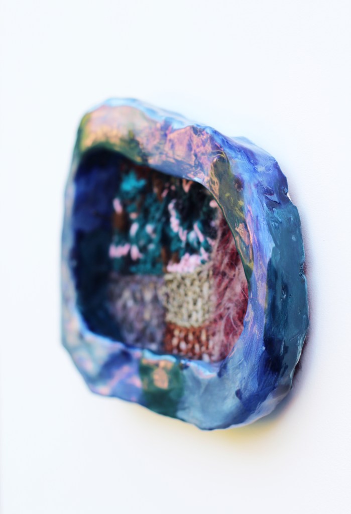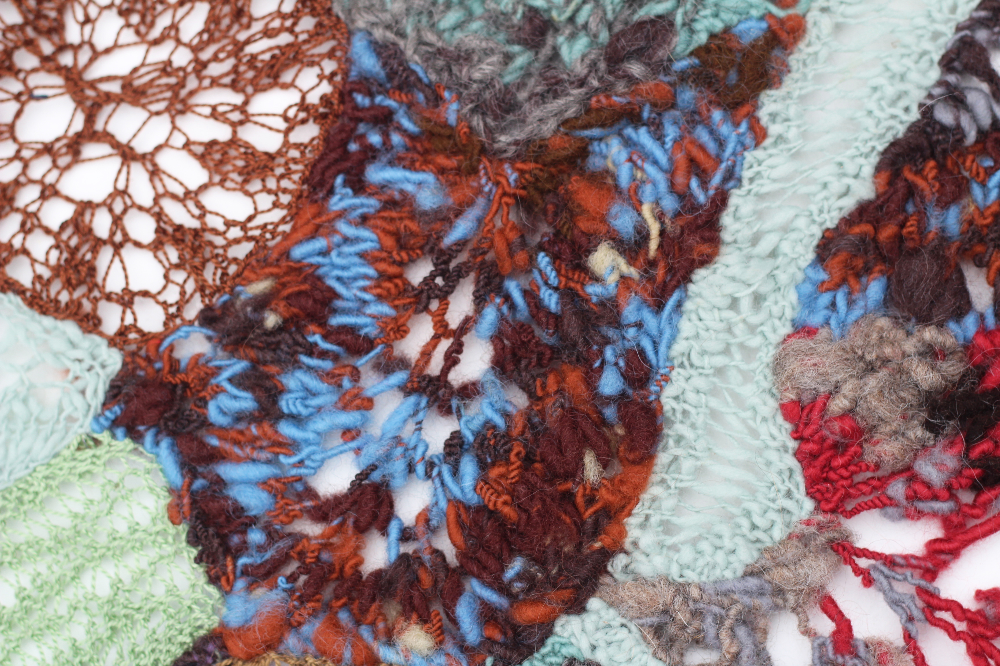 One of a series of works exploring earlier stages of craft: in which the artist has spun raw wool, which was then knitted by her mother, and hand-built ceramic frames from clay. The ceramics act as a support for the knitting, the history of which the artist has been researching alongside her solo show at Framework Knitters Museum. This show centred around lace, knitting and framing, the home, the inherited, art and craft hierarchies, nostalgia and domestic textiles.