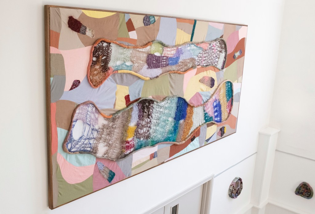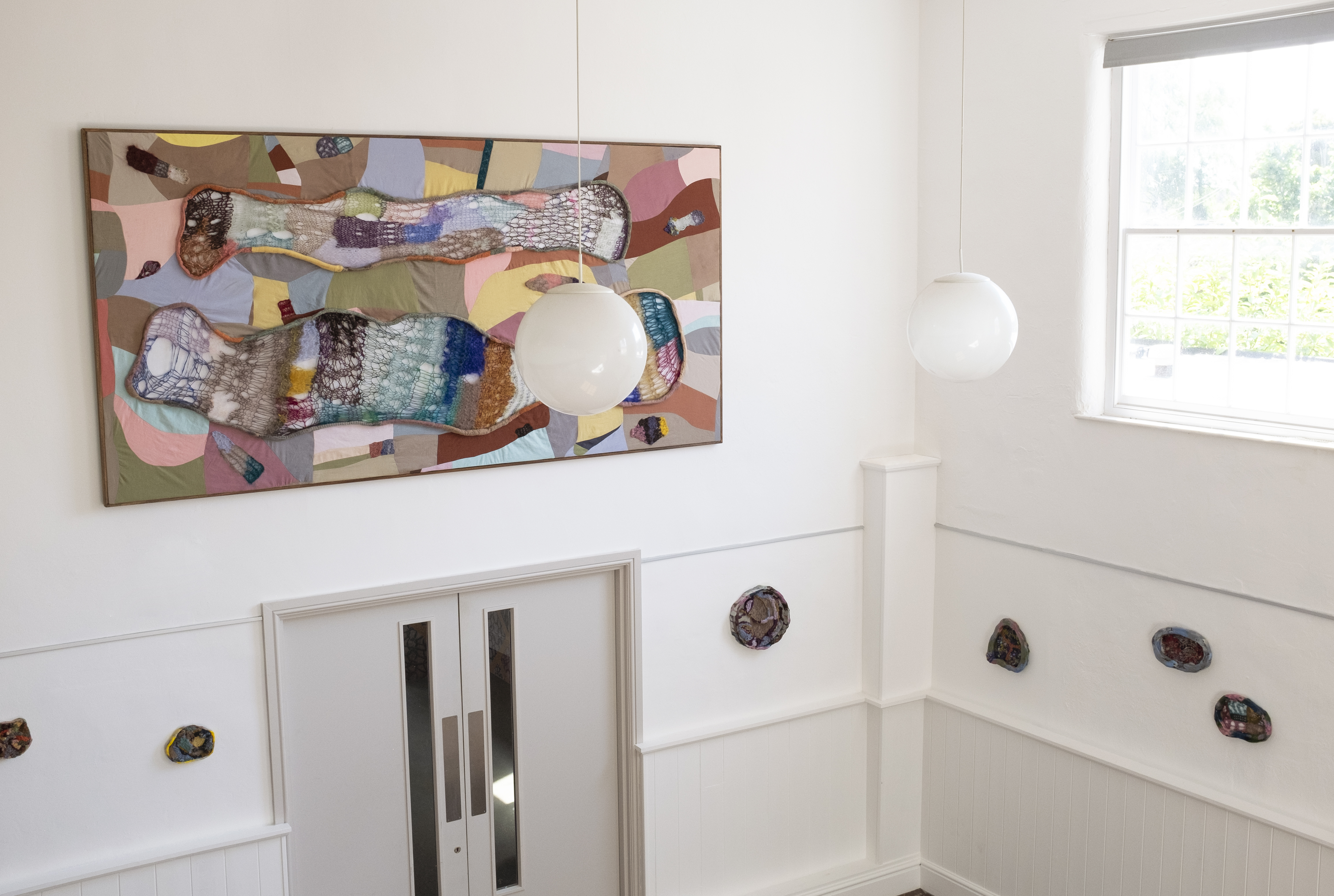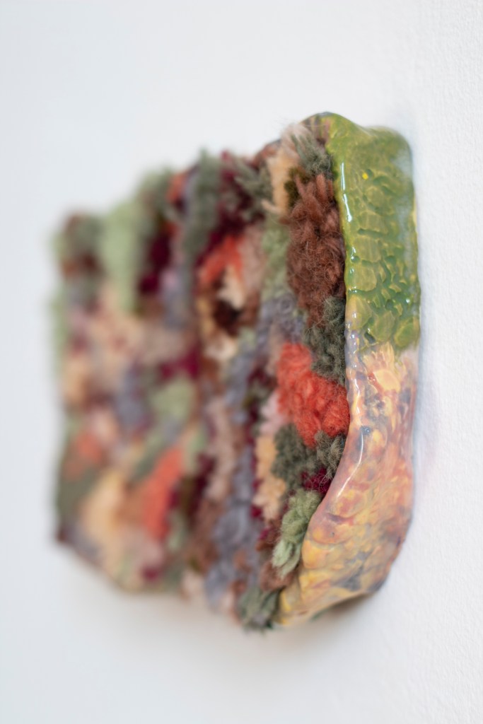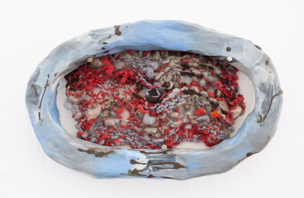 Night water & To not have to, glazed ceramic, homespun wool, mixed wool, embroidery thread, nails