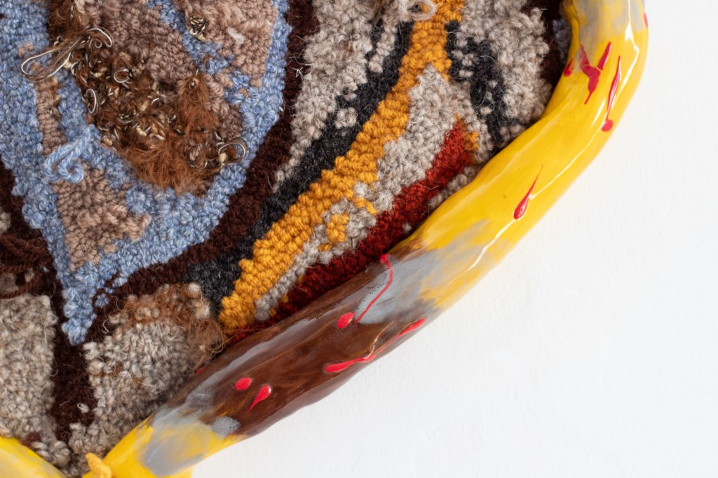 Hold you in this world, glazed ceramic, mixed wool, tufting cloth, dye, ink
