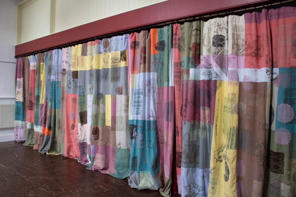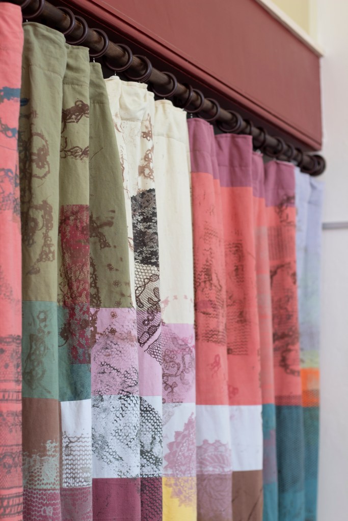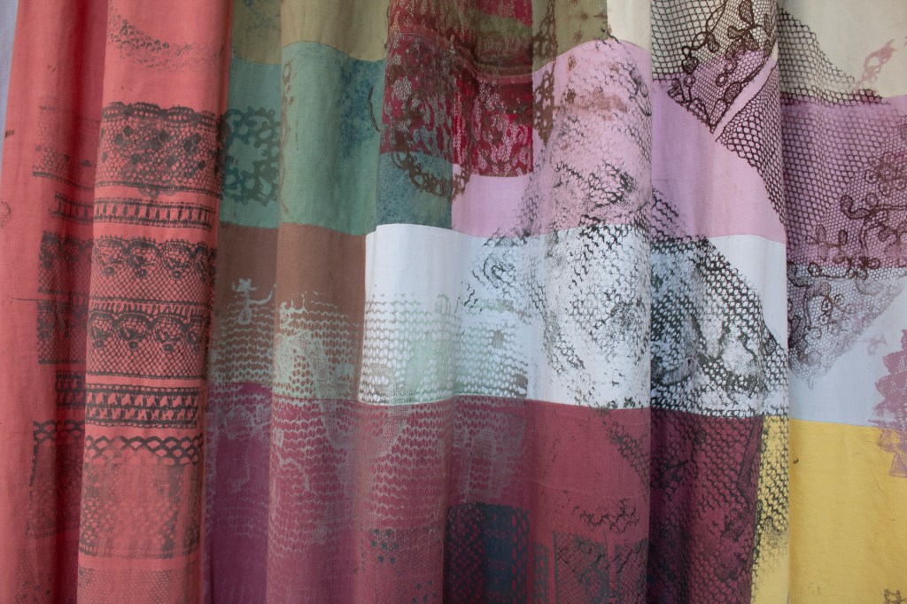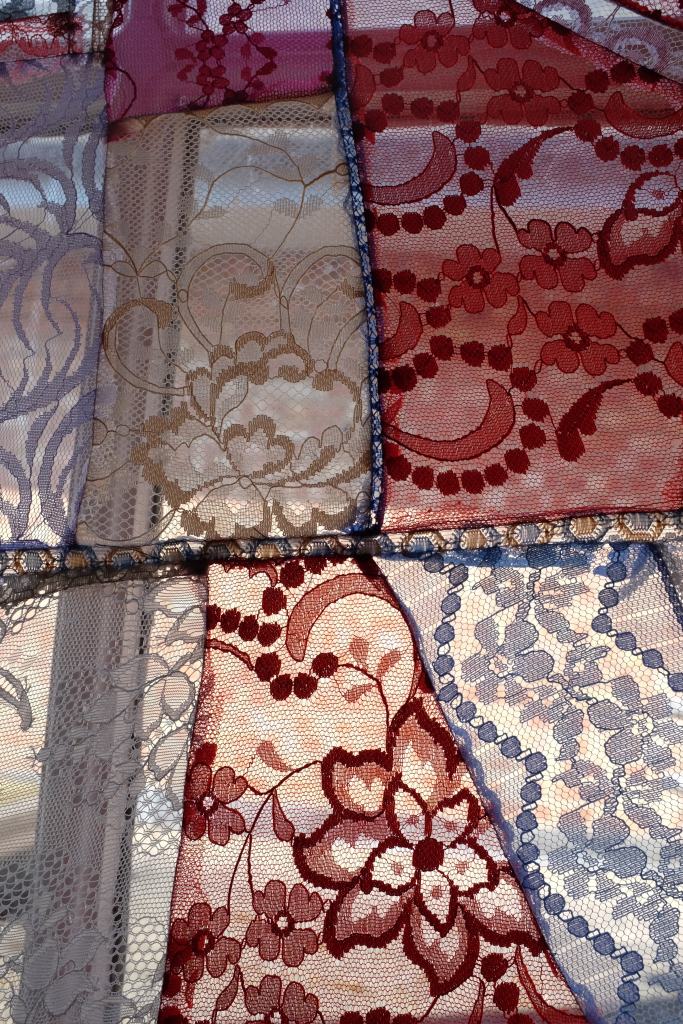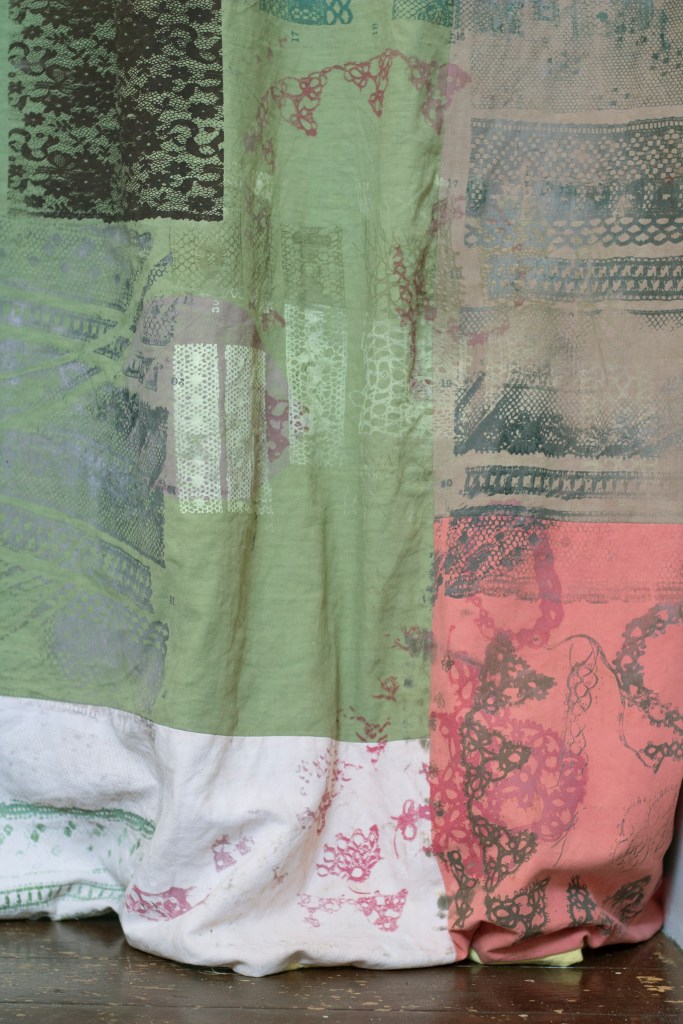 Holding History In My Hands is a patchwork curtain, silkscreen-printed with images of lace from three different contexts: the artist’s late grandma Brenda’s handmade lace (which she knotted and looped on her lap using the ‘tatting’ process), lace doilies that adorned drawers, bedside tables, and windows in Brenda’s home, and plates from William Felkin’s History of the Machine-Wrought Hosiery and Lace Manufactures (1867).