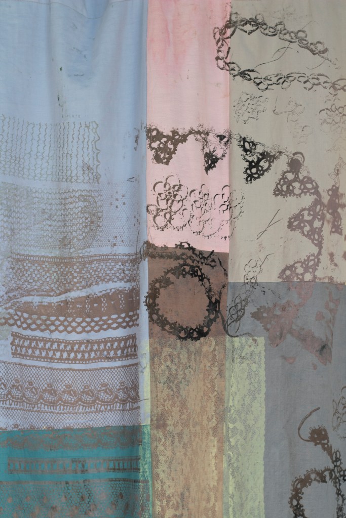The artist wanted to bring together ‘domestic’ or ‘cottage’ industry and large-scale manufacturing to show the different processes, contexts and histories of lacemaking. Lace was known as ‘the embroidery that hangs in the air’, lace took loops (which were central to knitting) to a new level of complexity and ornamentation. By printing the imagery of lace again, the artist is trying to preserve something delicate and fragile. The ghostly images of the lace disappearing and reappearing trace a lost history that has disappeared from people’s homes. Just as lace was traditionally associated with re-use, reproduction and changing fashions, the prints reproduce the lace and re-use it in a different context. In lace, transparency interplays with opacity, just as printing depends on the opacity of the image.
