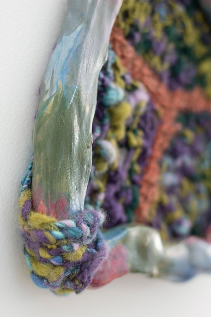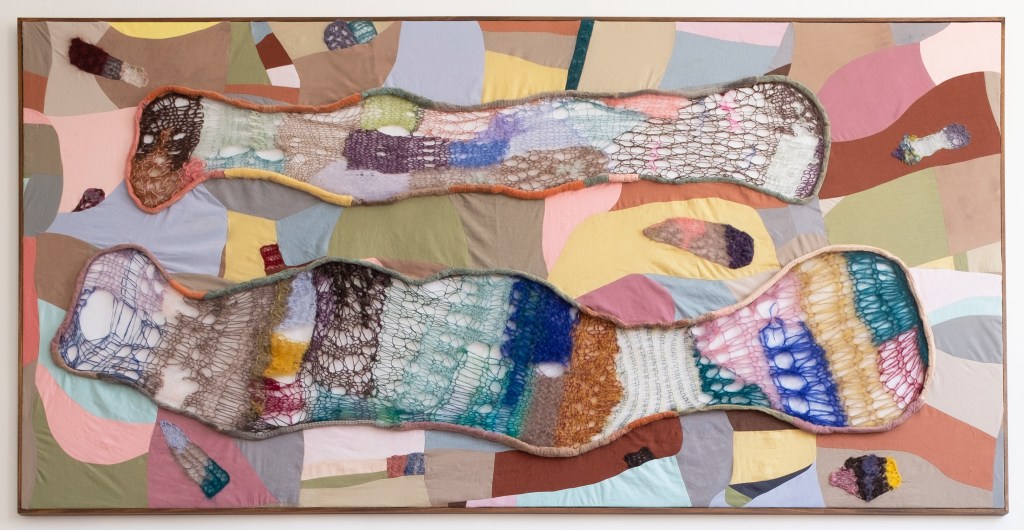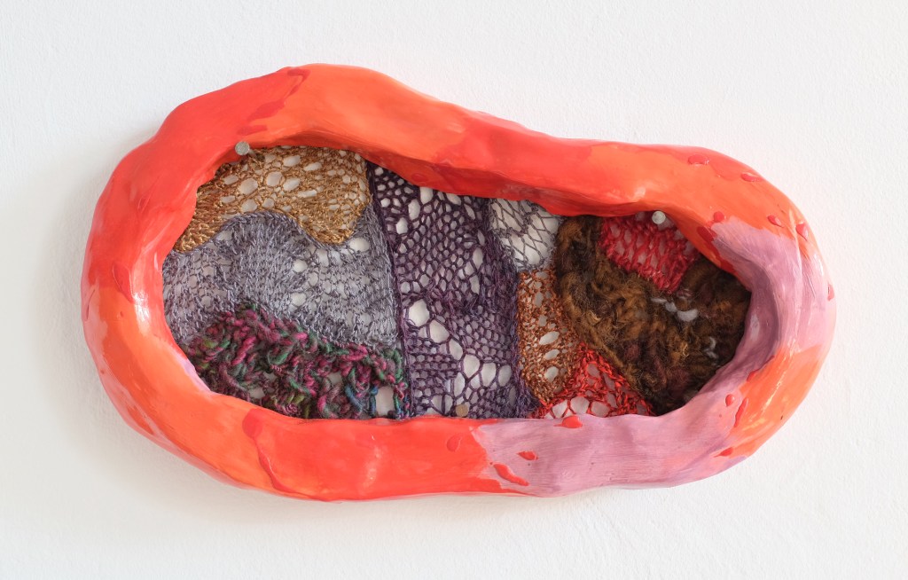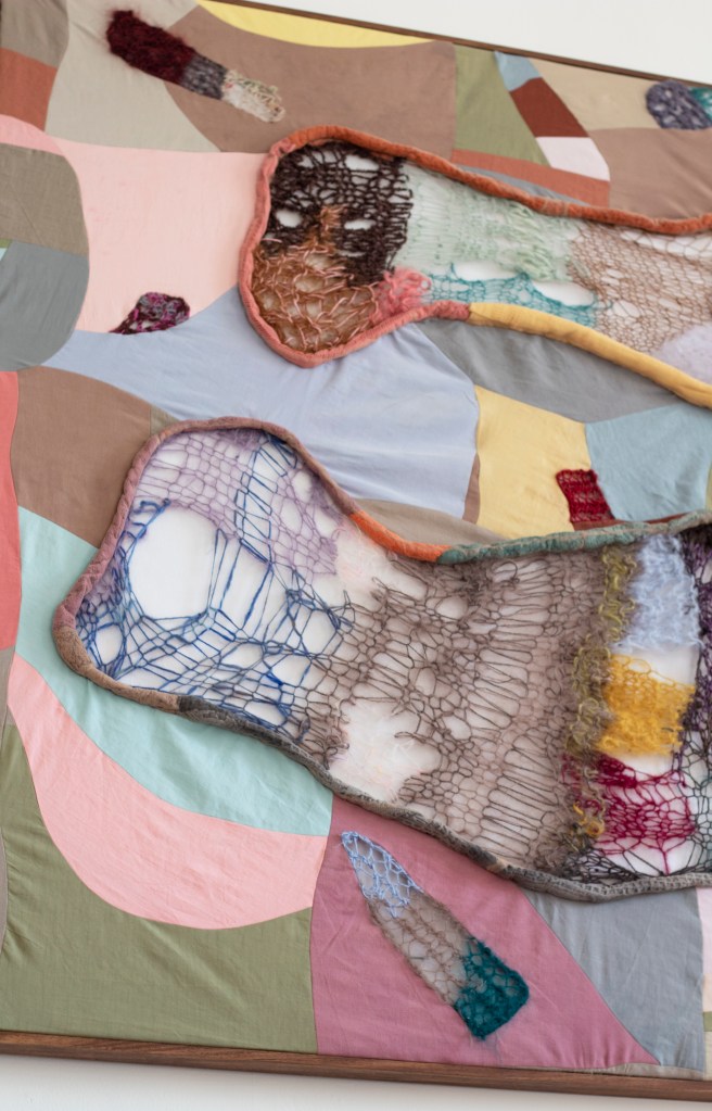 In Growing Pains, a combination of wool, lace, and dyed linens is patchworked together and framed, using different materials to explore lace, framing and knitting. The lace has been stuffed into translucent sausage-like shapes to frame the knitting, which was made by the artist’s mother to the artist’s design. The work is freeform in its approach, using colour, texture and different knit patterns in a compositional, painterly way. The knit is stretched out into two soft, bodily forms with flecks of knitting flying around them in different directions. The title hints at the rapid growth and changes in the framework knitting and lace industries, which parallel the often messy and painful progress of personal growth, both physical and psychological.