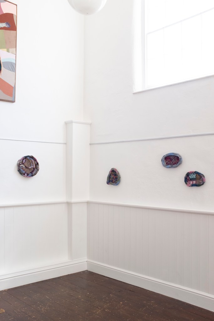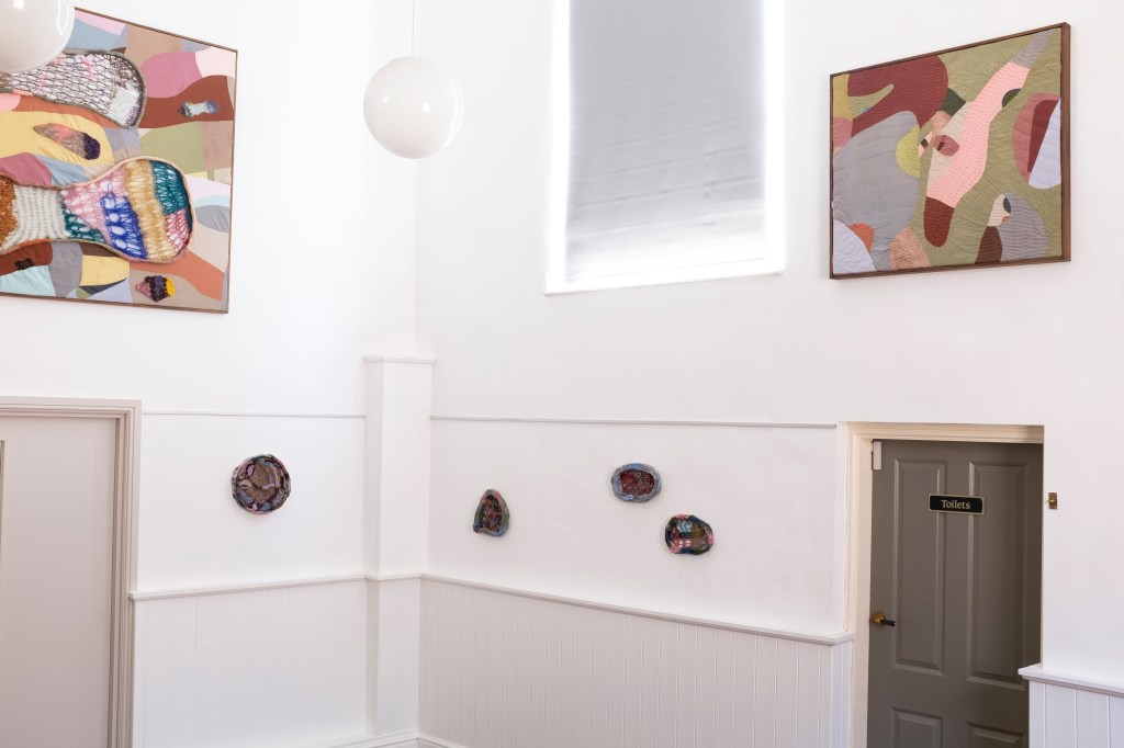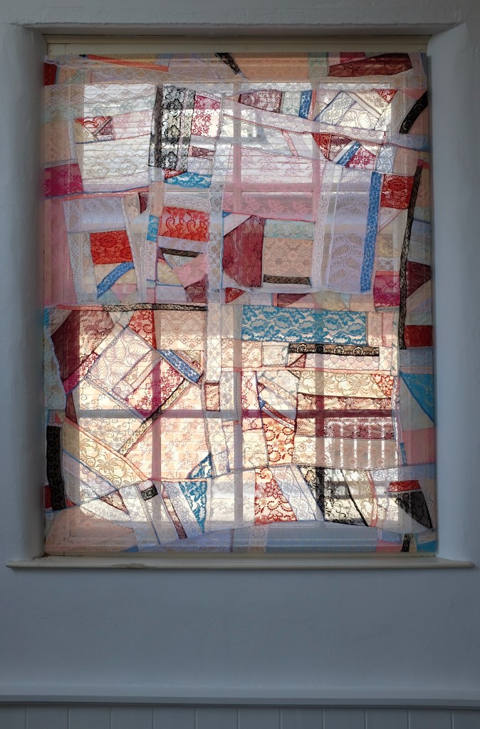 In her previous work, the artist has collected materials from workplaces and homes, and explored the sentimentality and emotion preserved in leftover items. For this solo exhibition, she was inspired by the history preserved at the Framework Knitters’ Museum, how lacemaking and framework knitting were nearly lost to history, and what these nostalgic forms mean to different generations. This led her to make site-specific works responding to and resemble aspects of the museum, from the processes of knitting, wool-spinning and quilting to the interior colours of the knitters’ cottages.