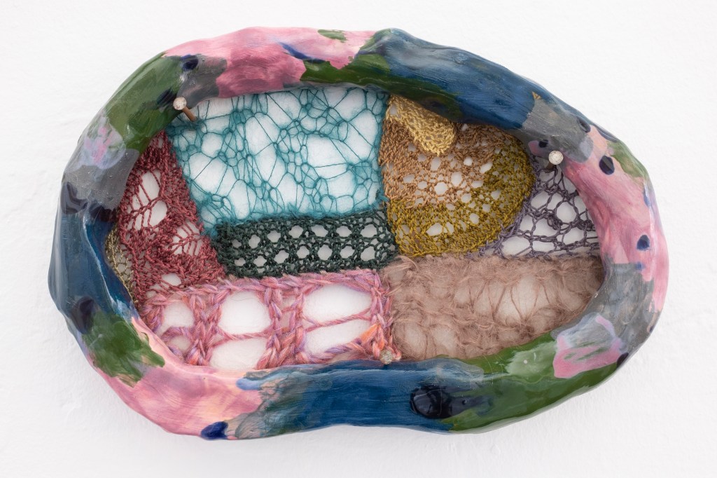 Holding bay glazed ceramic, mixed wool, embroidery thread, glue, nails