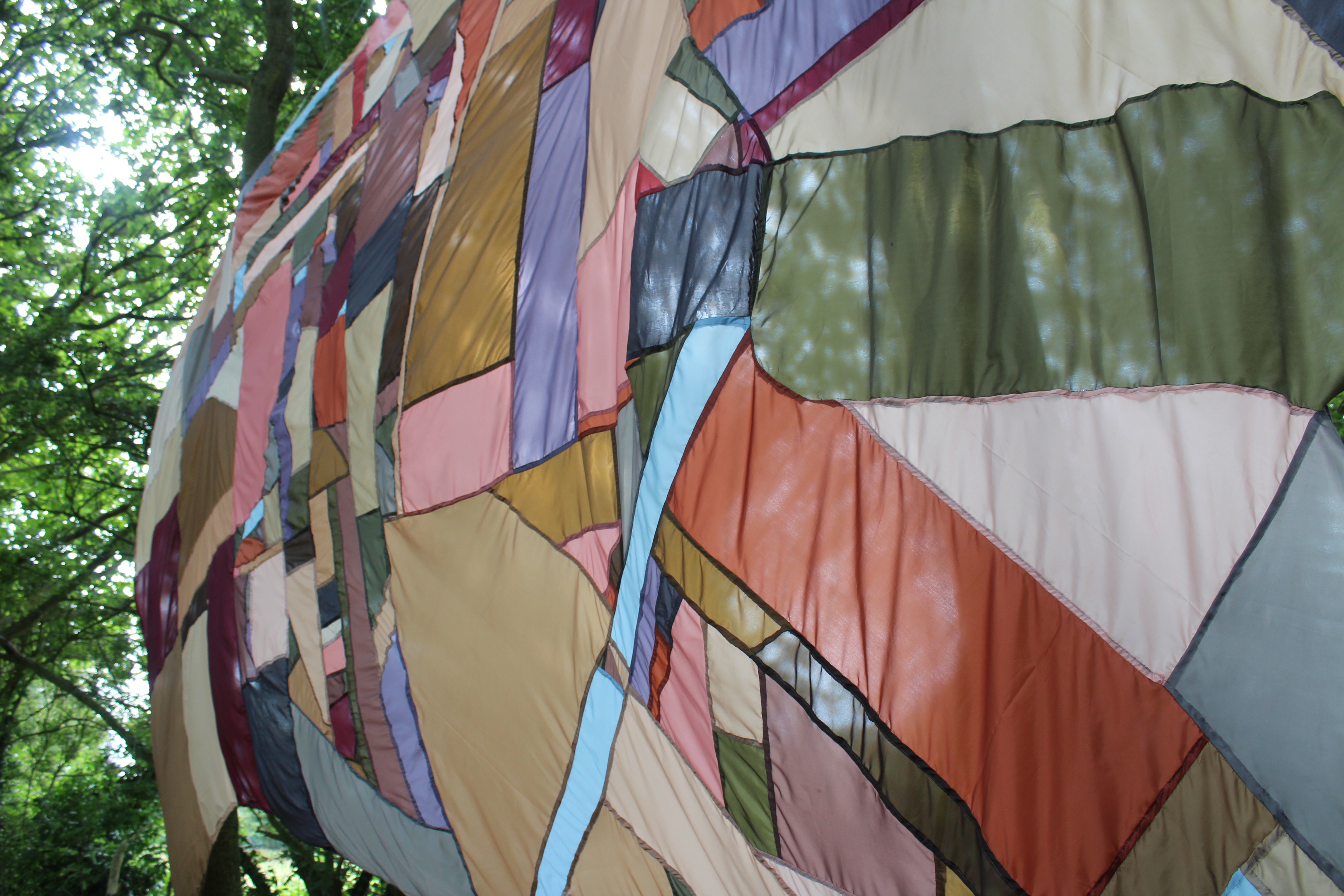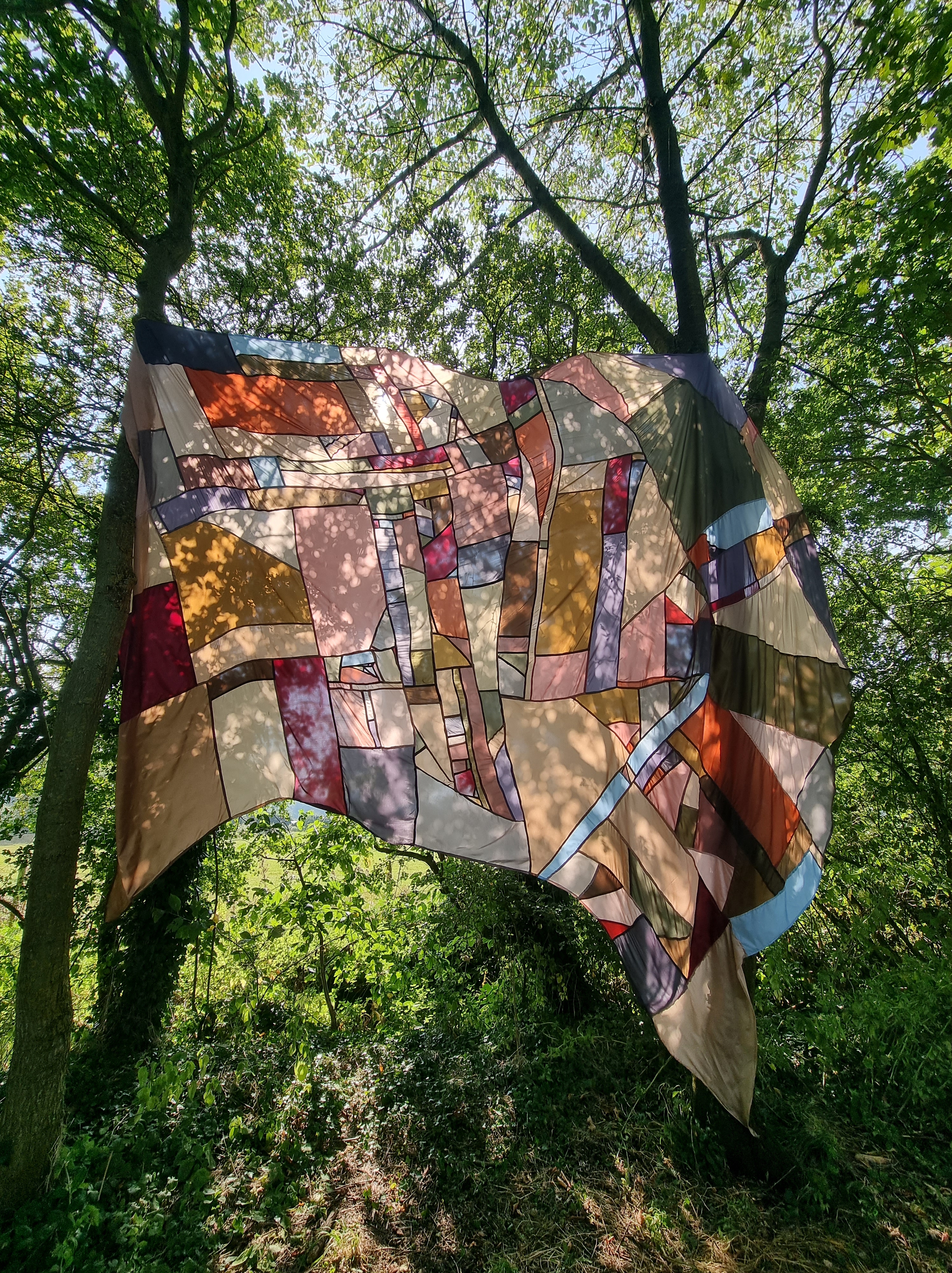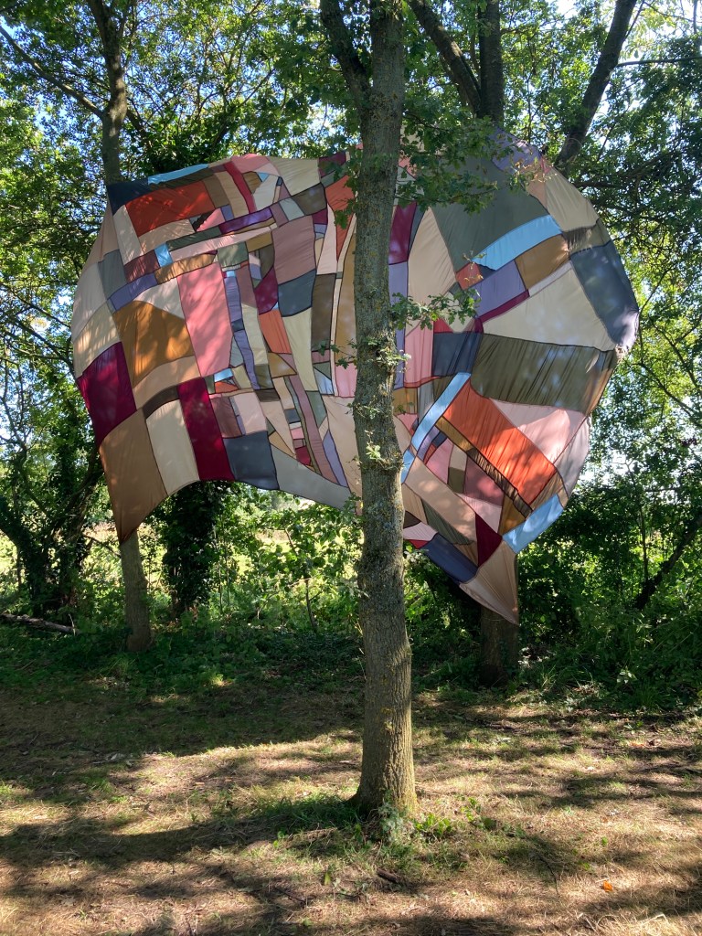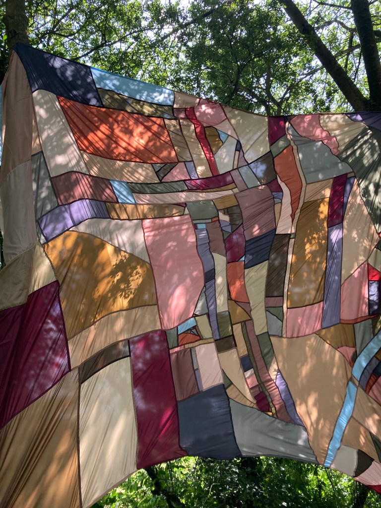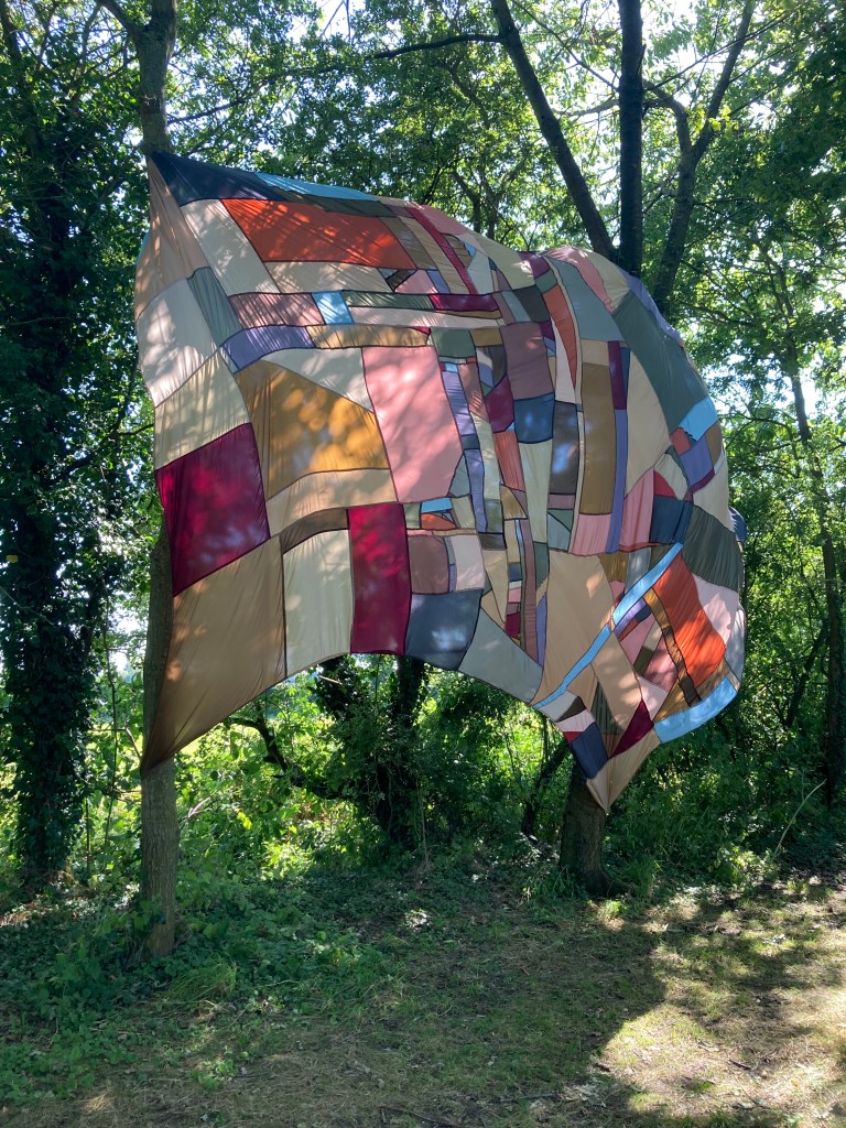 Going somewhere else, lining fabrics, thread, chord, installed at Raveningham Sculpture Trail, Raveningham Centre, Curated by Sarah Cannell, South Norfolk, July 2023, 4m x 4m.