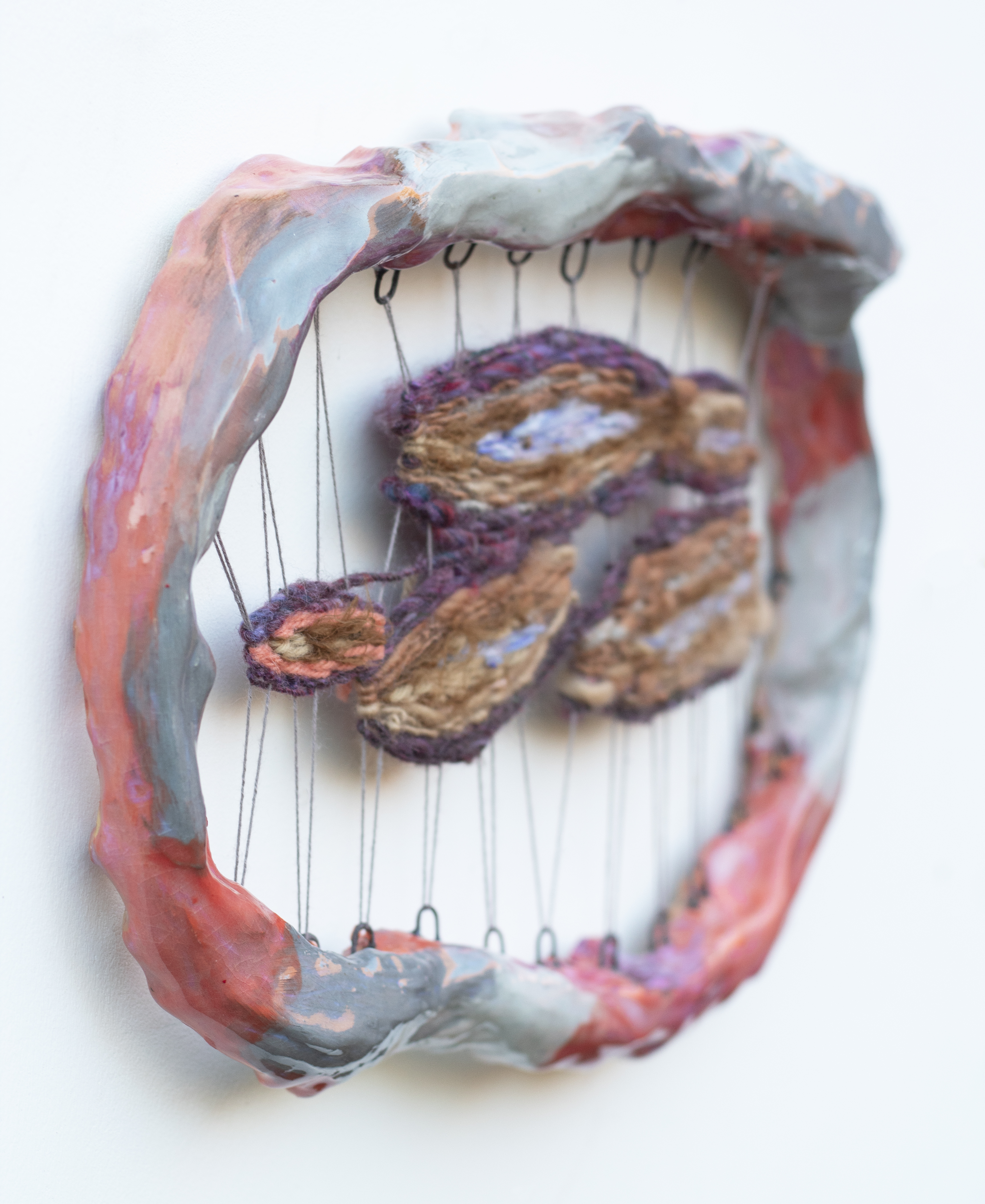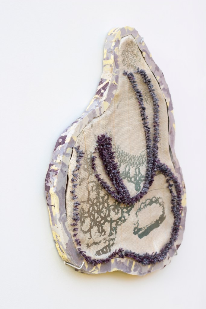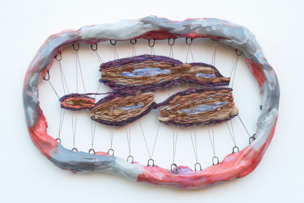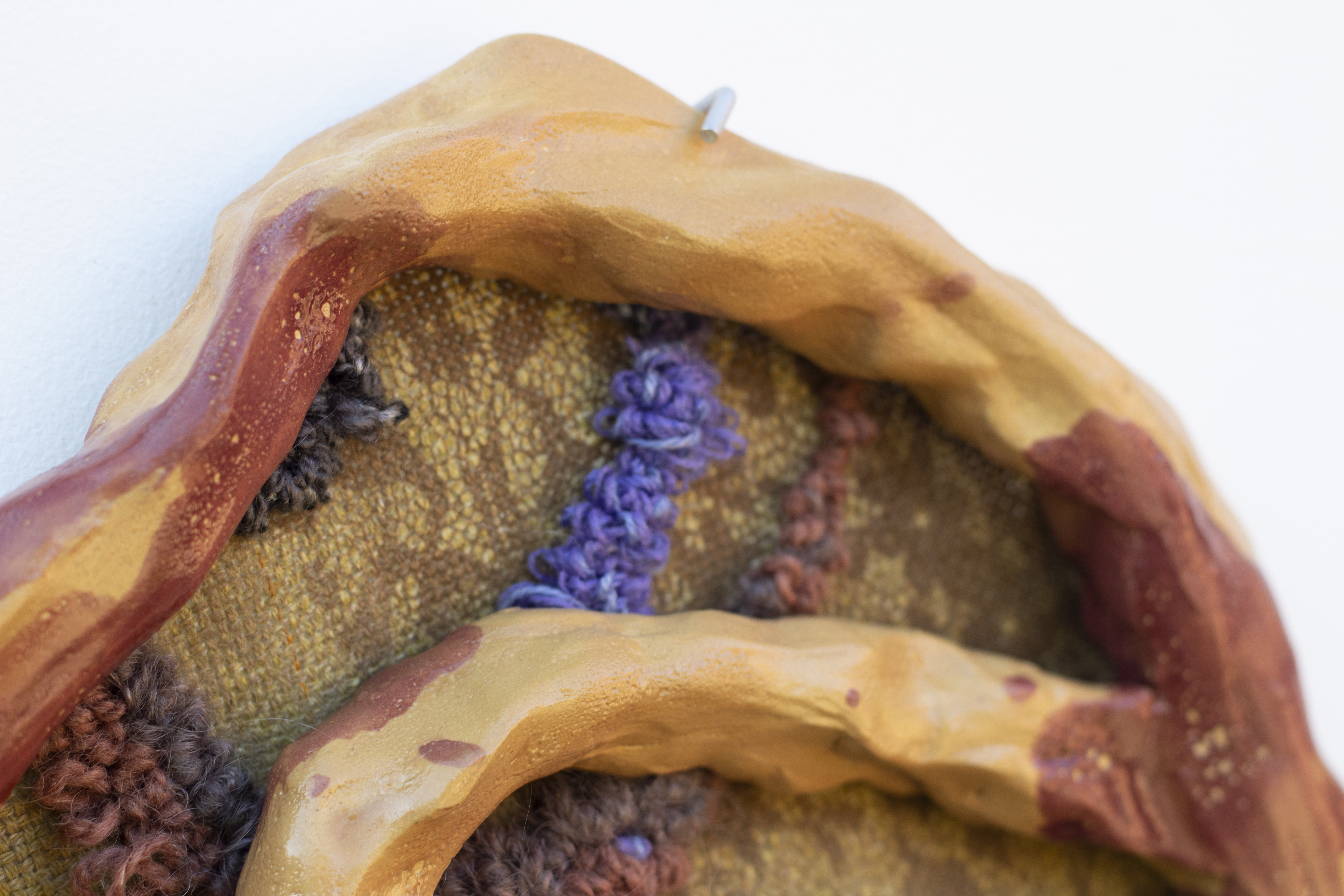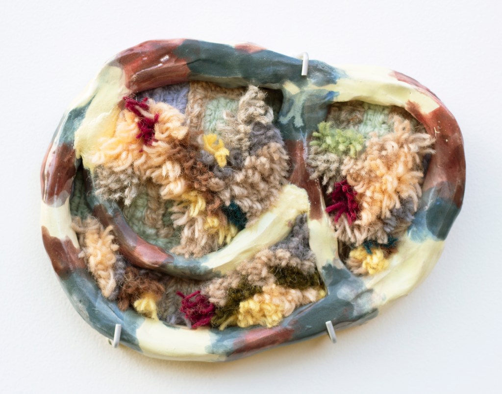 Thread of what she’s telling ceramic, paint, varnish, tufting fabric, mixed wool, ink, thread, dye