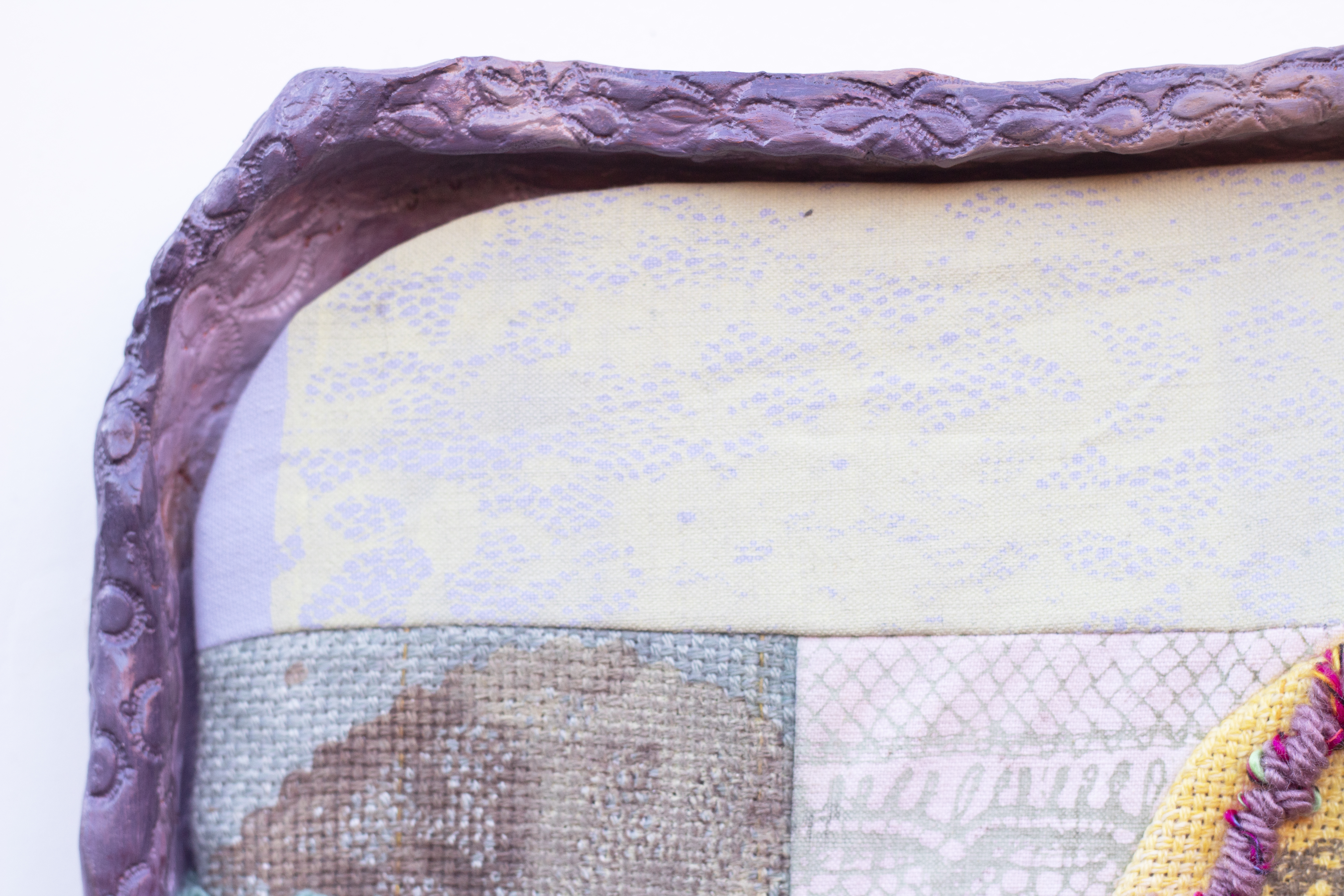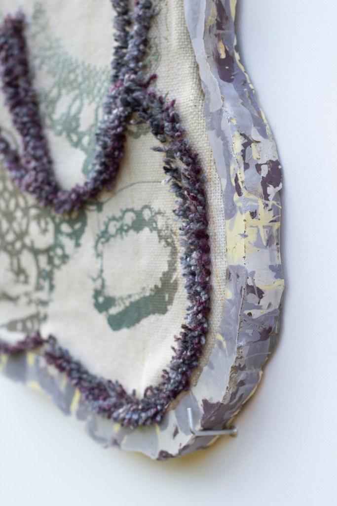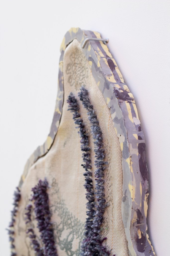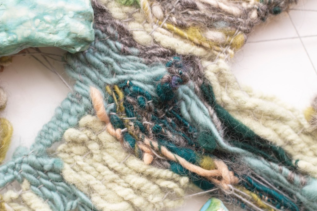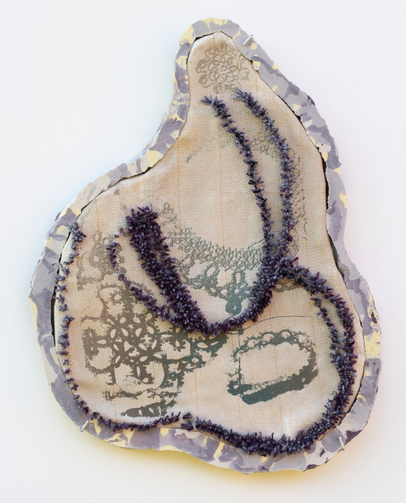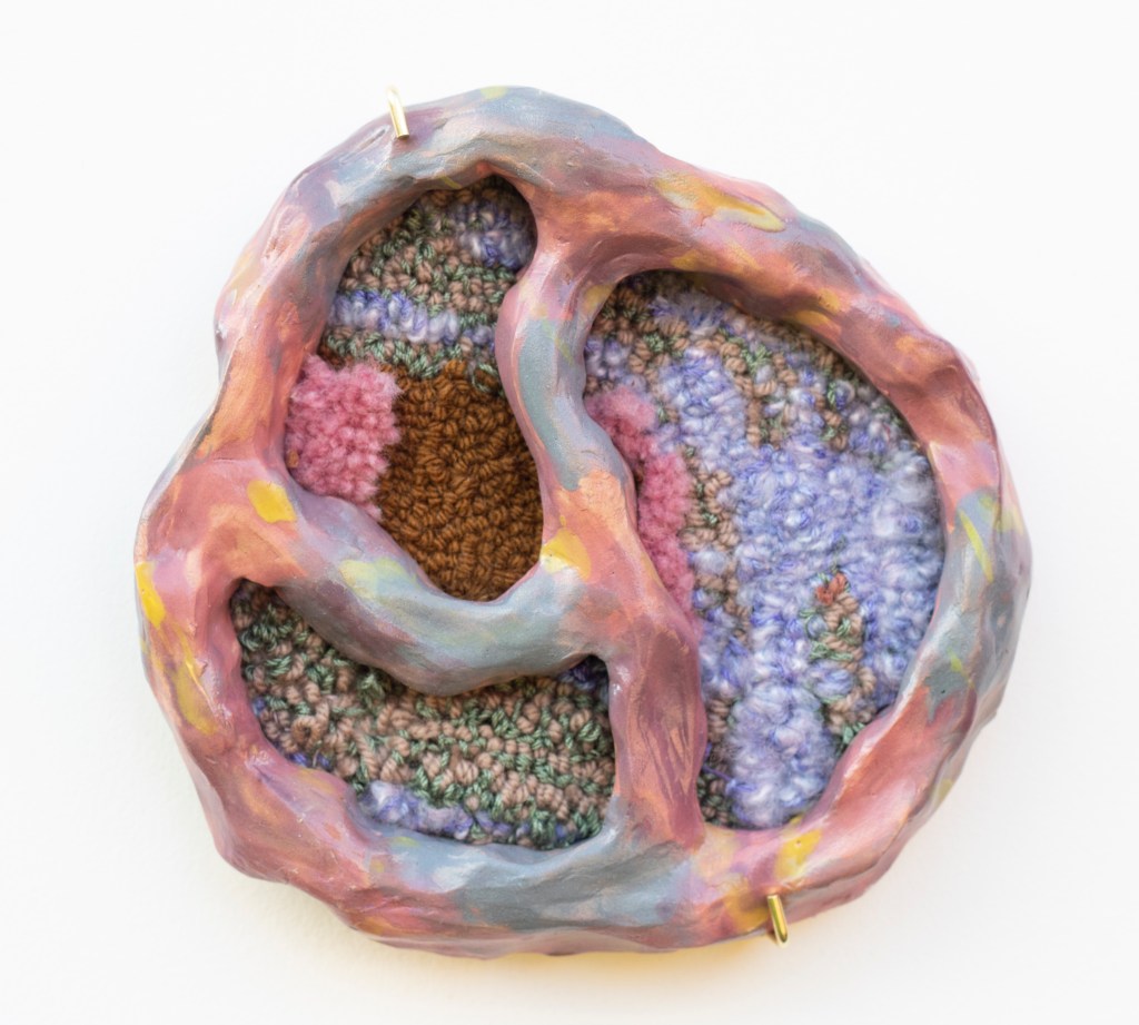 Thread of what she’s telling ceramic, paint, varnish, tufting fabric, mixed wool, ink, thread, dye