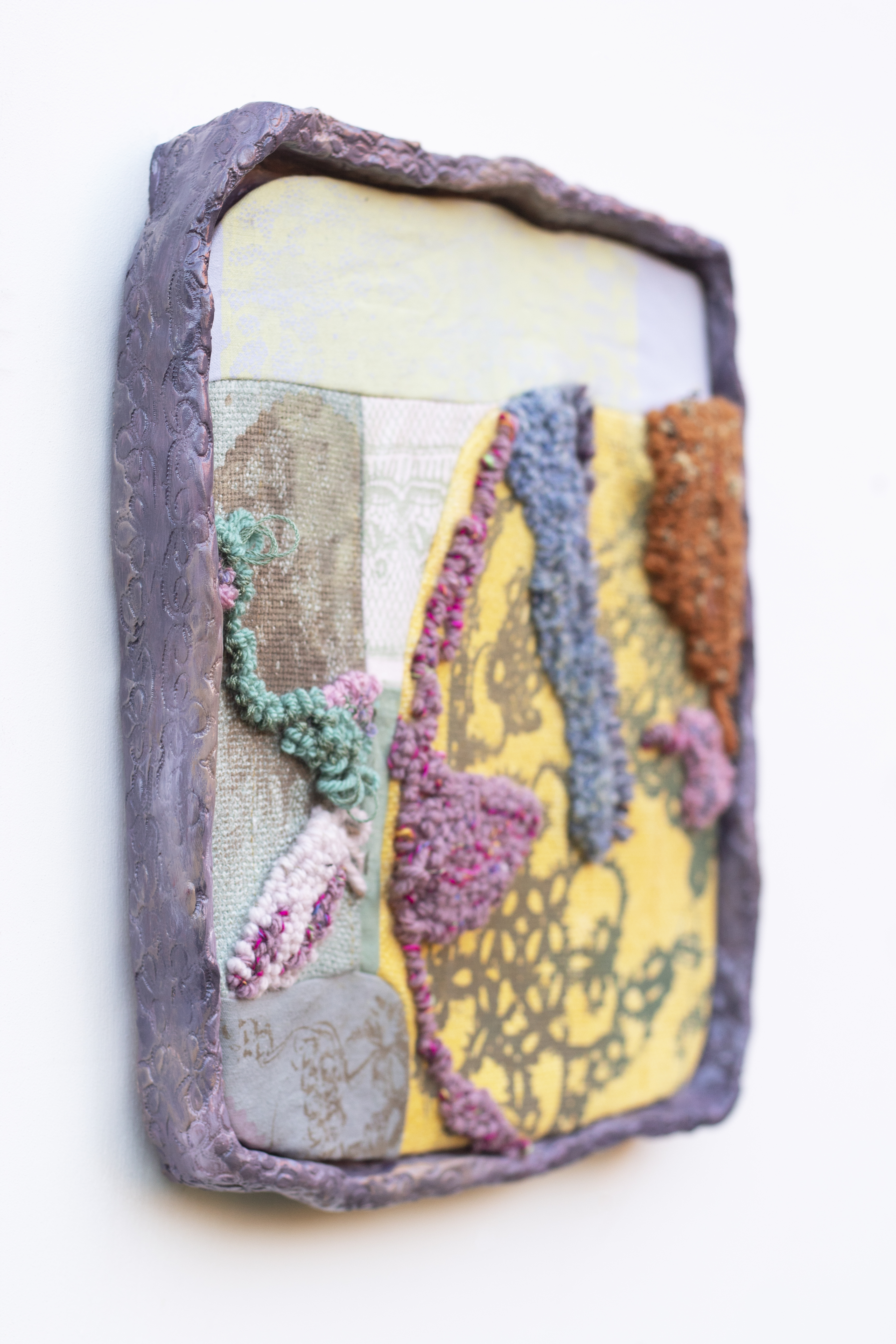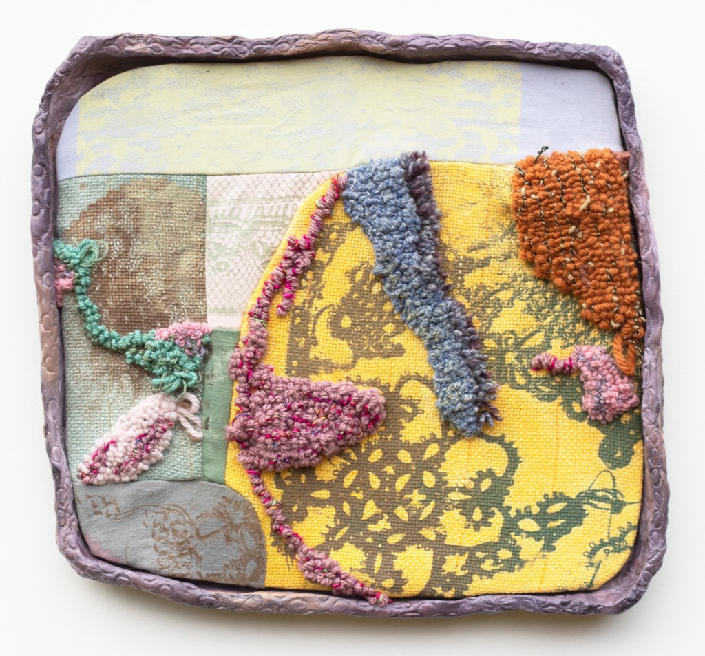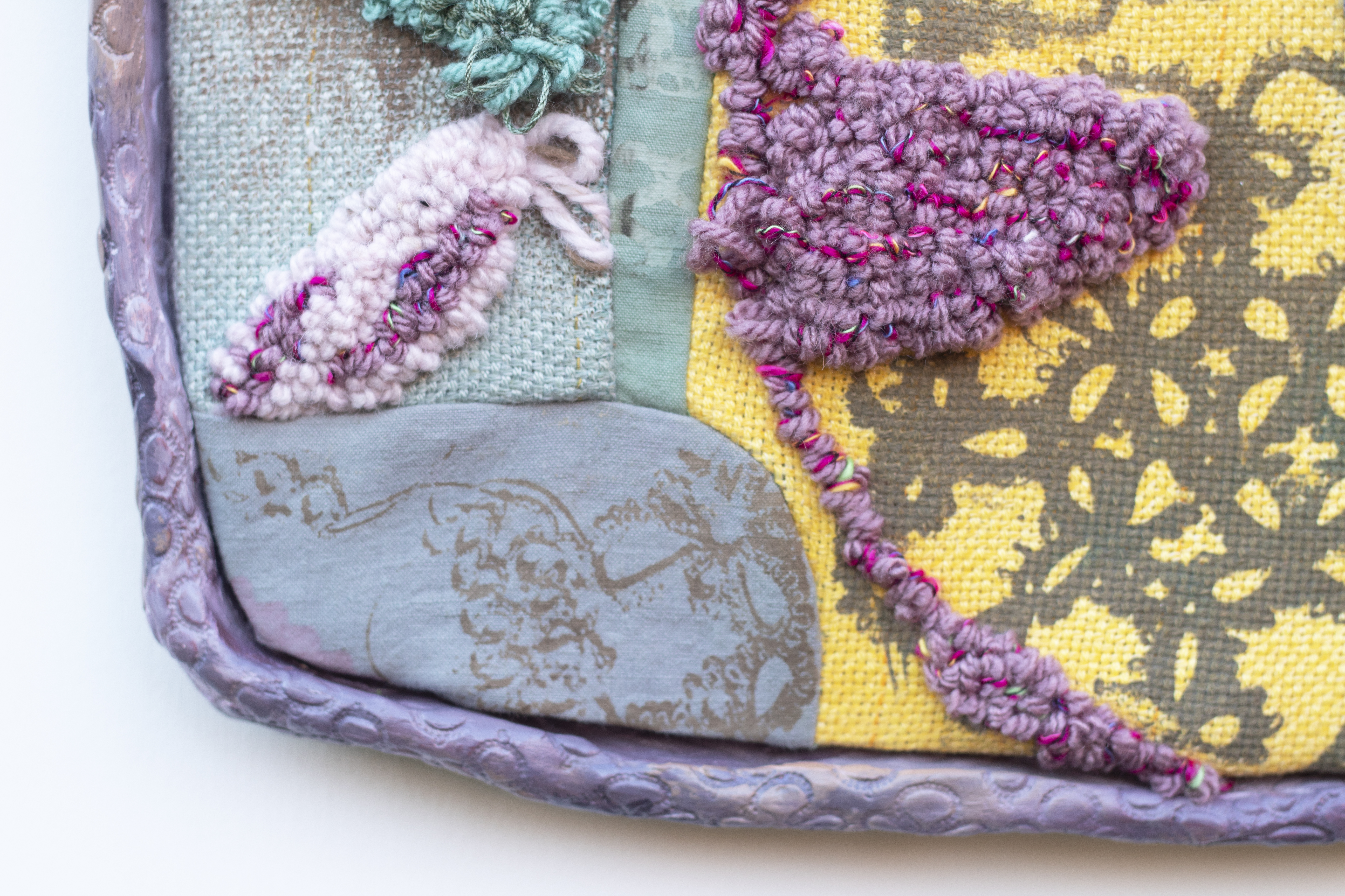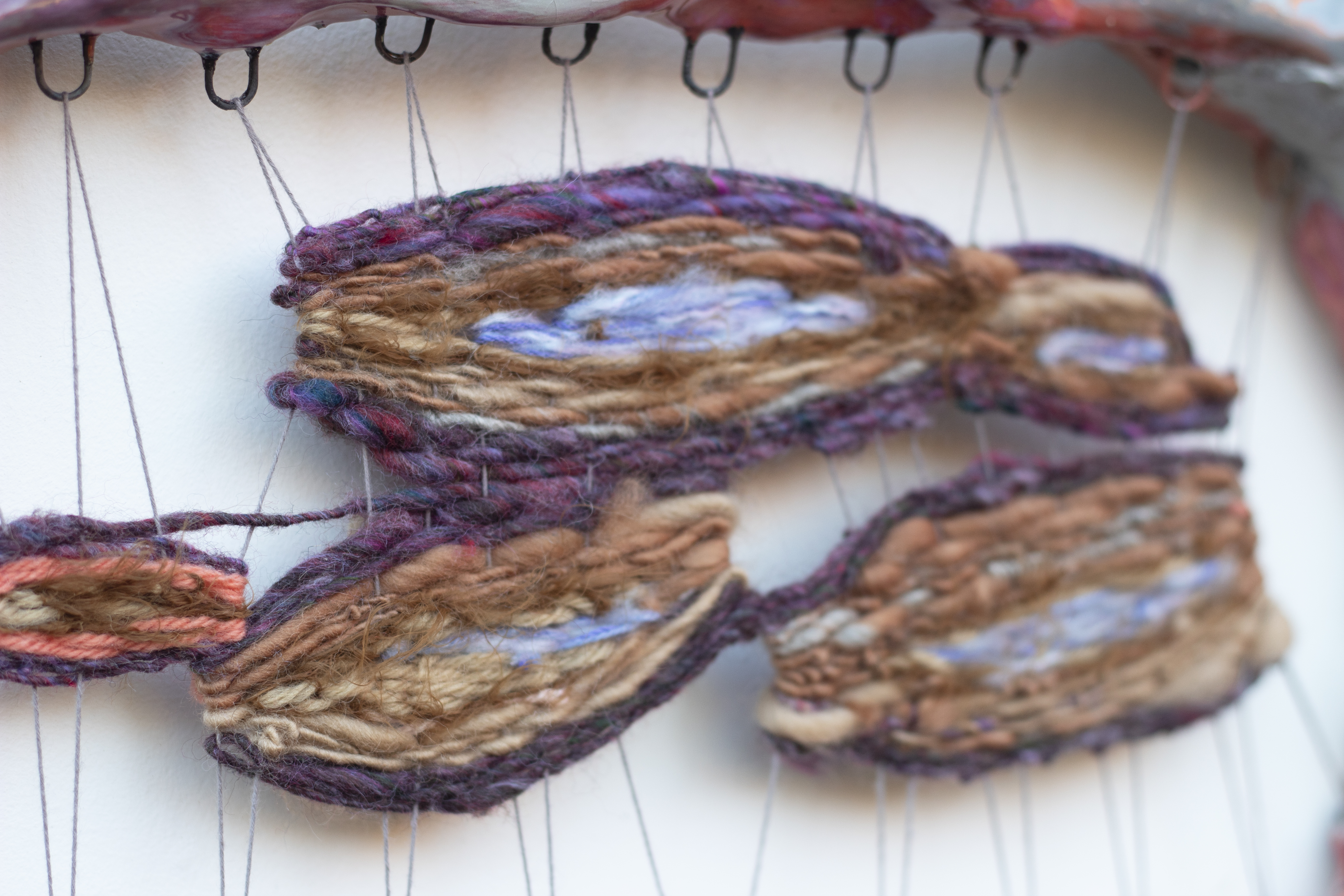 Thread of what she’s telling ceramic, paint, varnish, tufting fabric, mixed wool, ink, thread, dye
