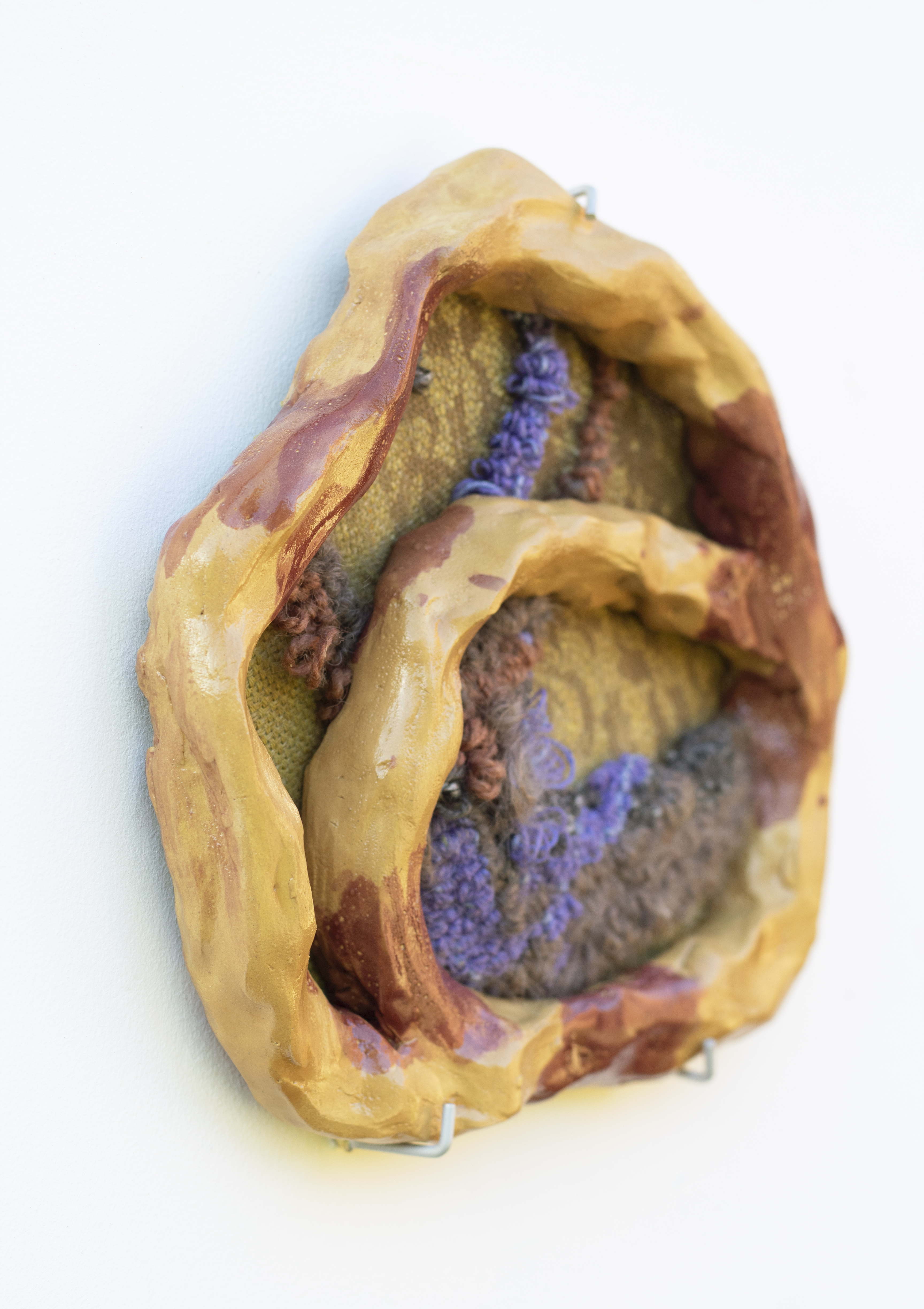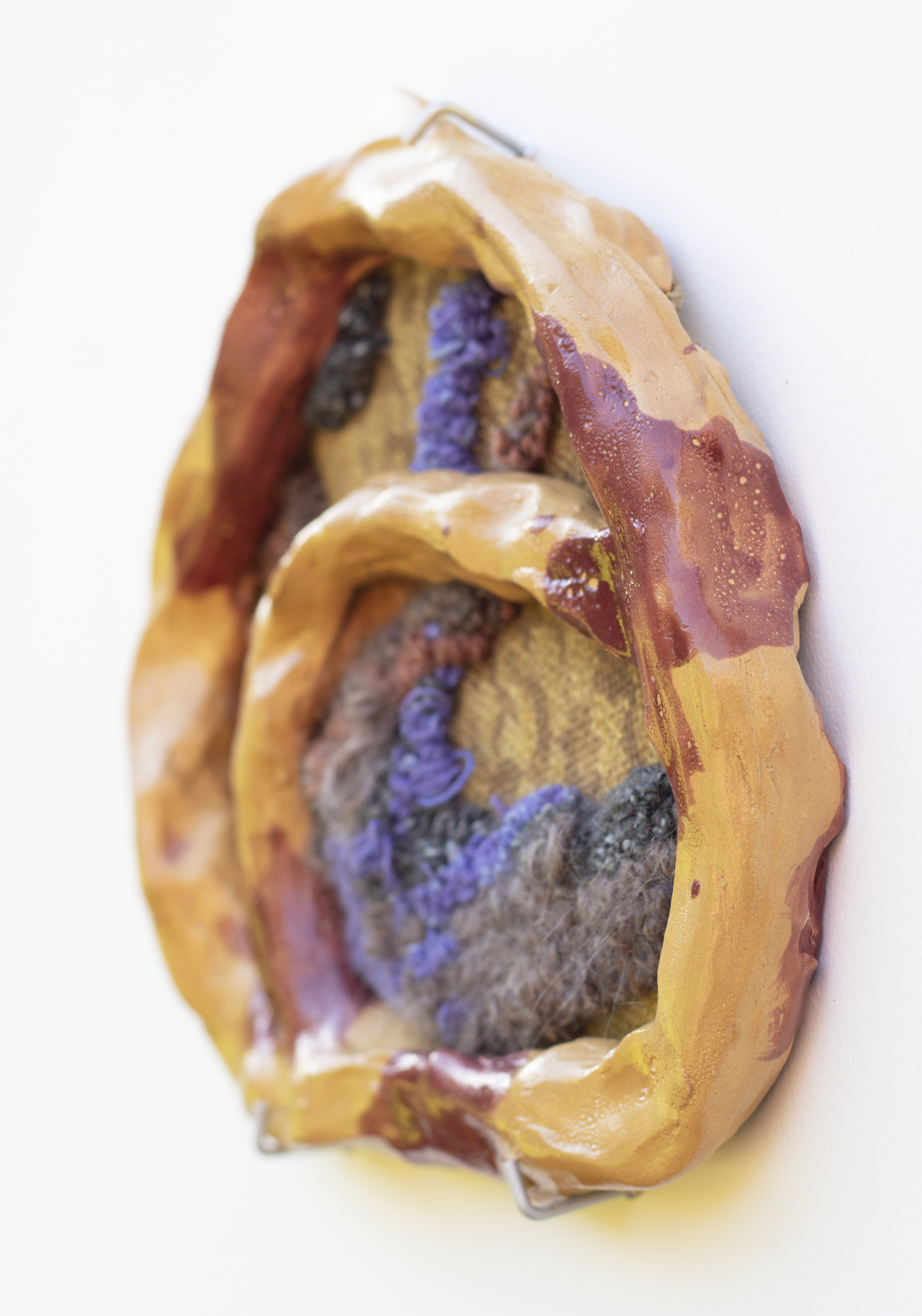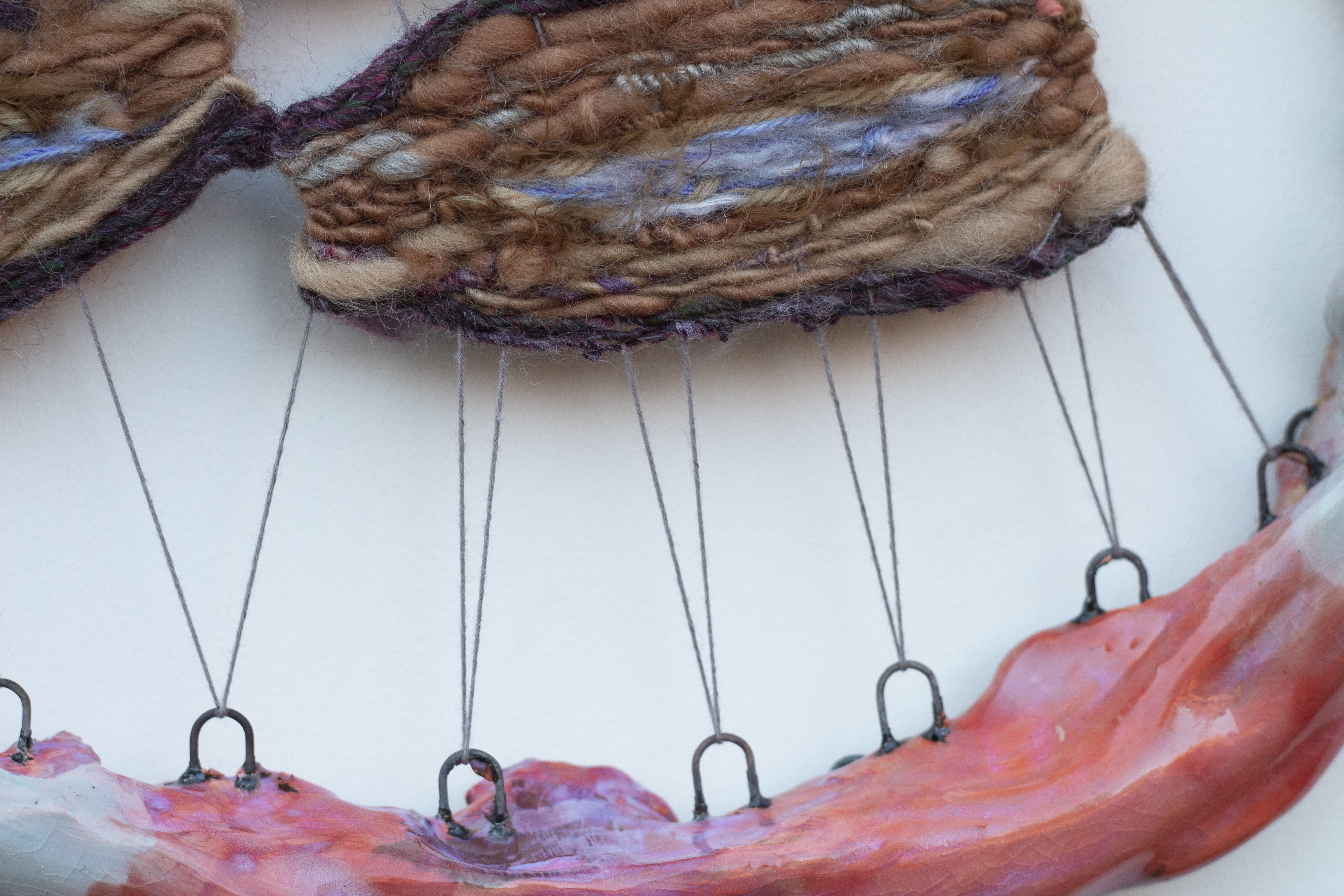 Shortage of support, glazed ceramic, linen thread, homespun wool, metal, from Ceramic wool rebuilds series, which is about lace, fibres, framing and inherited textiles, from November – December 2023.