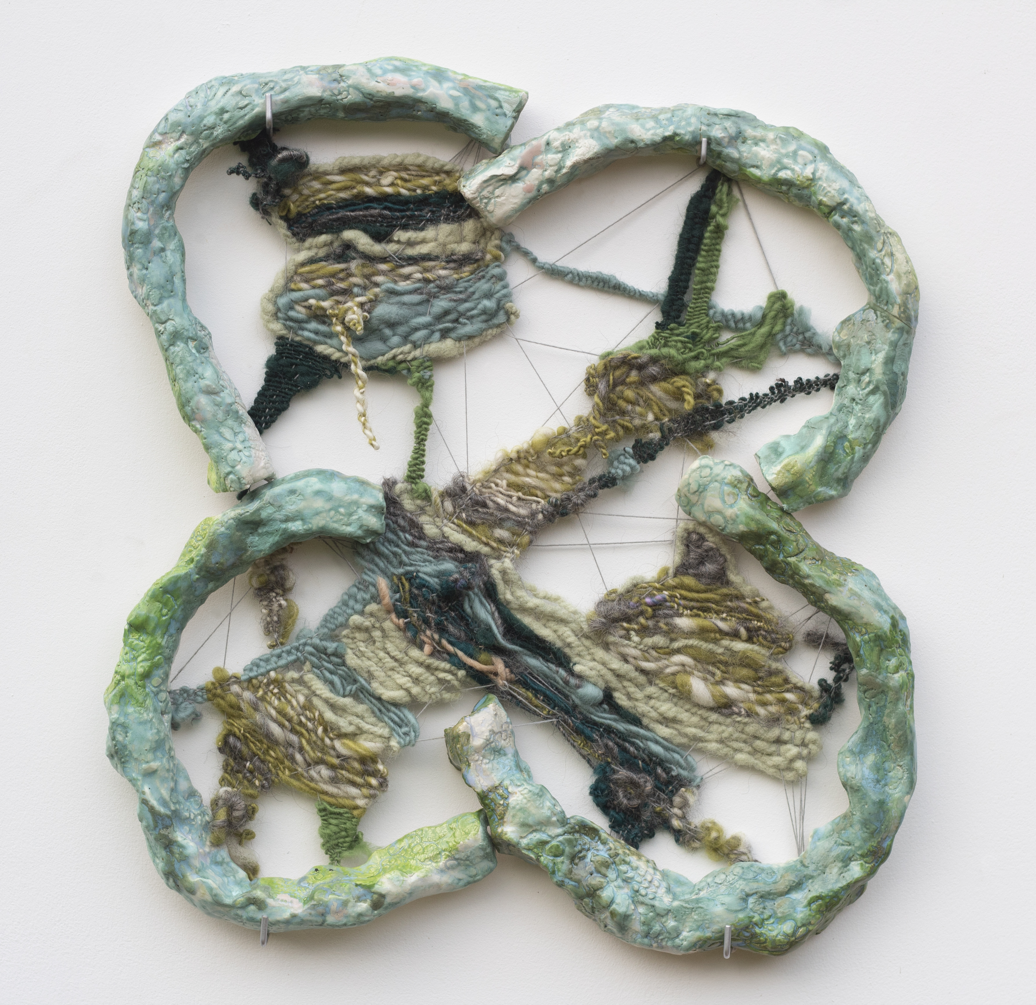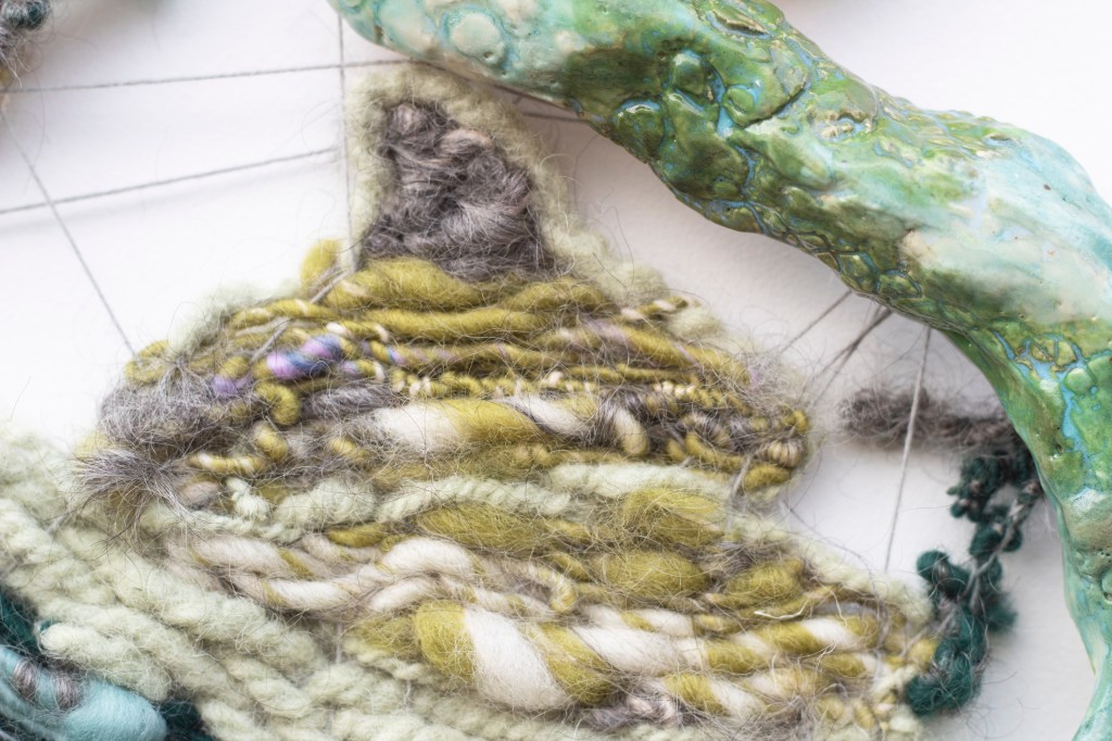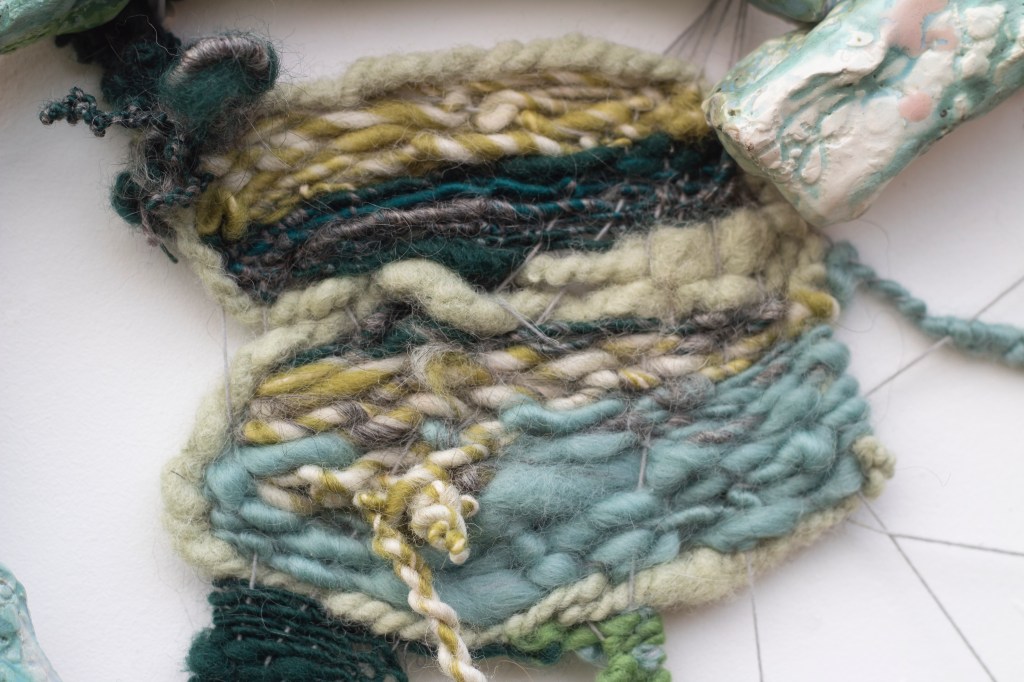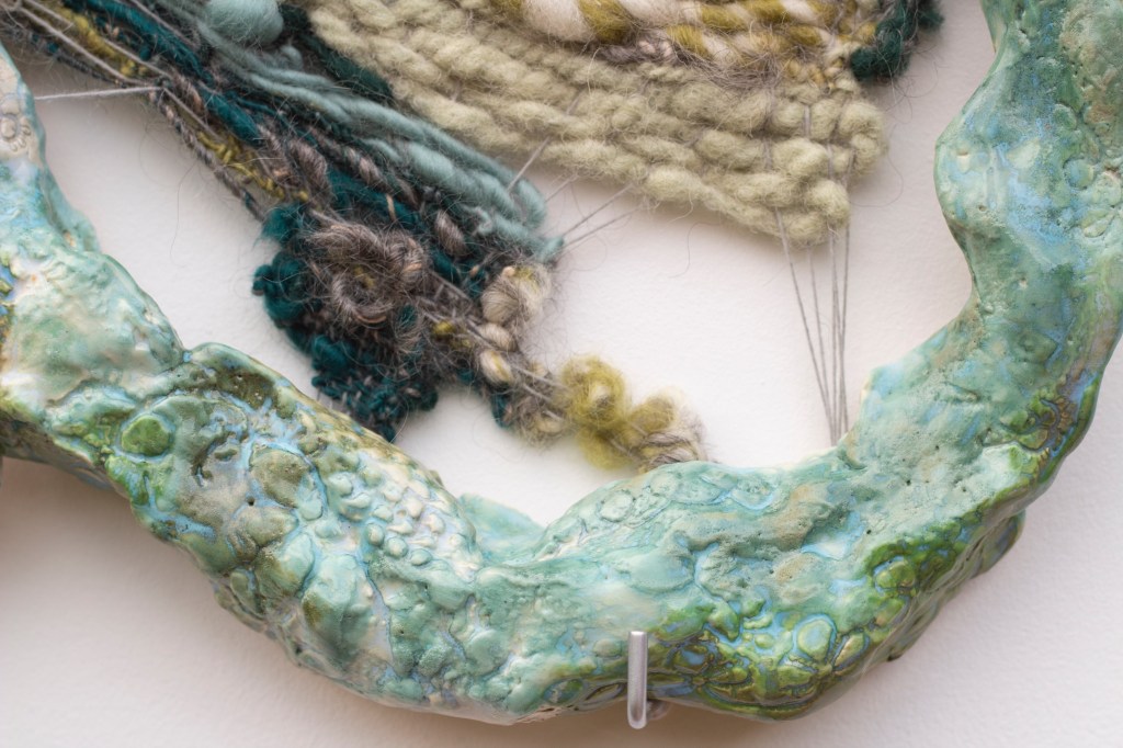 Shortage of support, glazed ceramic, linen thread, homespun wool, metal, from Ceramic wool rebuilds series, which is about lace, fibres, framing and inherited textiles, from November – December 2023.