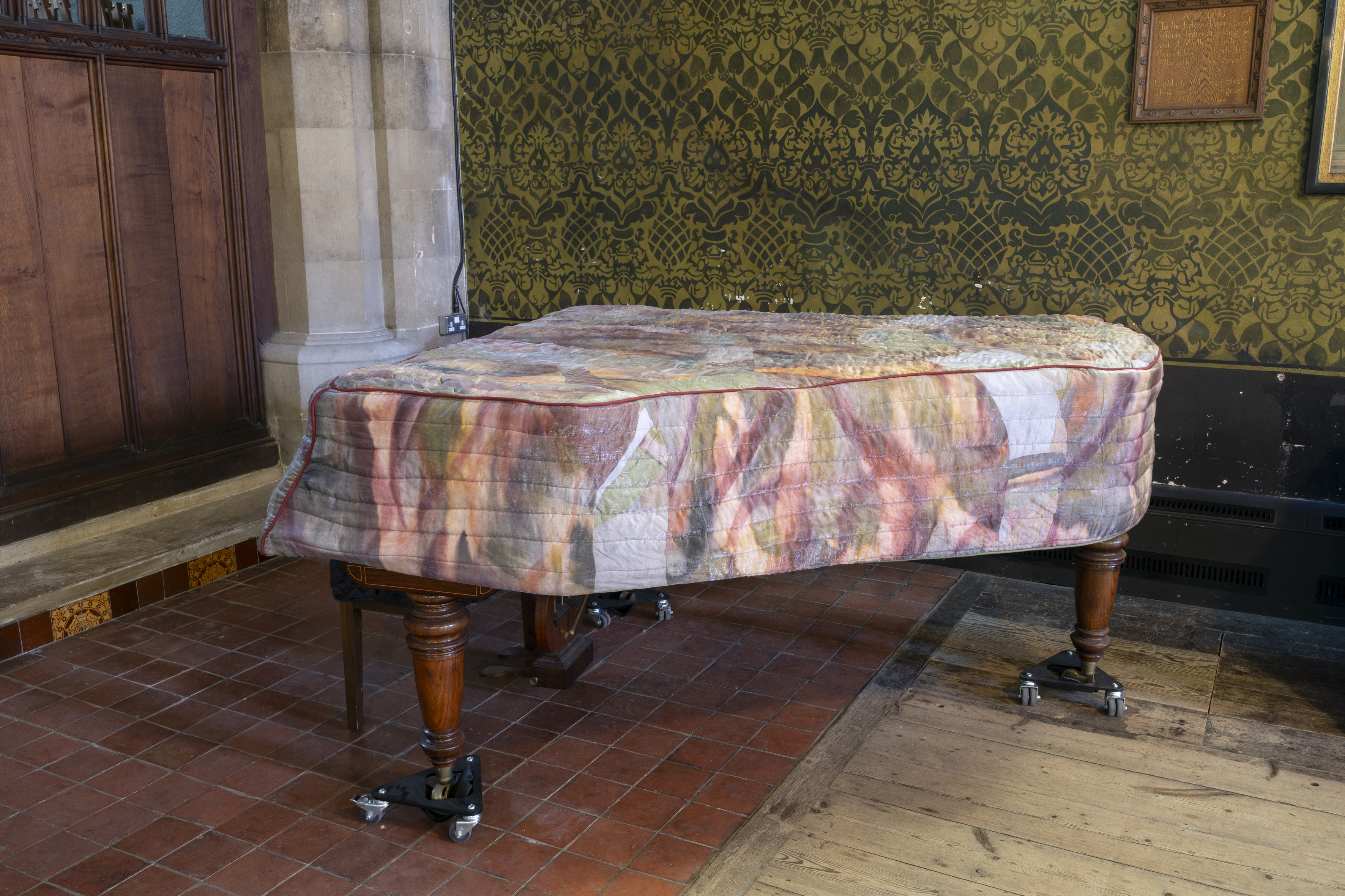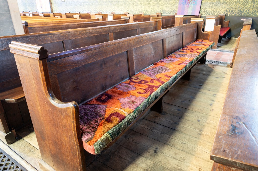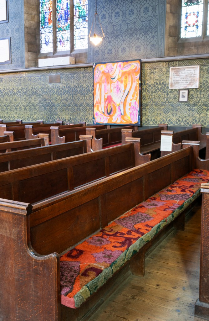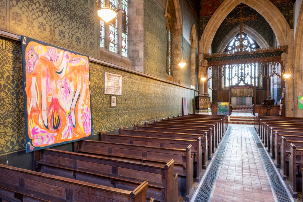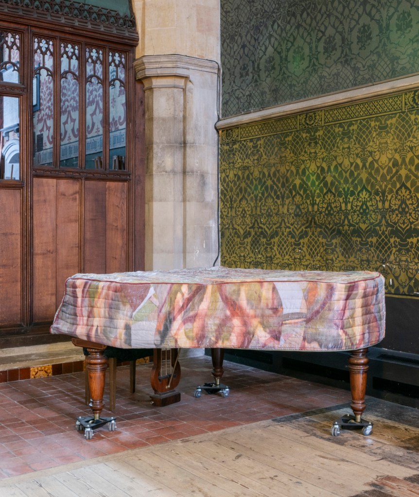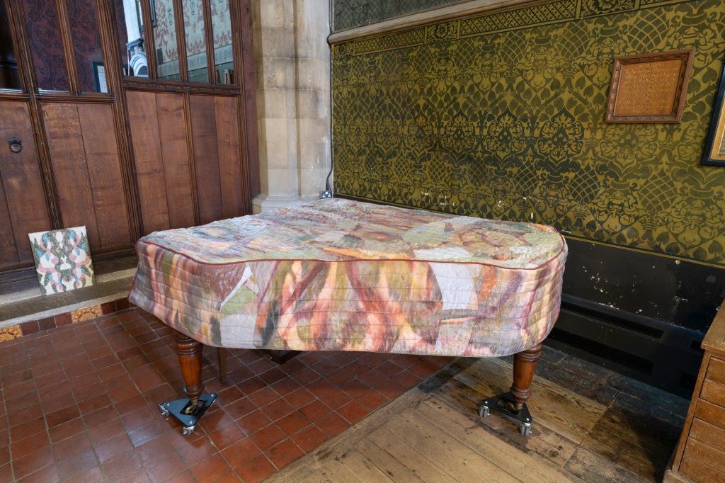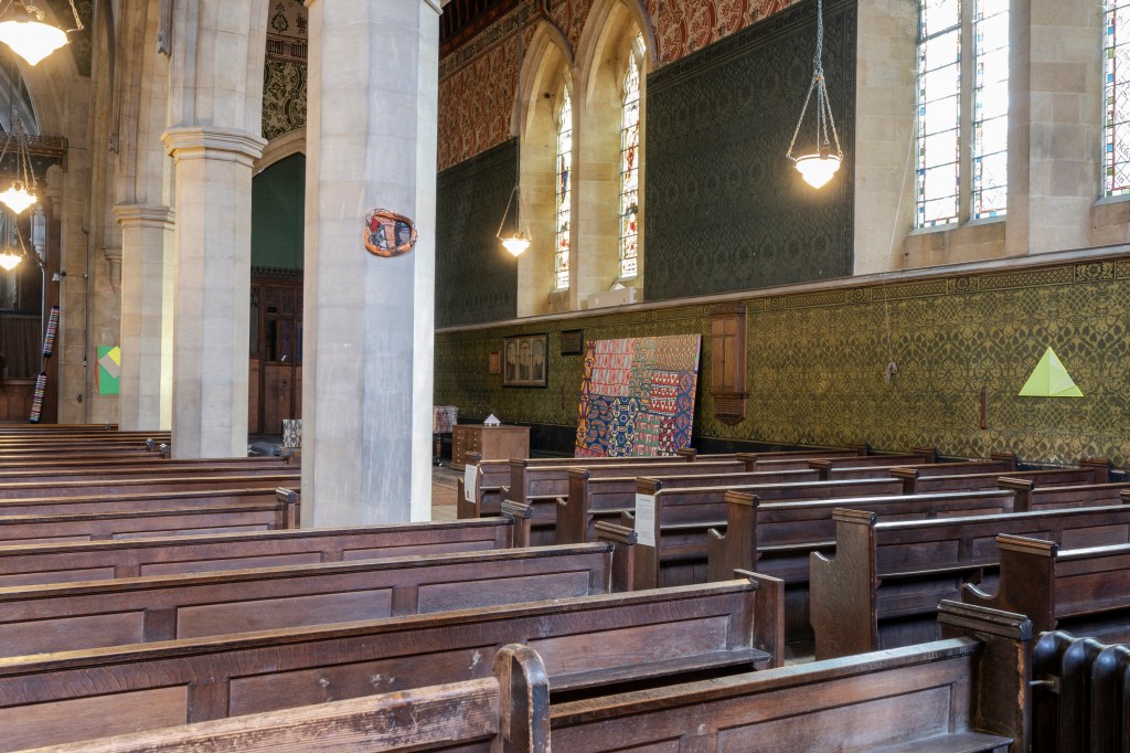 New works made for the exhibition include paintings by Melania Toma and Imogen Wetherell. A woven frontal by Cecilia Charlton, a tufted pew cushion by Sophie Giller, in a design echoing the red pomegranate wall painting. And a piano quilt also by Giller, a piece that is representative of All Saints’ modern incarnation as a cultural space for concerts.