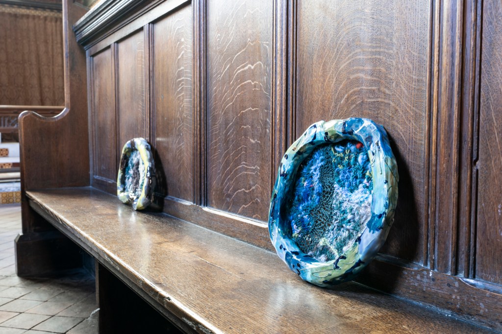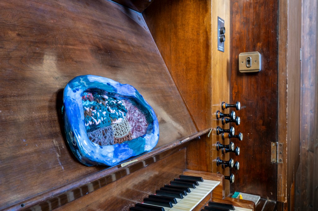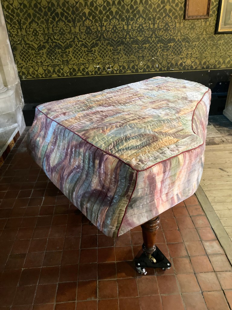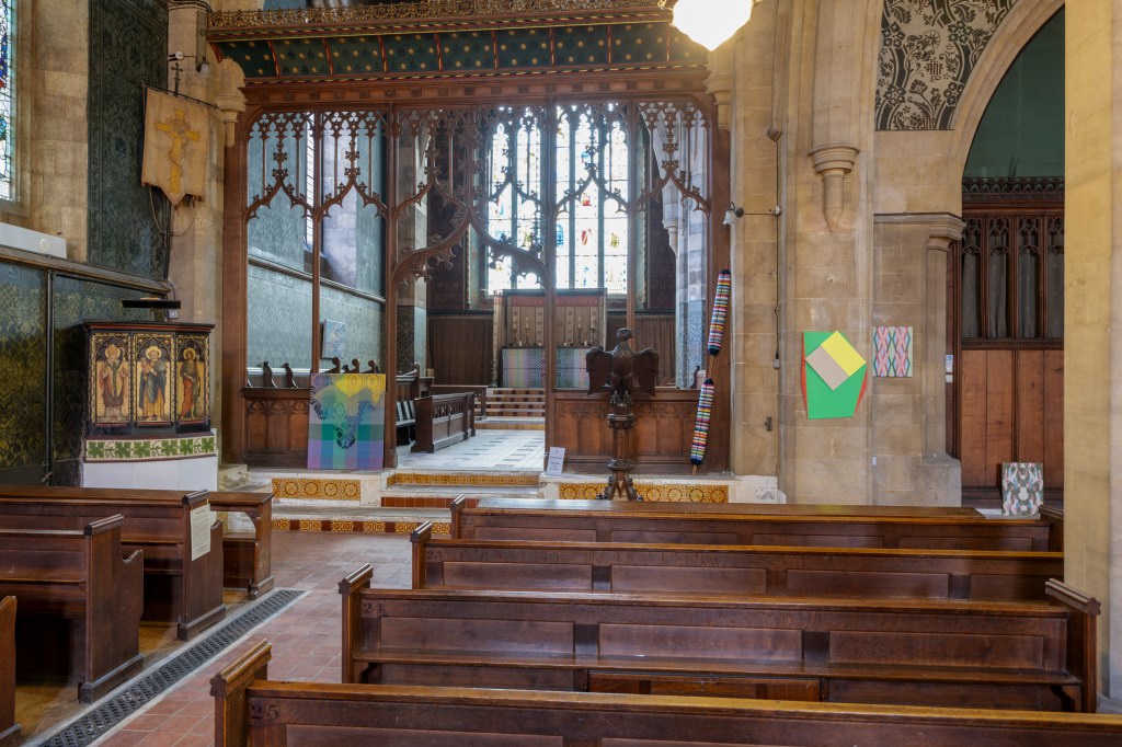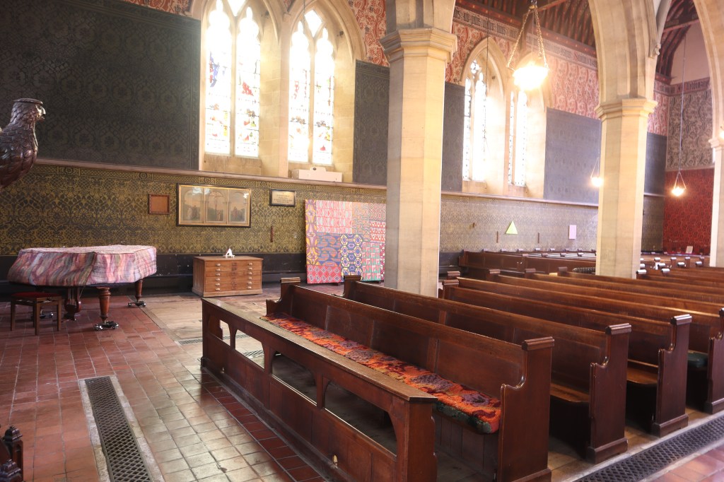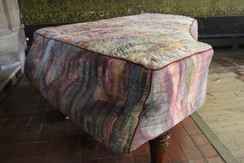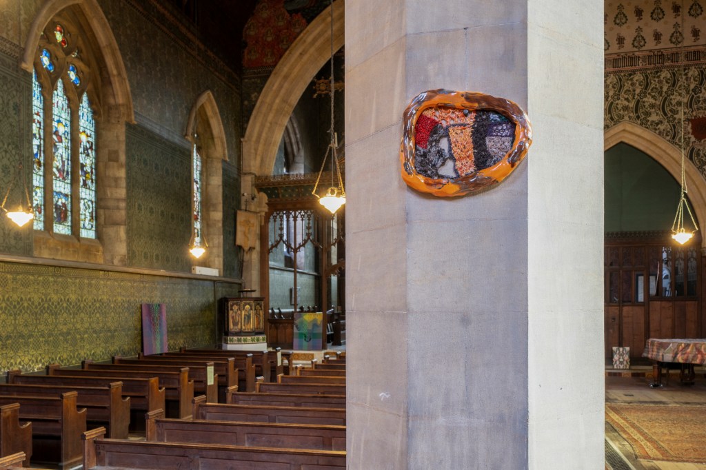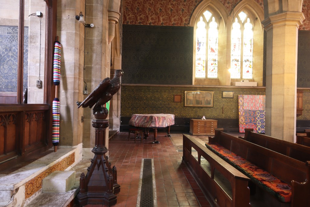 New works made for the exhibition include paintings by Melania Toma and Imogen Wetherell. A woven frontal by Cecilia Charlton, a tufted pew cushion by Sophie Giller, in a design echoing the red pomegranate wall painting. And a piano quilt also by Giller, a piece that is representative of All Saints’ modern incarnation as a cultural space for concerts.