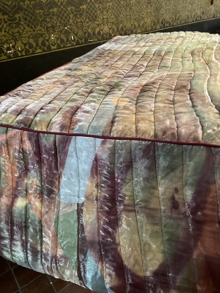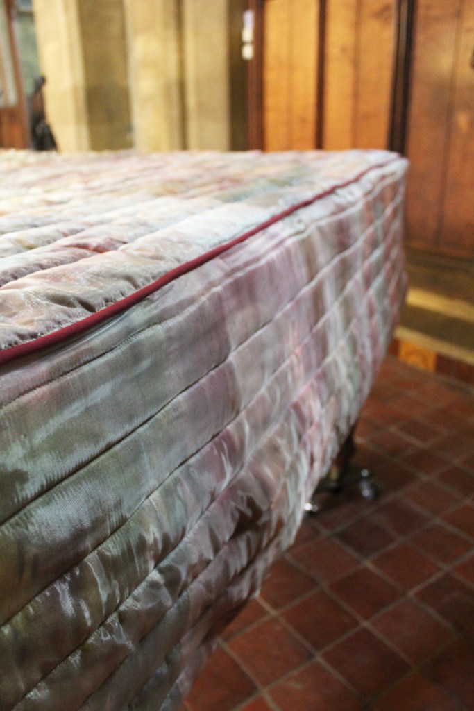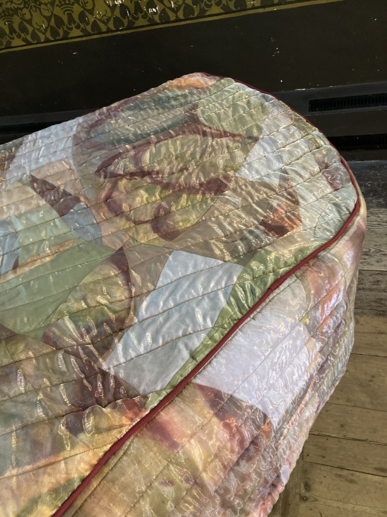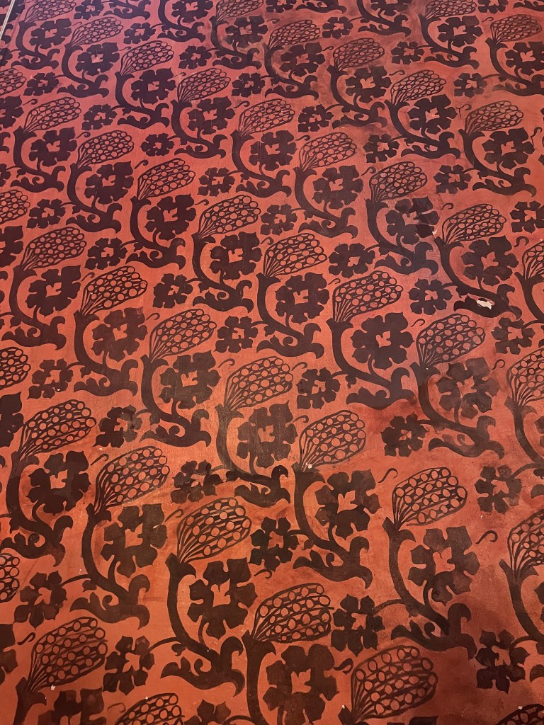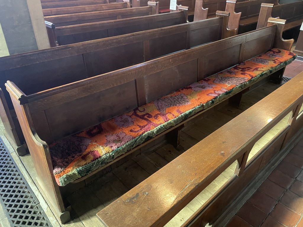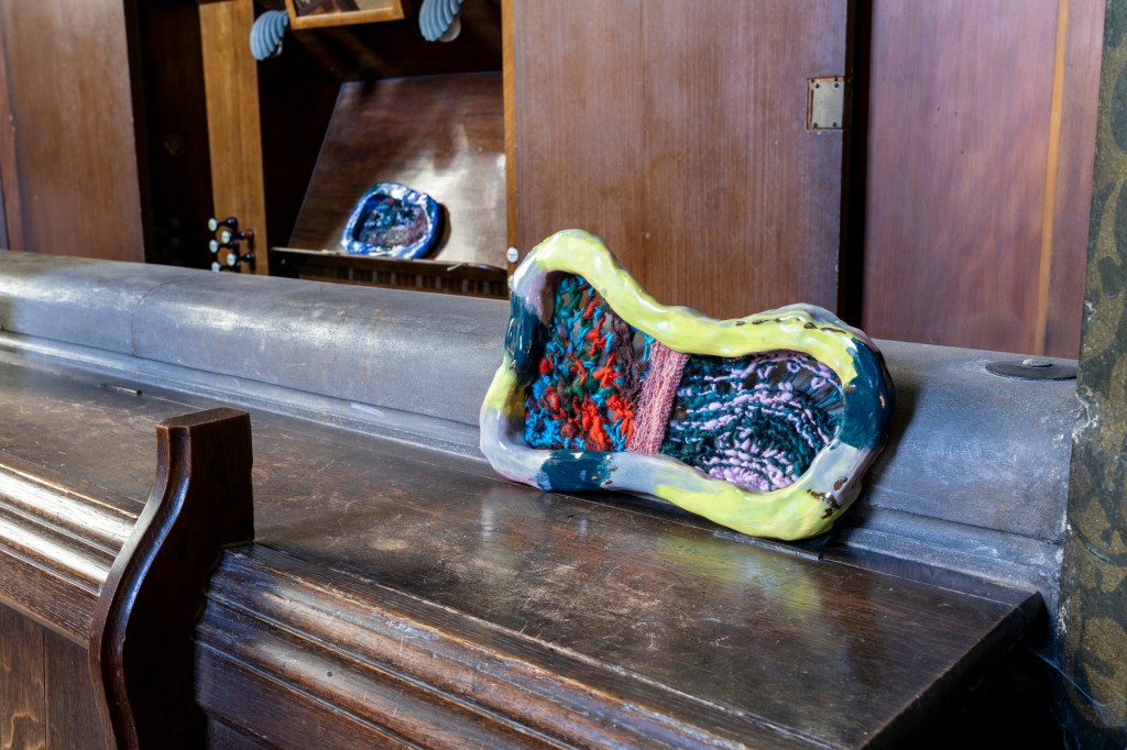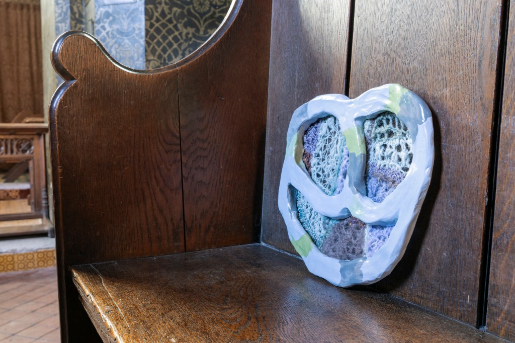 New works made for the exhibition include paintings by Melania Toma and Imogen Wetherell. A woven frontal by Cecilia Charlton, a tufted pew cushion by Sophie Giller, in a design echoing the red pomegranate wall painting. And a piano quilt also by Giller, a piece that is representative of All Saints’ modern incarnation as a cultural space for concerts.