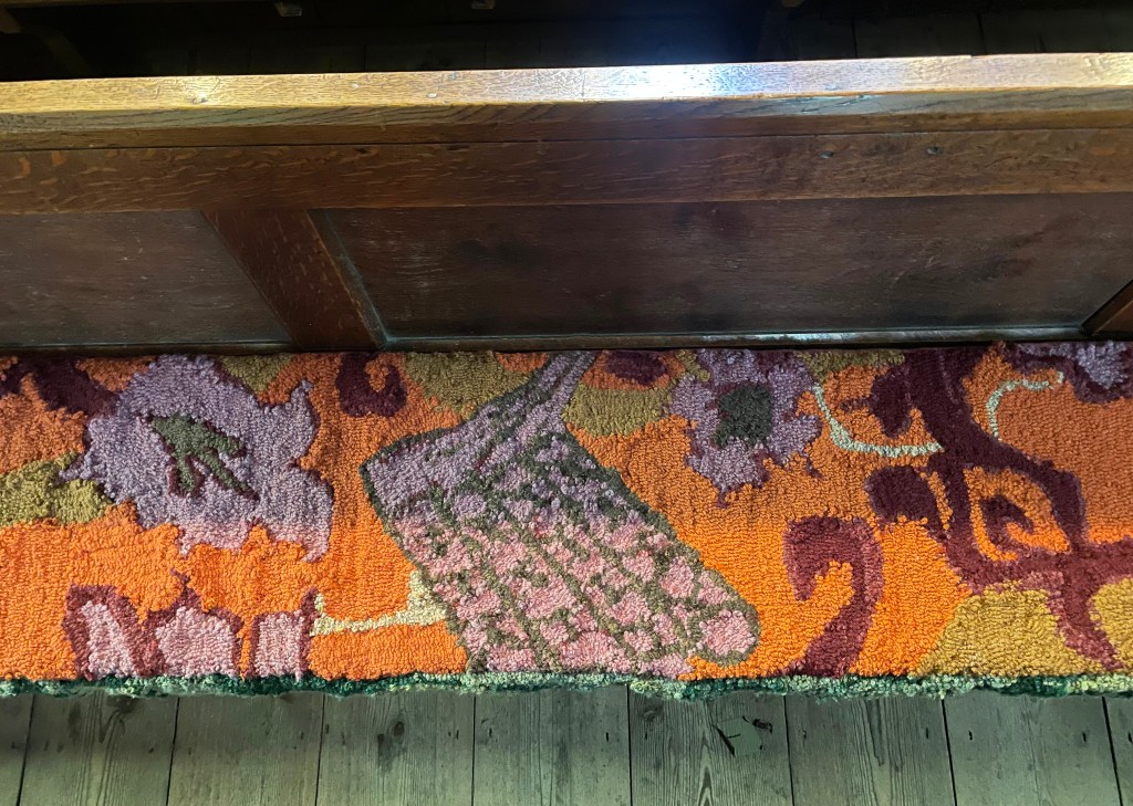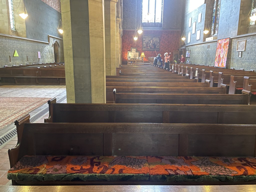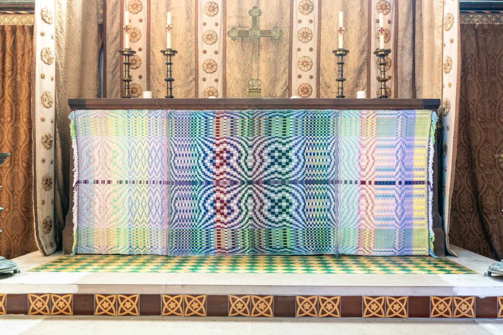 This piece brings together painting, sculpture, textiles, ‘applied arts’ to furniture, functionality, also inspired by the arts and crafts movement, which influenced the interior of the church.