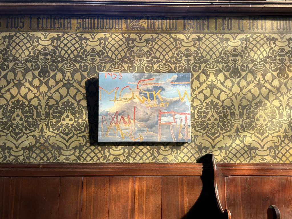 Art selected include a painting and studies by Ralph Anderson that echo the graffiti carved into the wood of the Church’s organ, speculated to be by the Choir boys. Dominic Beattie’s ‘window paintings’ inspired by stained glass and Will Cruickshank’s pieces that reflect the devotional craftsmanship of the church’s original artists.