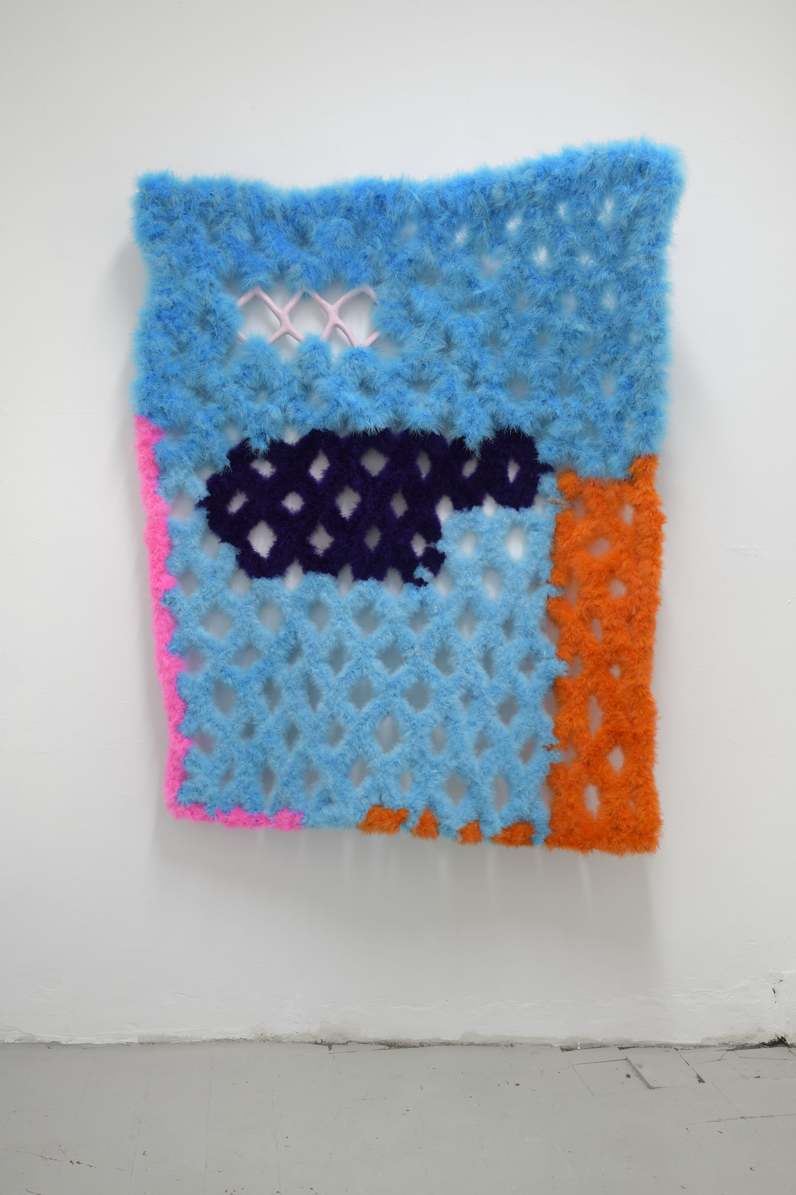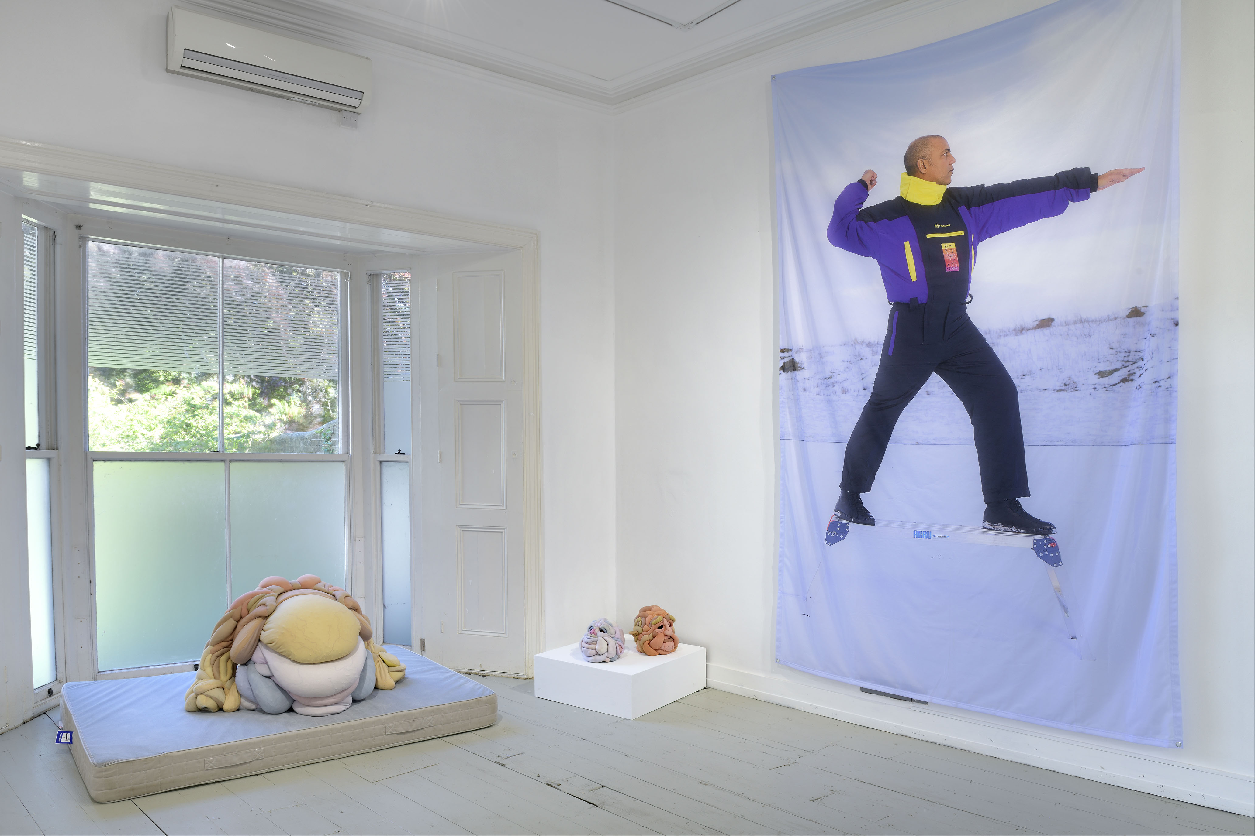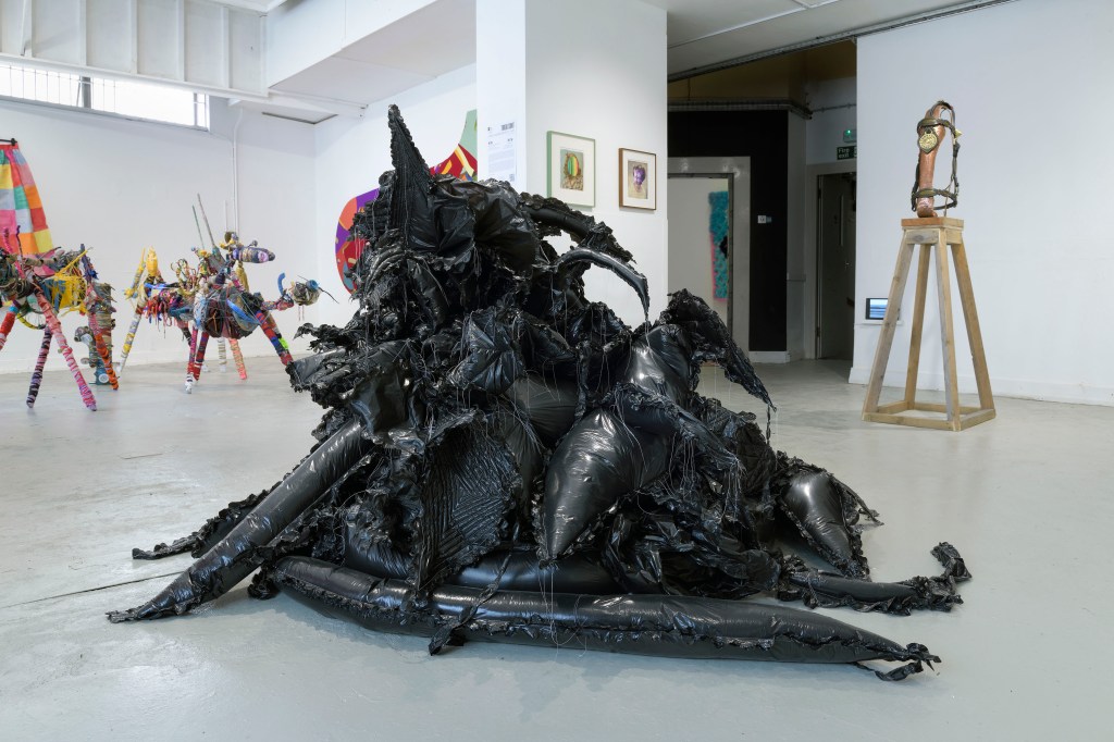 Who is she, Challen, wool & nylon blankets, thread, wood, work pictured in centre, Andrew Omoding, and left centre Mikey Cuddihy & far left Freddie Robins. Below install shots of the group exhibition all by Doug Atfield.