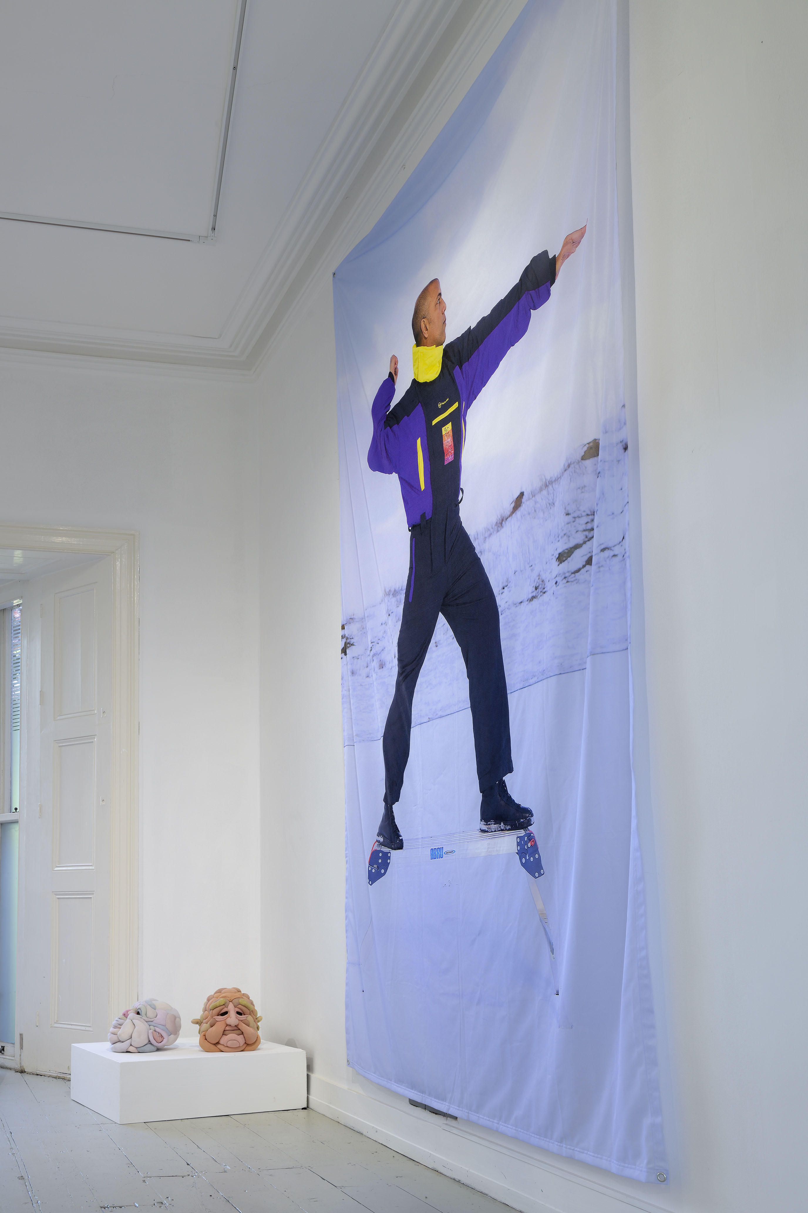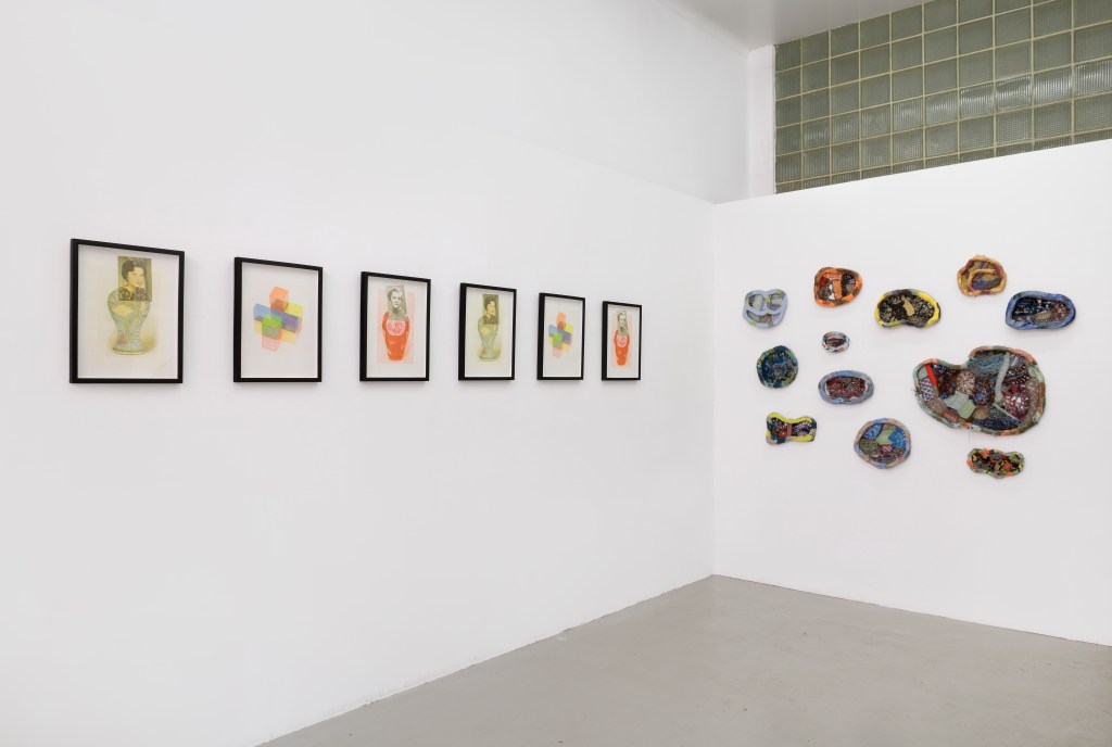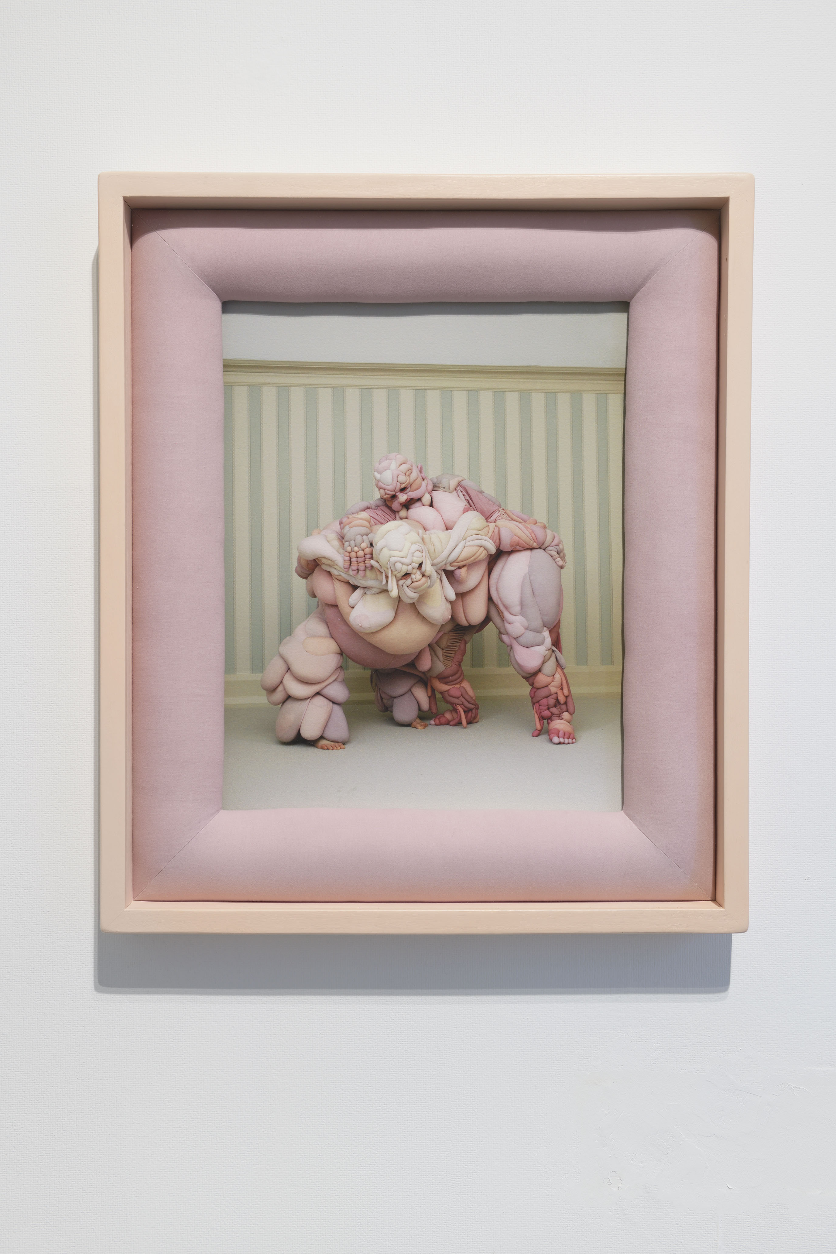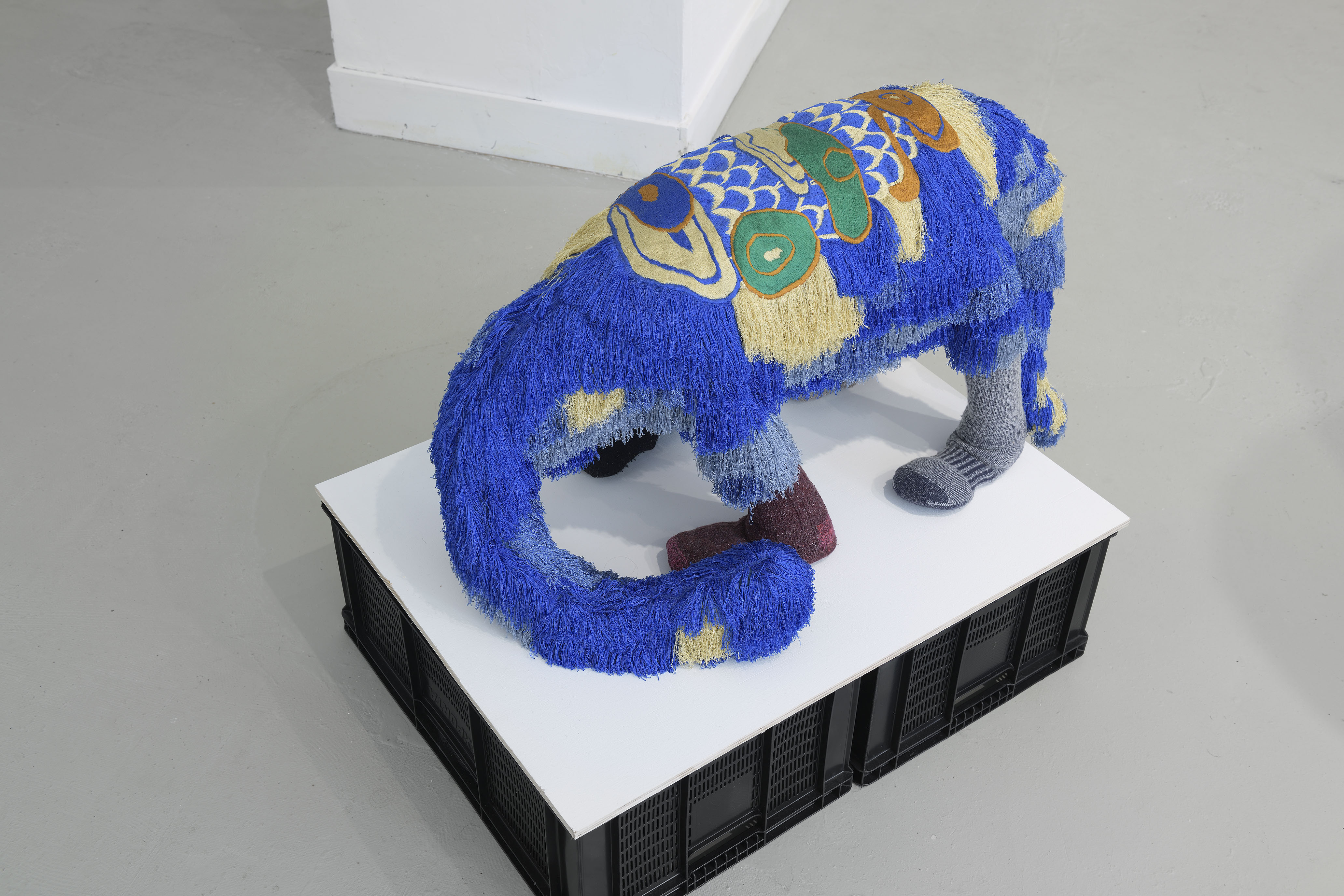 Who is she, Challen, wool & nylon blankets, thread, wood, work pictured in centre, Andrew Omoding, and left centre Mikey Cuddihy & far left Freddie Robins. Below install shots of the group exhibition all by Doug Atfield.